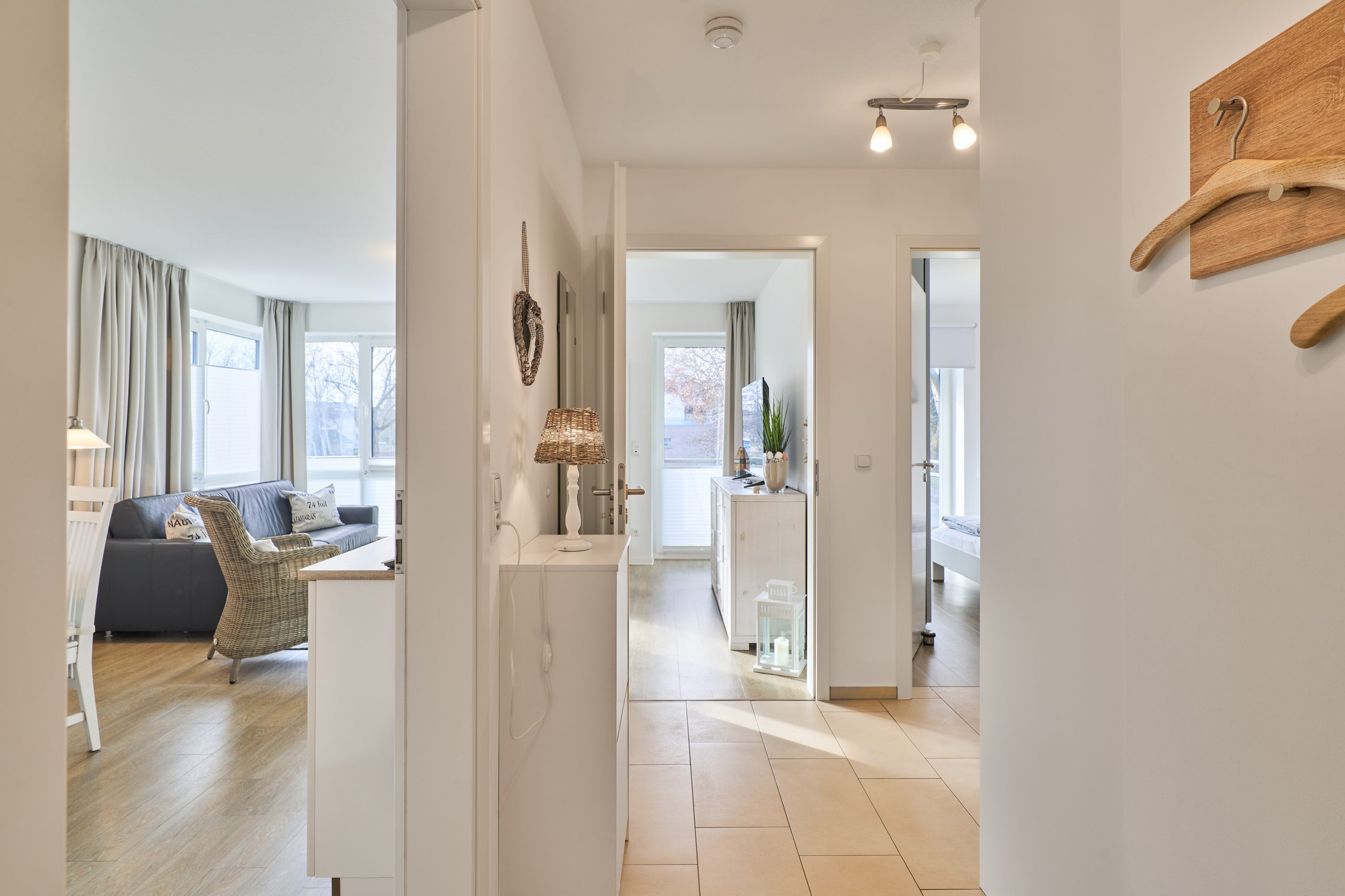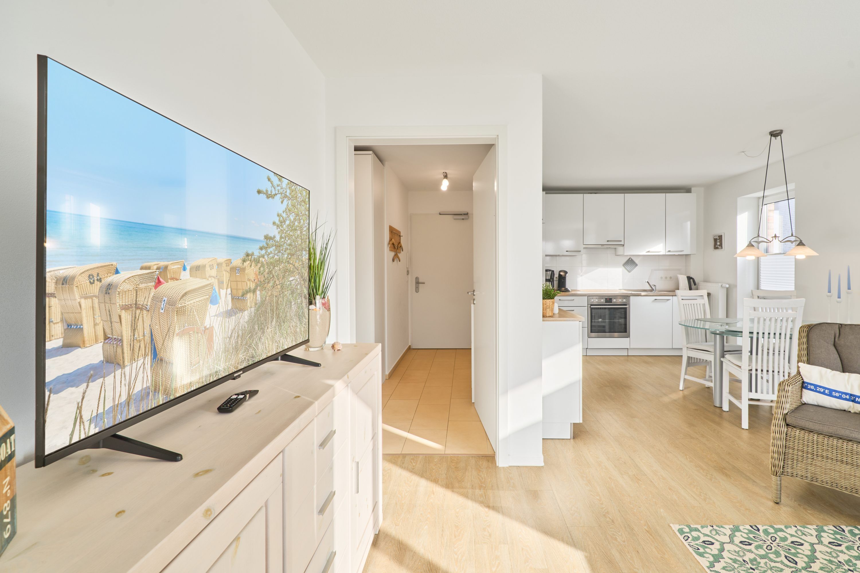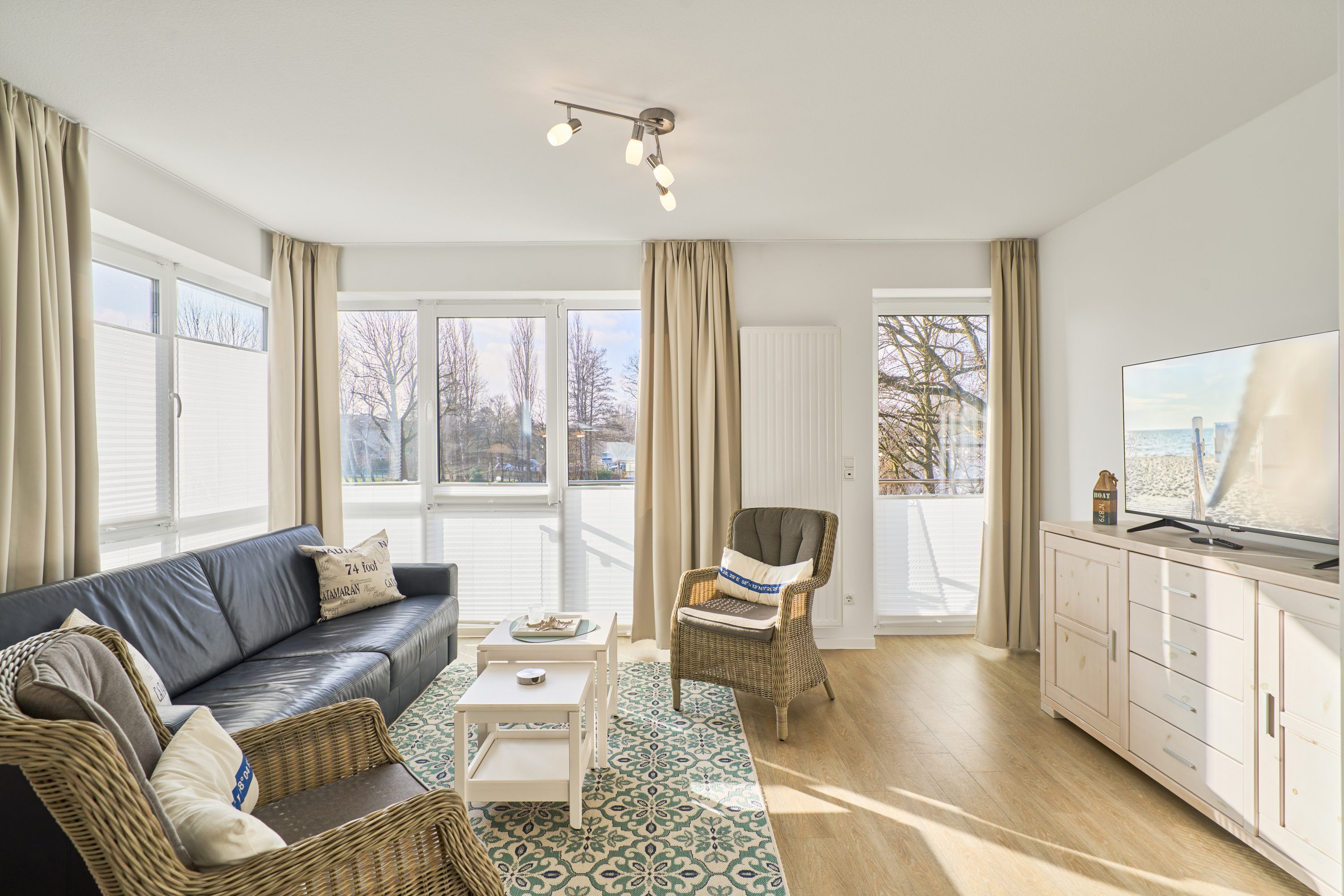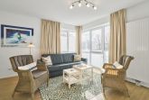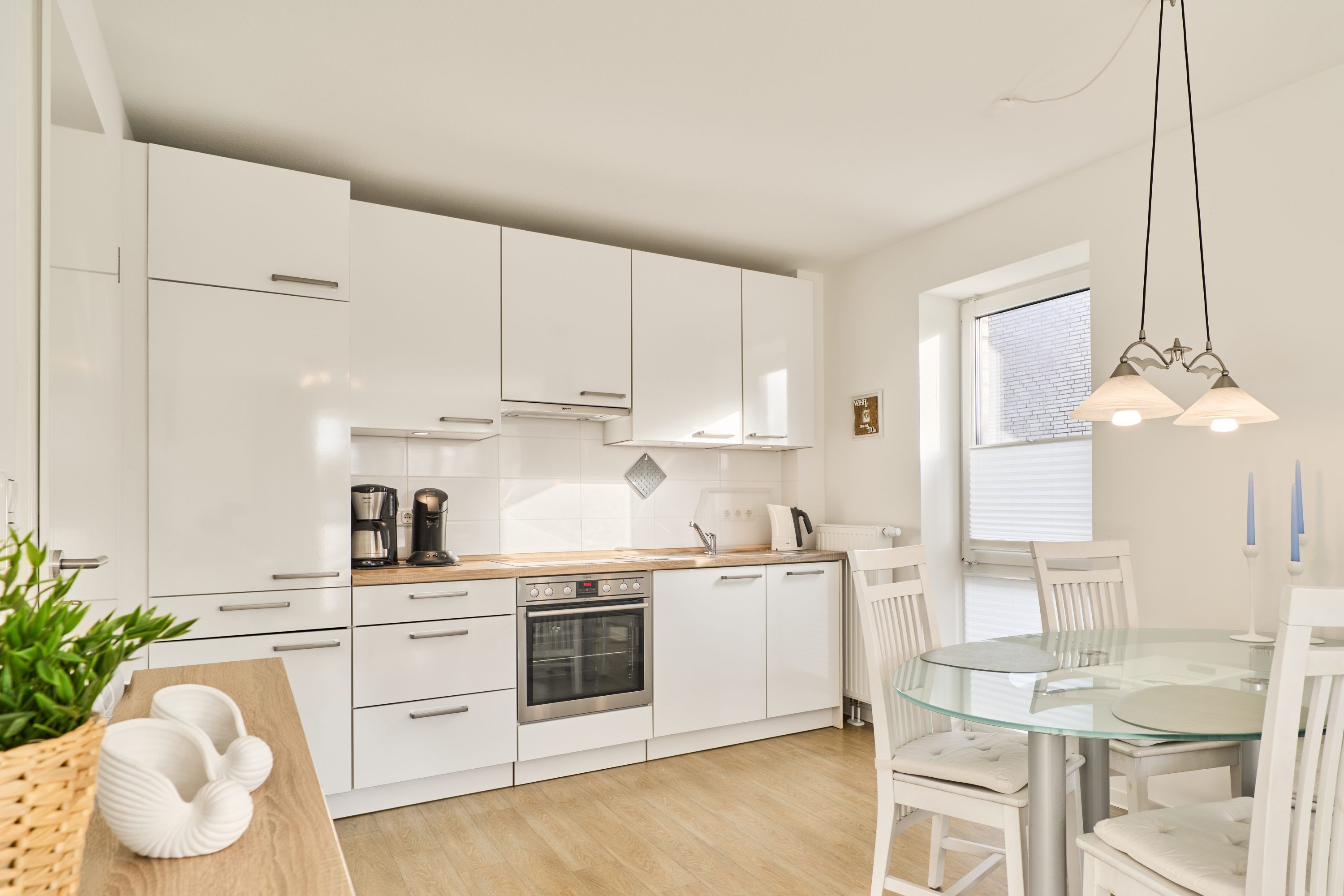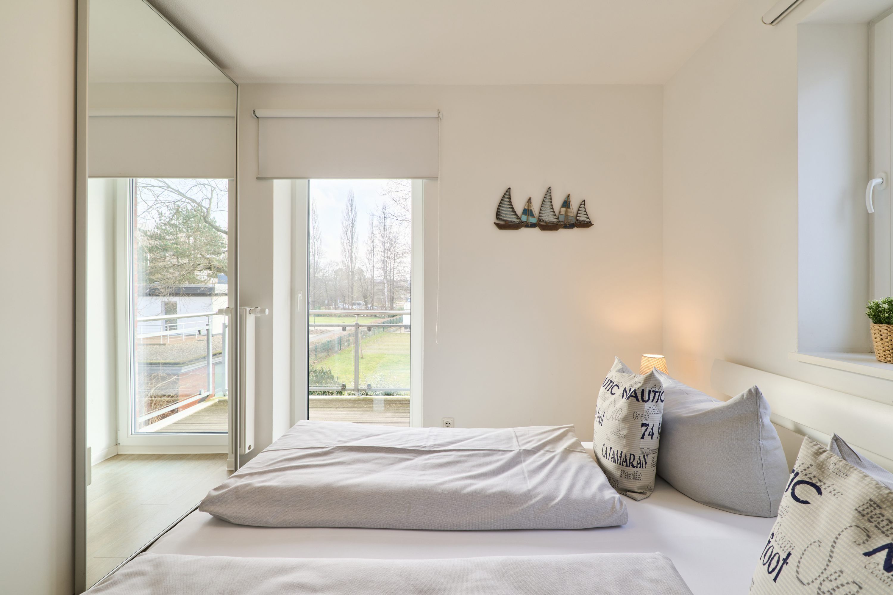 Die Ferienwohnung verzaubert mit ihrem, im maritimen Stil gehaltenen, Wohnzimmer und ist mit hochwertigen Möbeln eingerichtet. Es erwarten Sie dort eine bequeme Couch, 2 Sessel und ein Sat-Flachbildschirmfernseher. Die moderne, offene Küche ist voll ausgestattet und perfekt in den Wohnraum integriert. Ihnen stehen eine Filterkaffeemaschine, eine Senseo-Kaffeepadmaschine, ein Wasserkocher sowie ein Toaster zur Verfügung. Zudem verfügt die Küche über ein Cerankochfeld, einen Backofen und einen Geschirrspüler. Der Essbereich bietet ausreichend Platz für ein ausgiebiges Frühstück oder einen gemütlichen Spieleabend. Das helle Schlafzimmer ist mit einem Doppelbett (1,80 × 2,00 m) und einem großen Kleiderschrank ausgestattet und hat direkten Zugang zu dem Balkon.