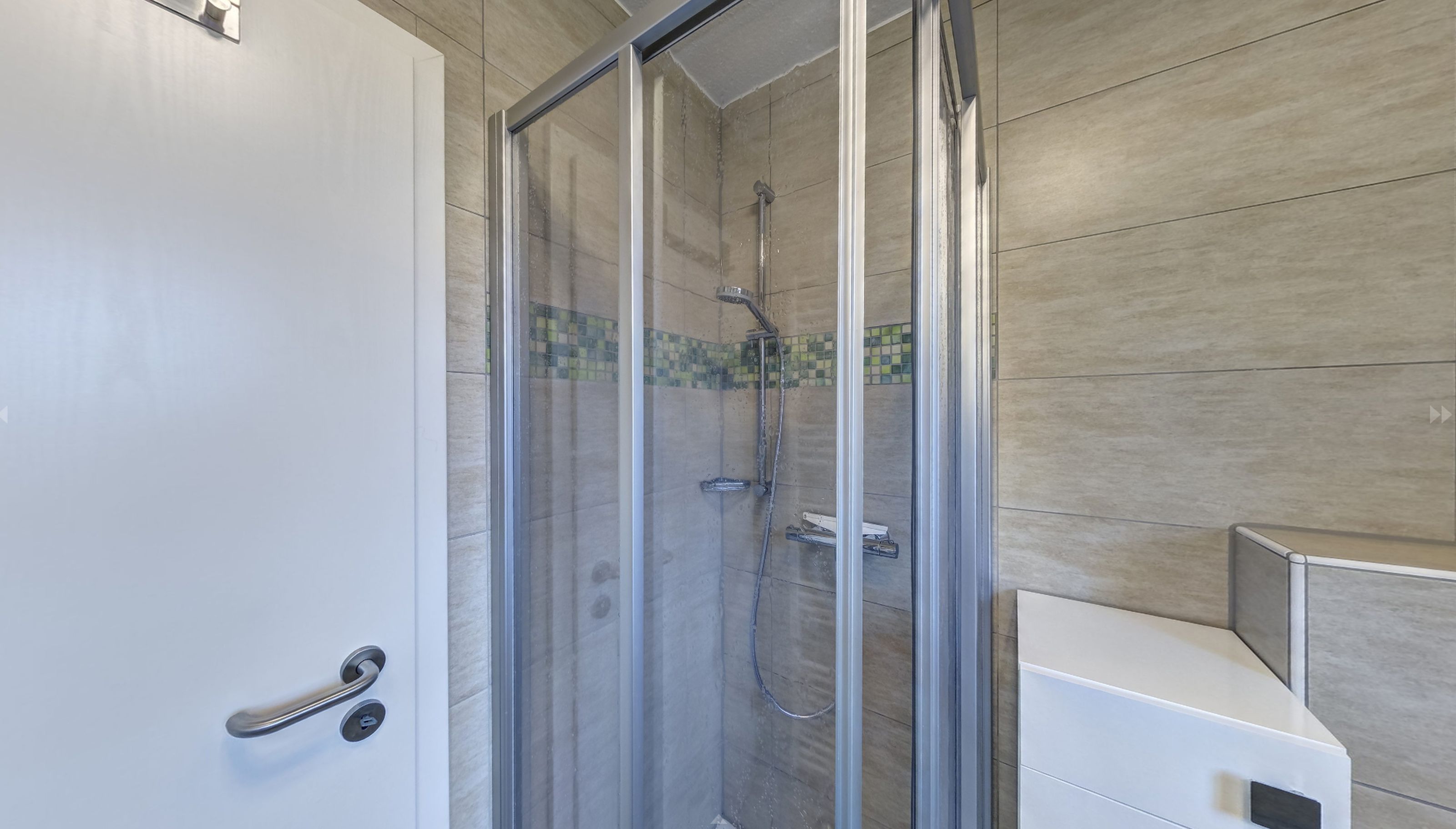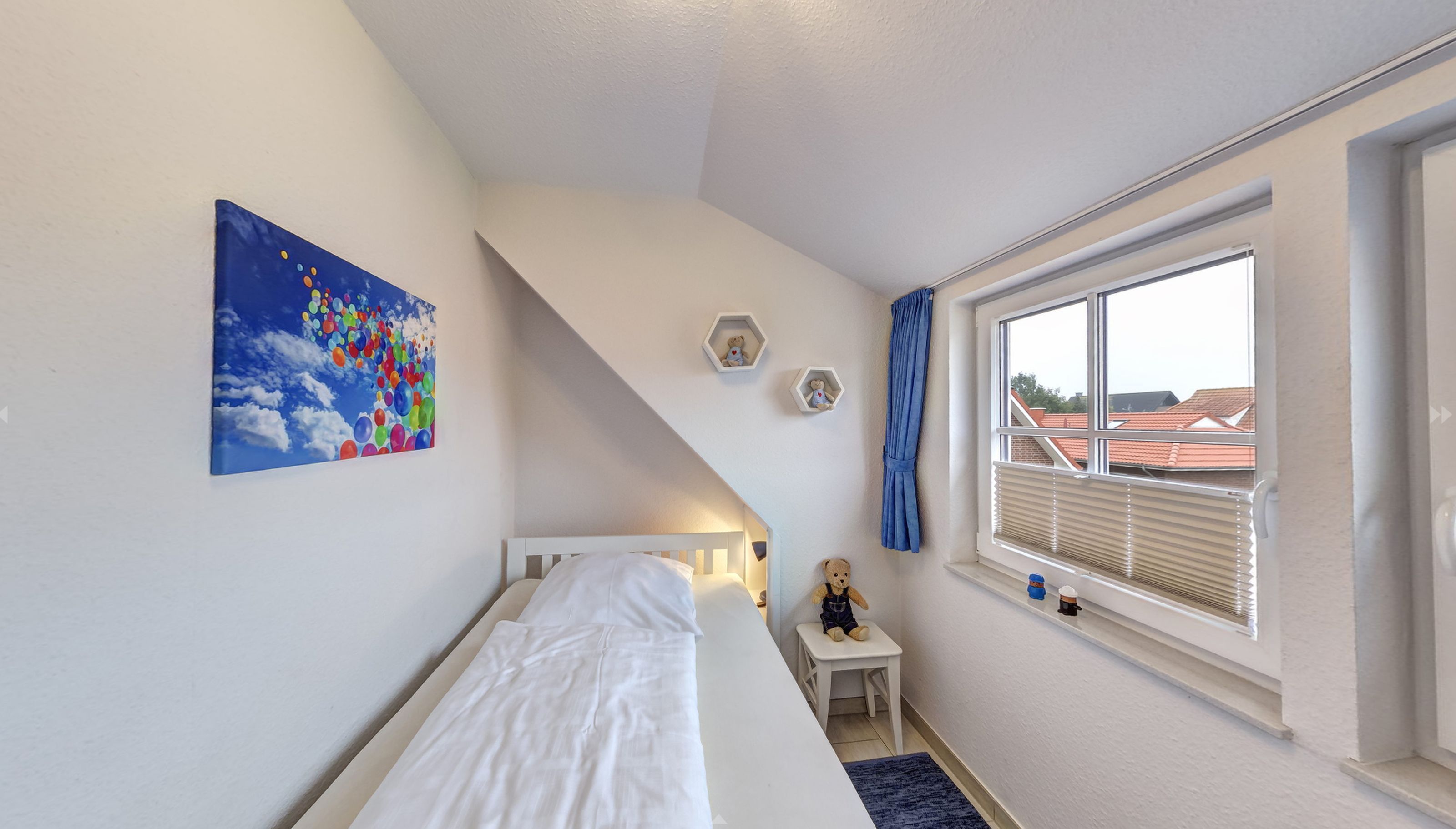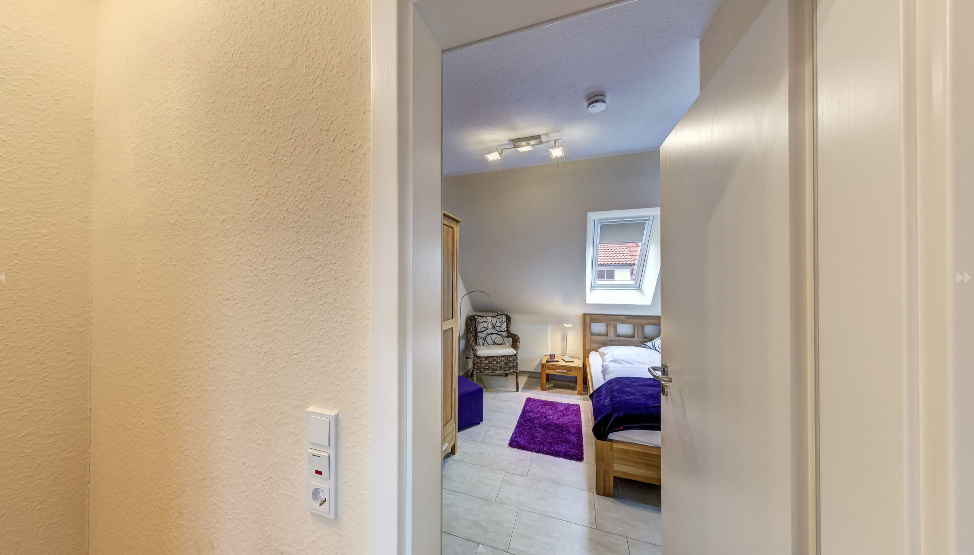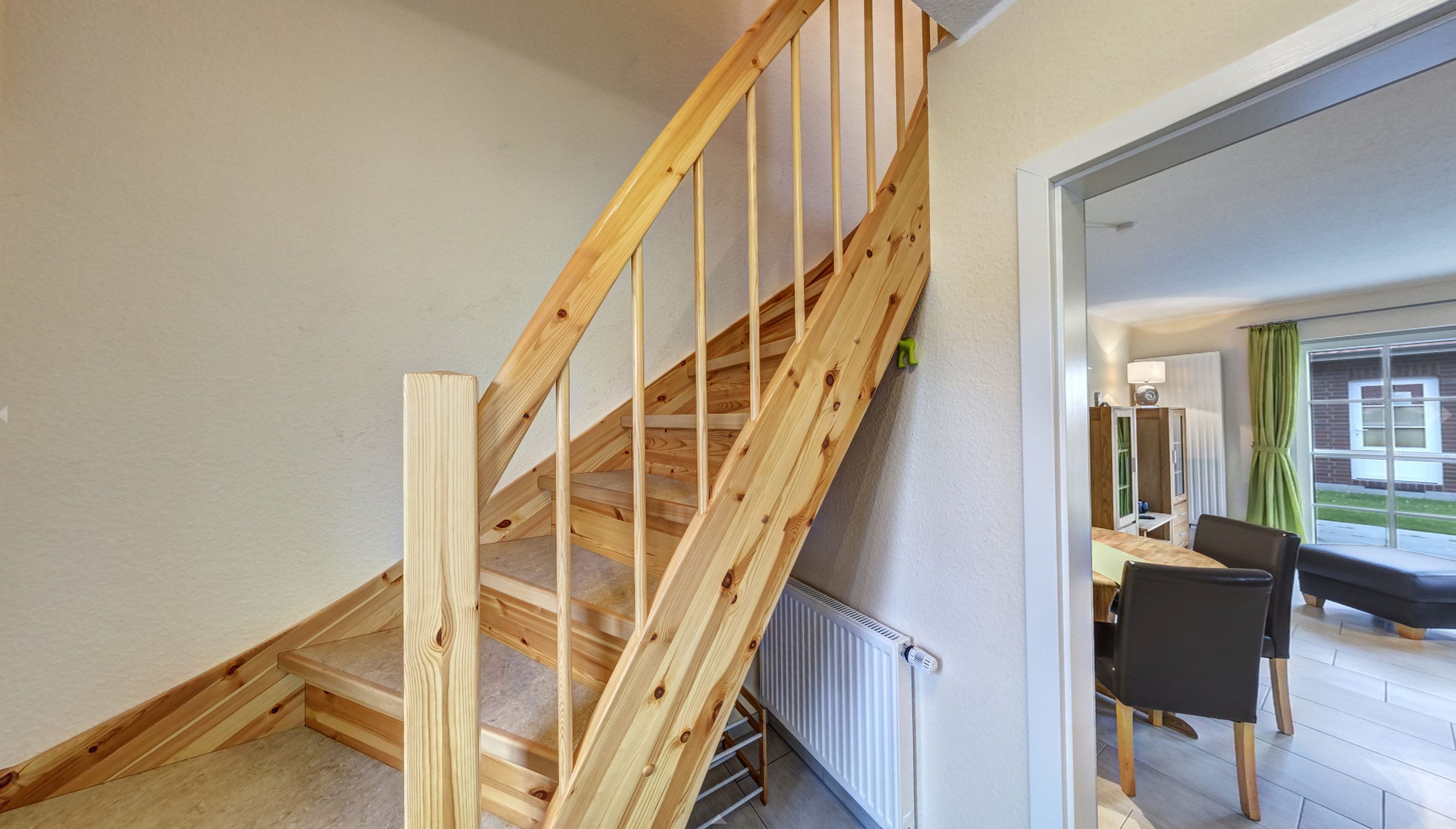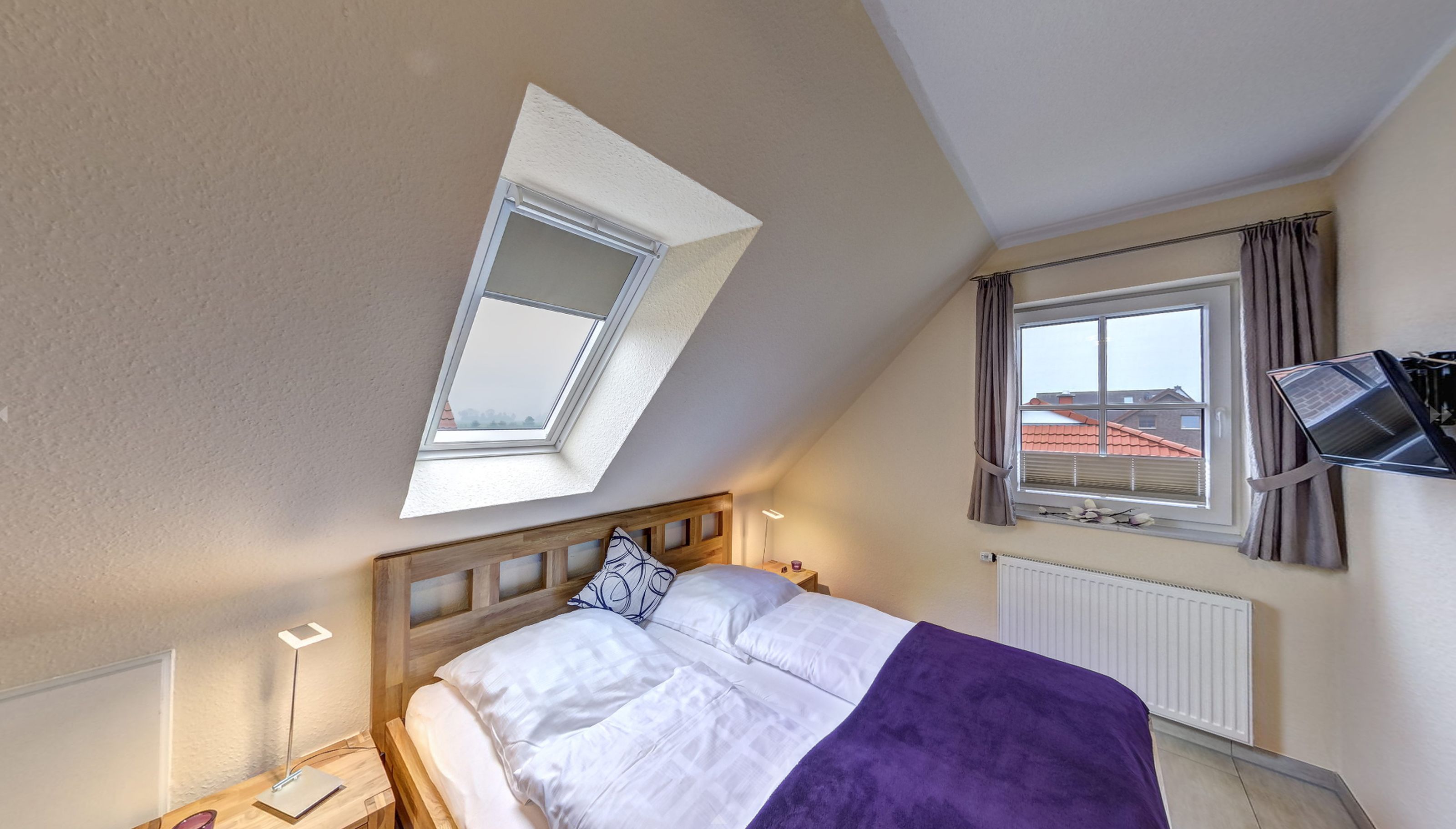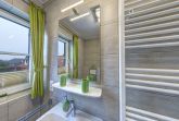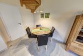 Das Obergeschoss der Doppelhaushälfte erreichen Sie über eine Holztreppe. Hier befindet sich ein Schlafzimmer mit Doppelbett und ein weiteres Schlafzimmer mit einem oder zwei Einzelbetten. Ein zweites Badezimmer mit Dusche und WC finden sie ebenfalls hier.