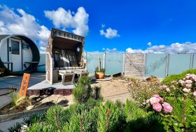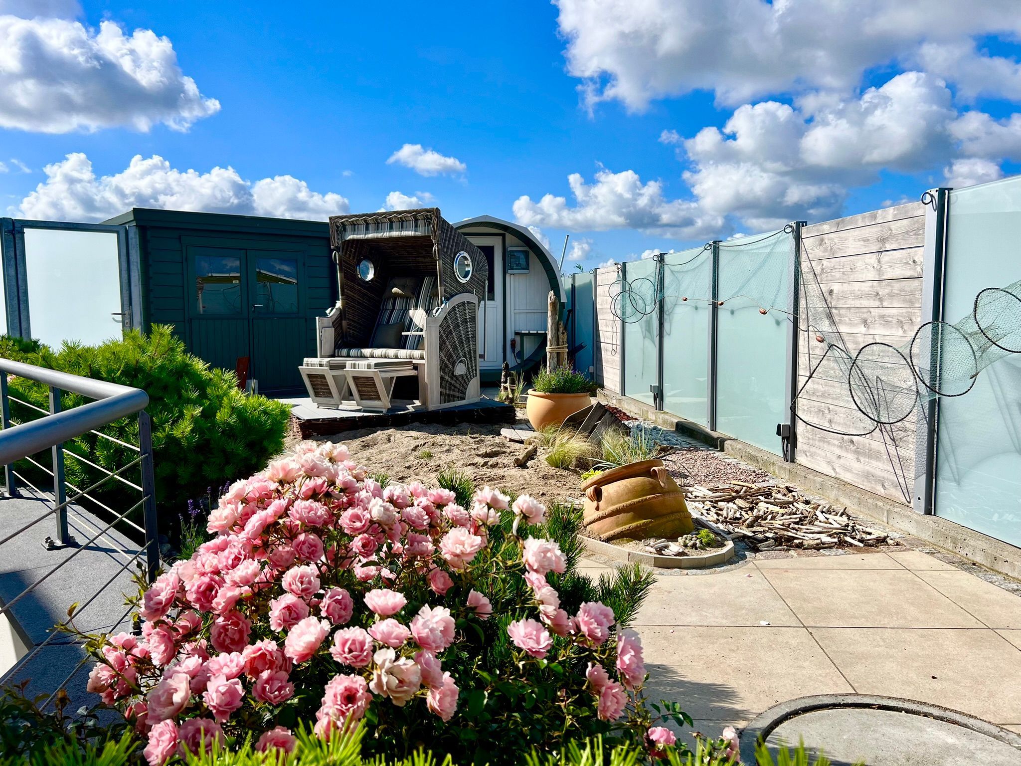 Für erholsame Stunden im Freien steht Ihnen der gemeinschaftliche Garten zur Verfügung. Hier können Sie im Strandkorb die Sonne genießen oder in der Sauna neue Energie tanken. Diese Außenbereiche teilen Sie sich harmonisch mit den Gästen der zweiten Wohnung im Haus.