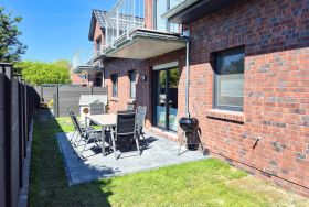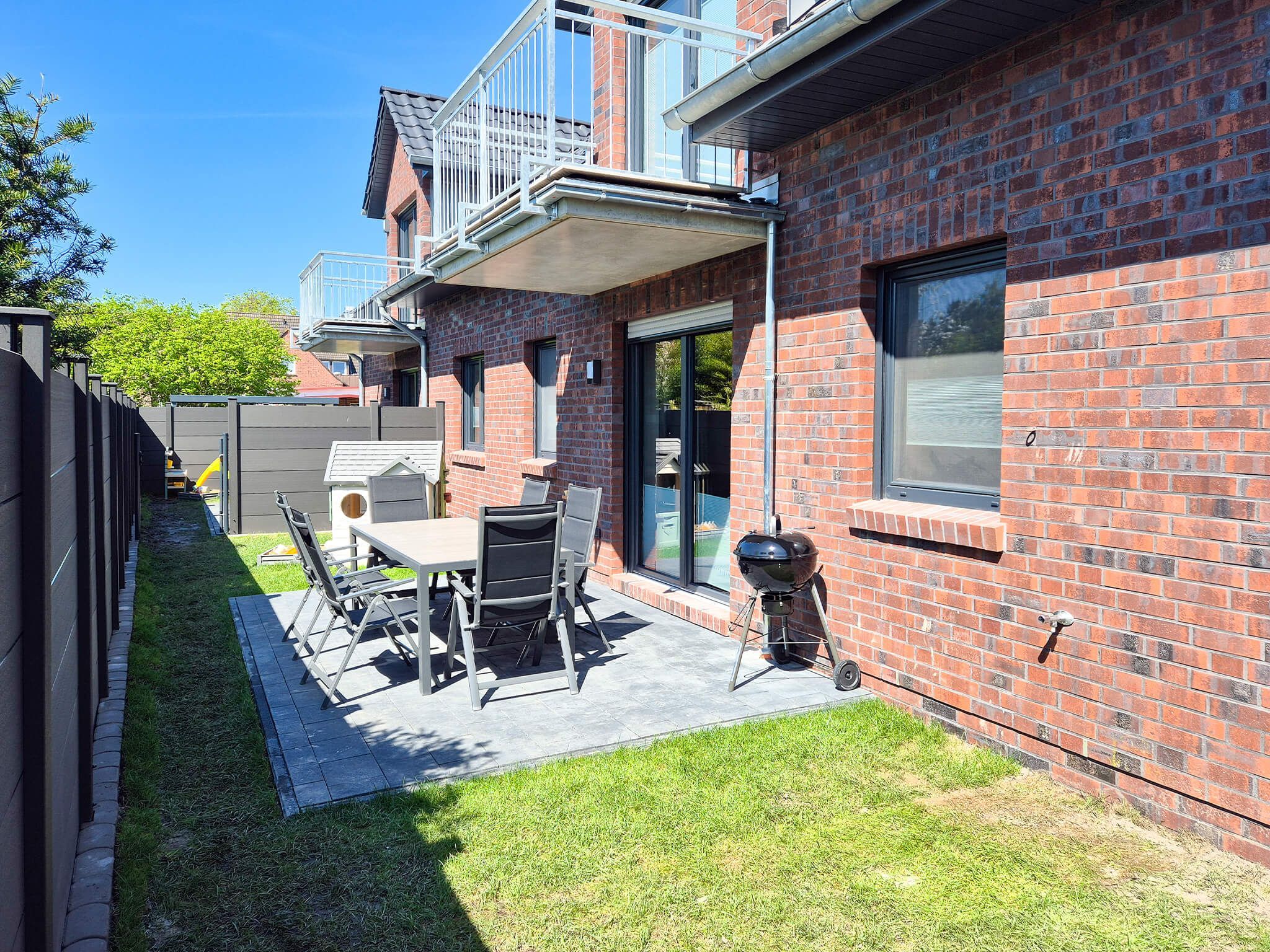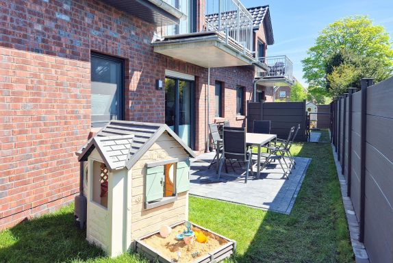Im eigenen Garten, der komplett eingezäunt ist (Hunde können frei laufen), ist neben einem tollen Sandkasten für Kinder auch eine einladende Terrasse mit Holzkohlegrill zu finden.