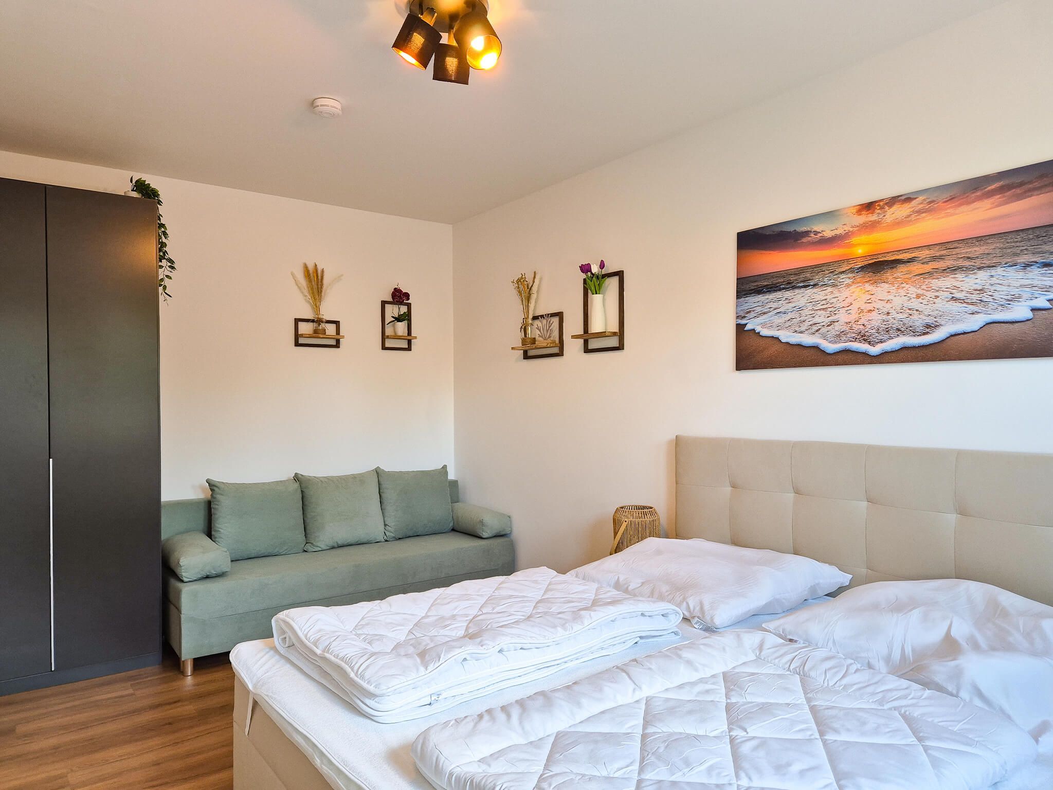 • Schlafzimmer 1: Doppelbett 180x200 cm (Boxspring) + Schlafsofa (z. B. für 1-2 Kinder)