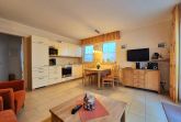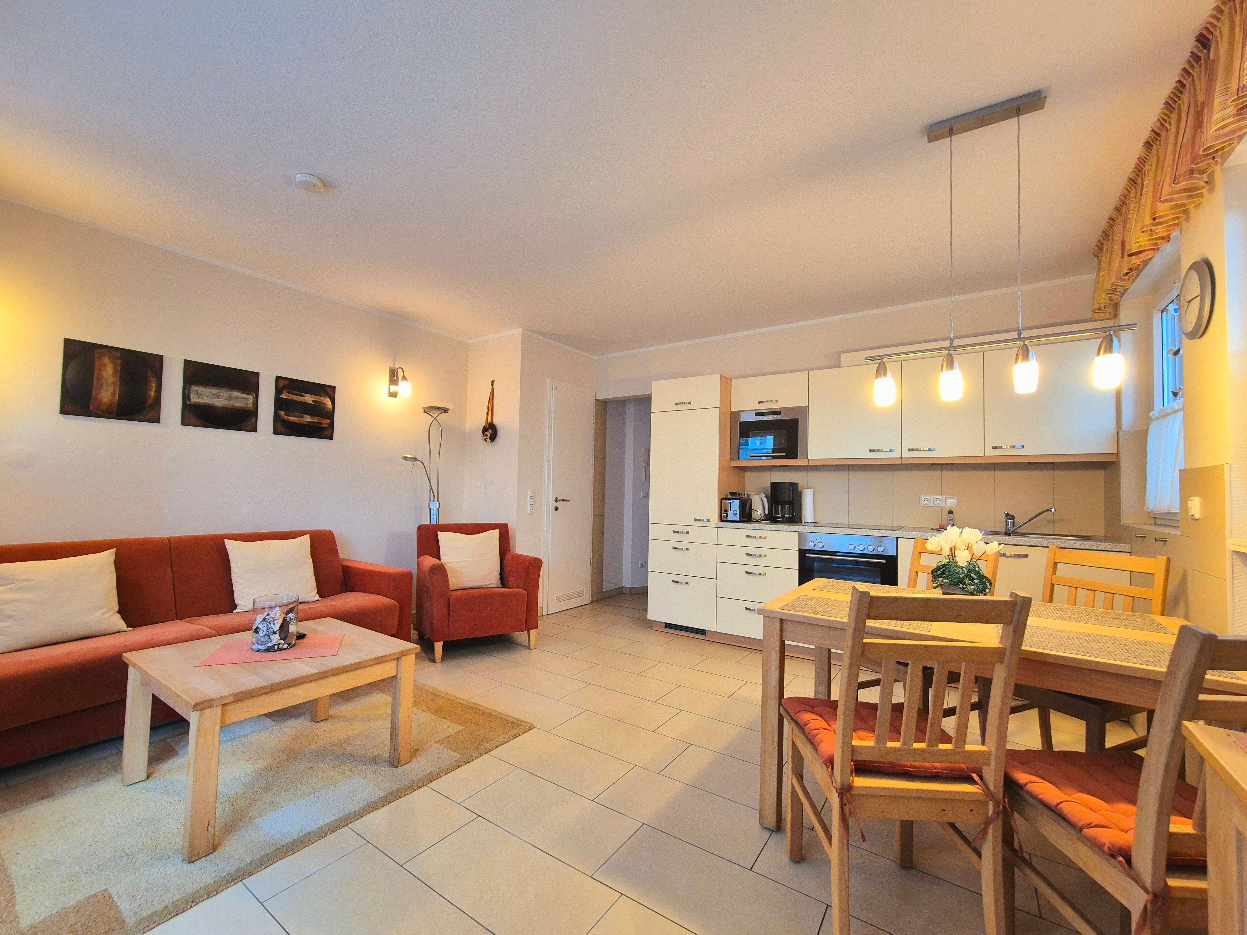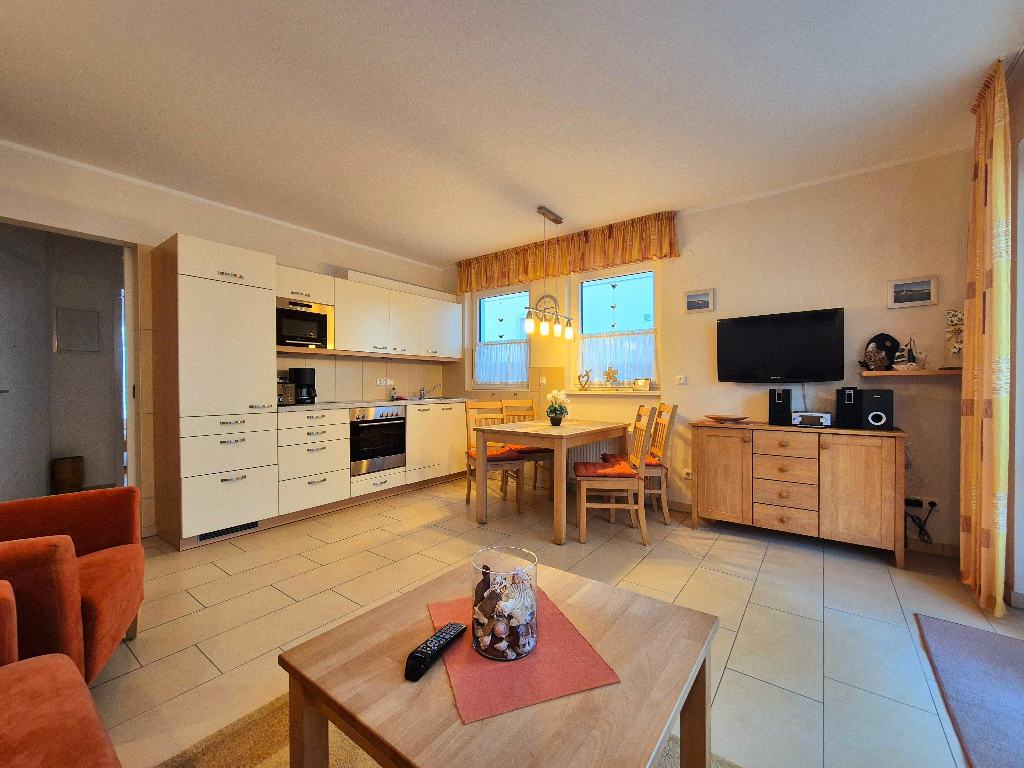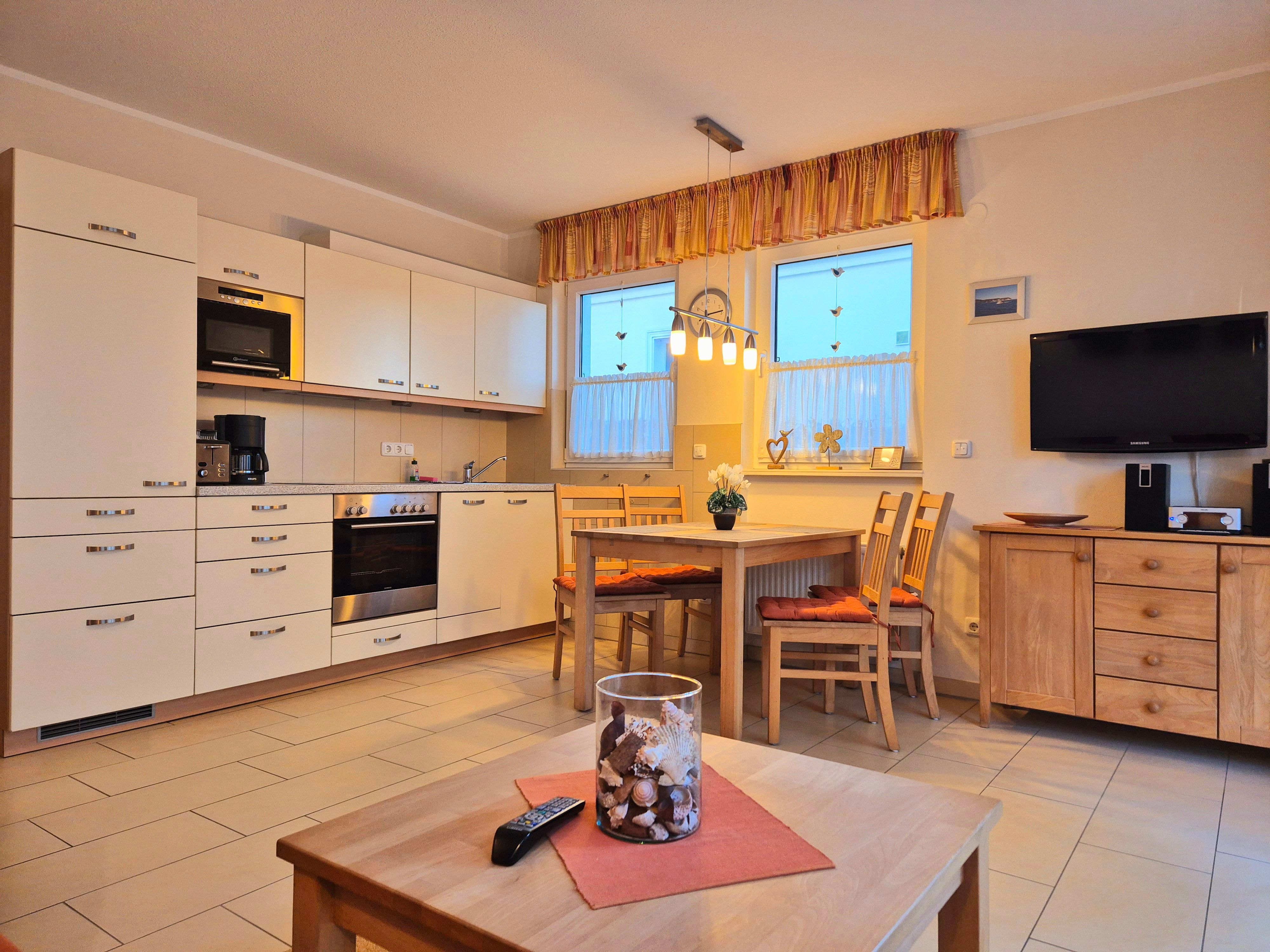 Der Wohnbereich ist mit einer gemütlichen Schlafcouch und einem Flachbild TV ausgestattet. Die offene Wohnküche mit Essbereich ist ausgestattet mit einem 4 Felder Ceranherd mit Backofen, Spülmaschine, Mikrowelle, Kühlschrank mit Gefrierfach, Kaffeemaschone, Toaster und reichlich Küchenutensilien lässt Sie keinen Wunsch offen.
