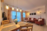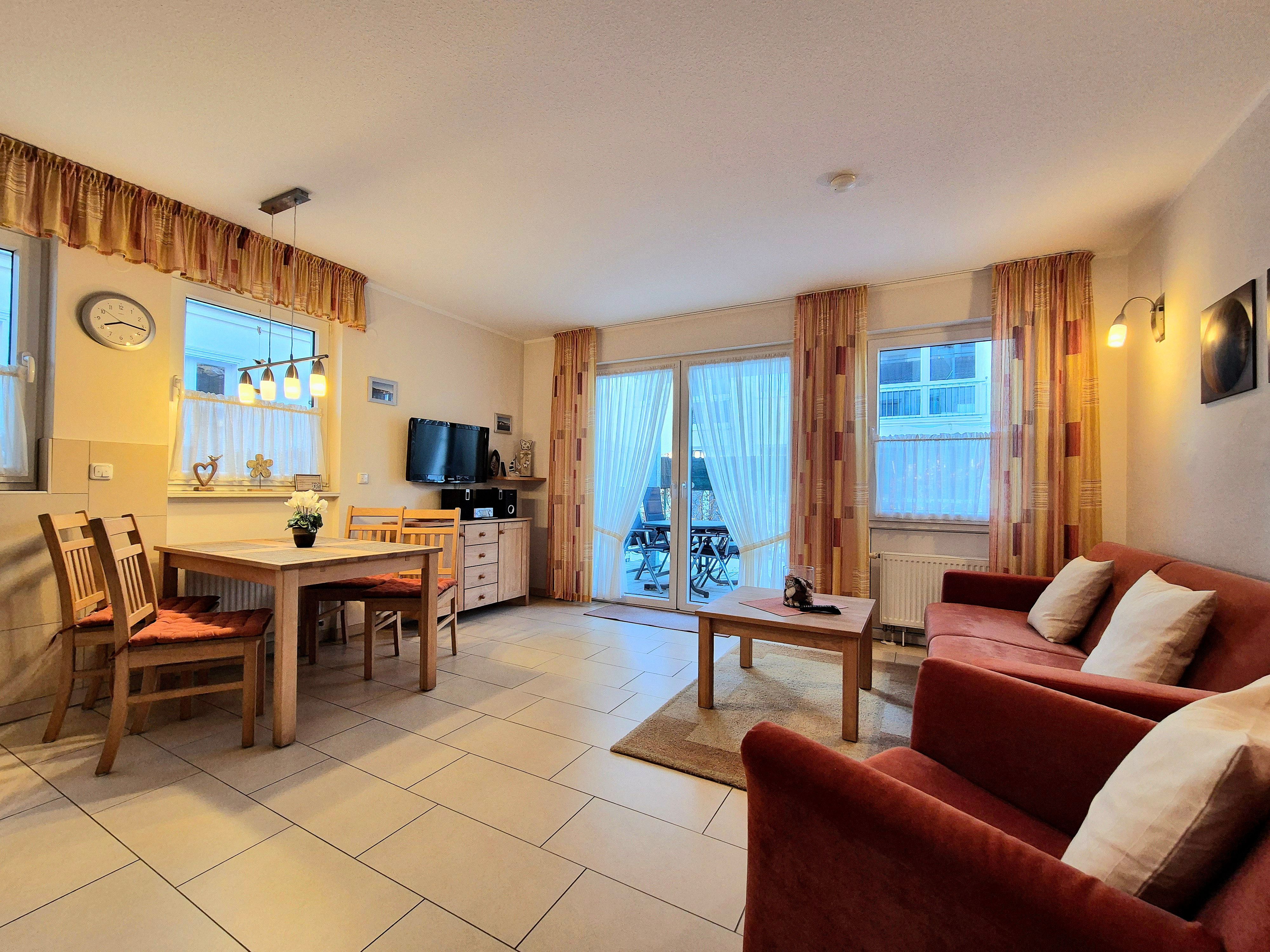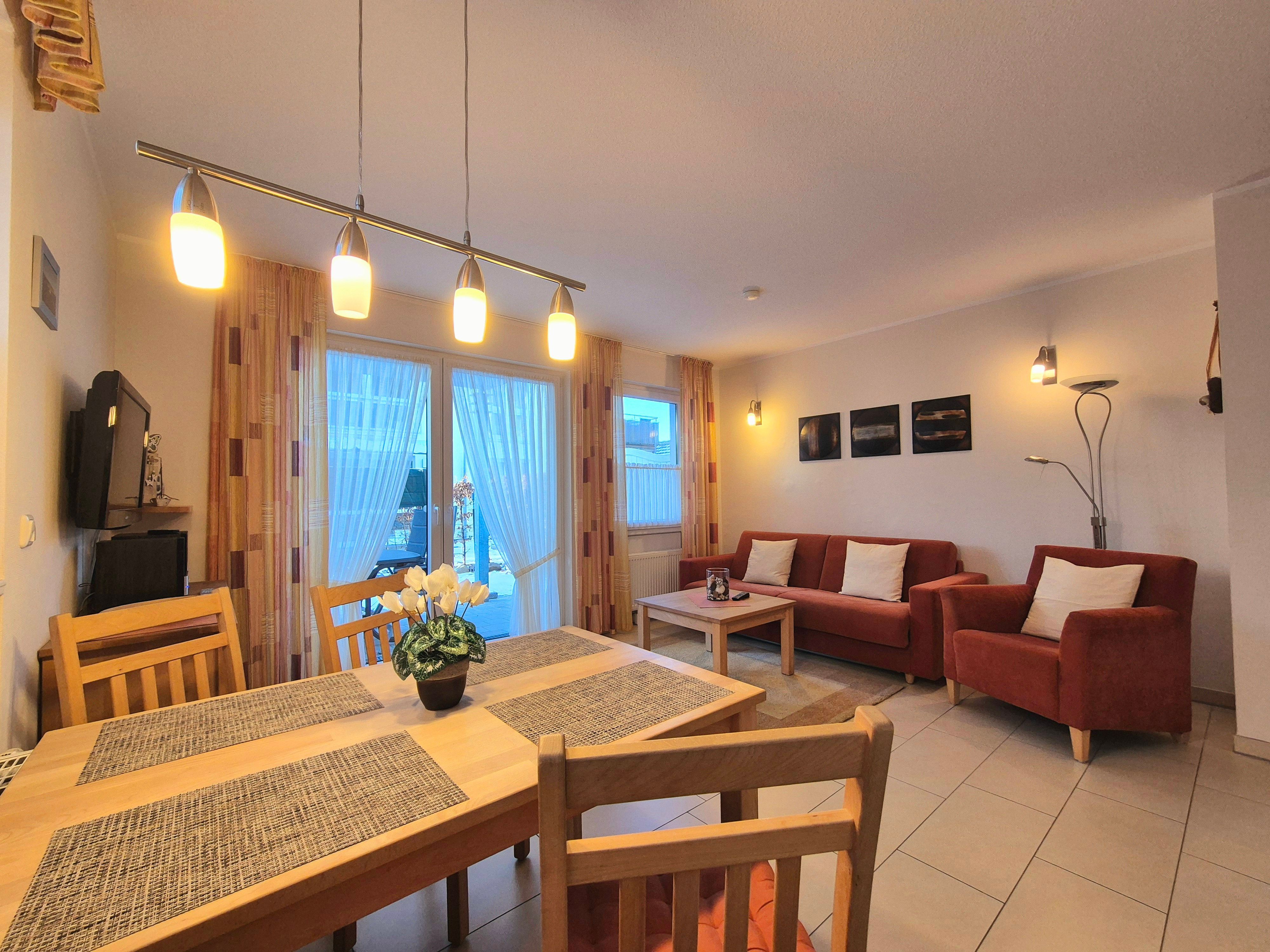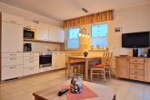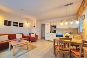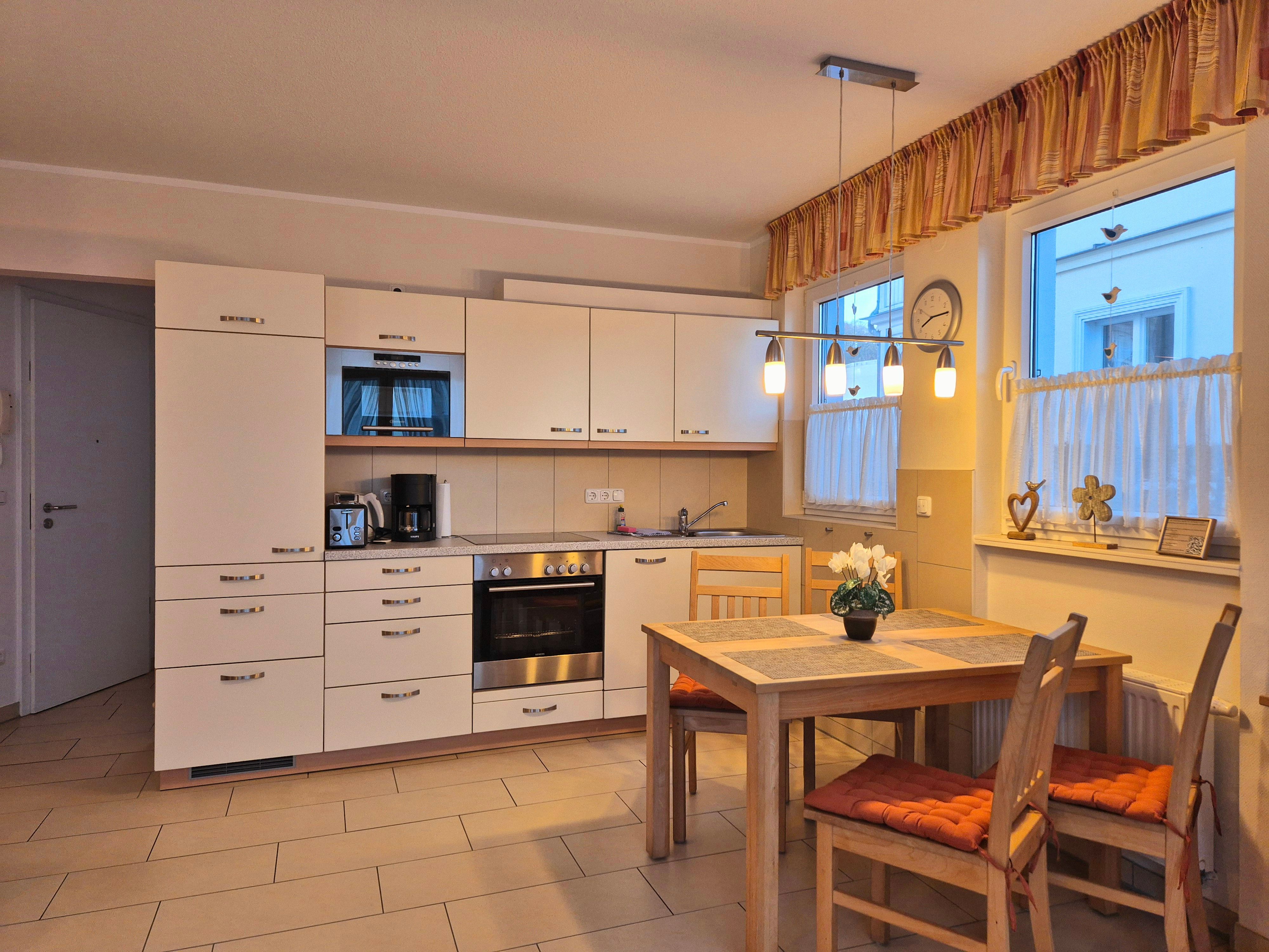 Der Wohnbereich ist mit einer gemütlichen Schlafcouch und einem Flachbild TV ausgestattet. Die offene Wohnküche mit Essbereich ist ausgestattet mit einem 4 Felder Ceranherd mit Backofen, Spülmaschine, Mikrowelle, Kühlschrank mit Gefrierfach, Kaffeemaschone, Toaster und reichlich Küchenutensilien lässt Sie keinen Wunsch offen.