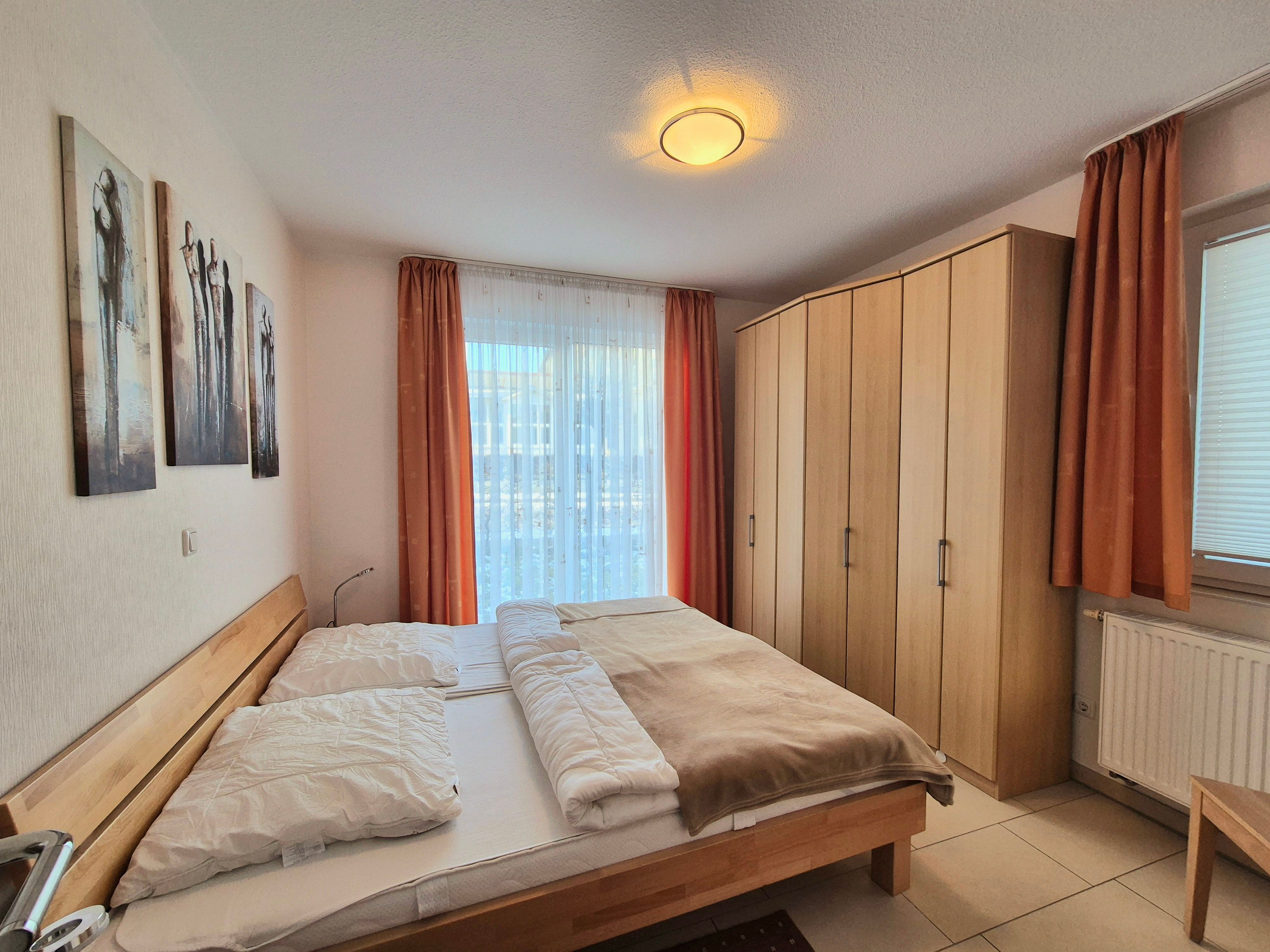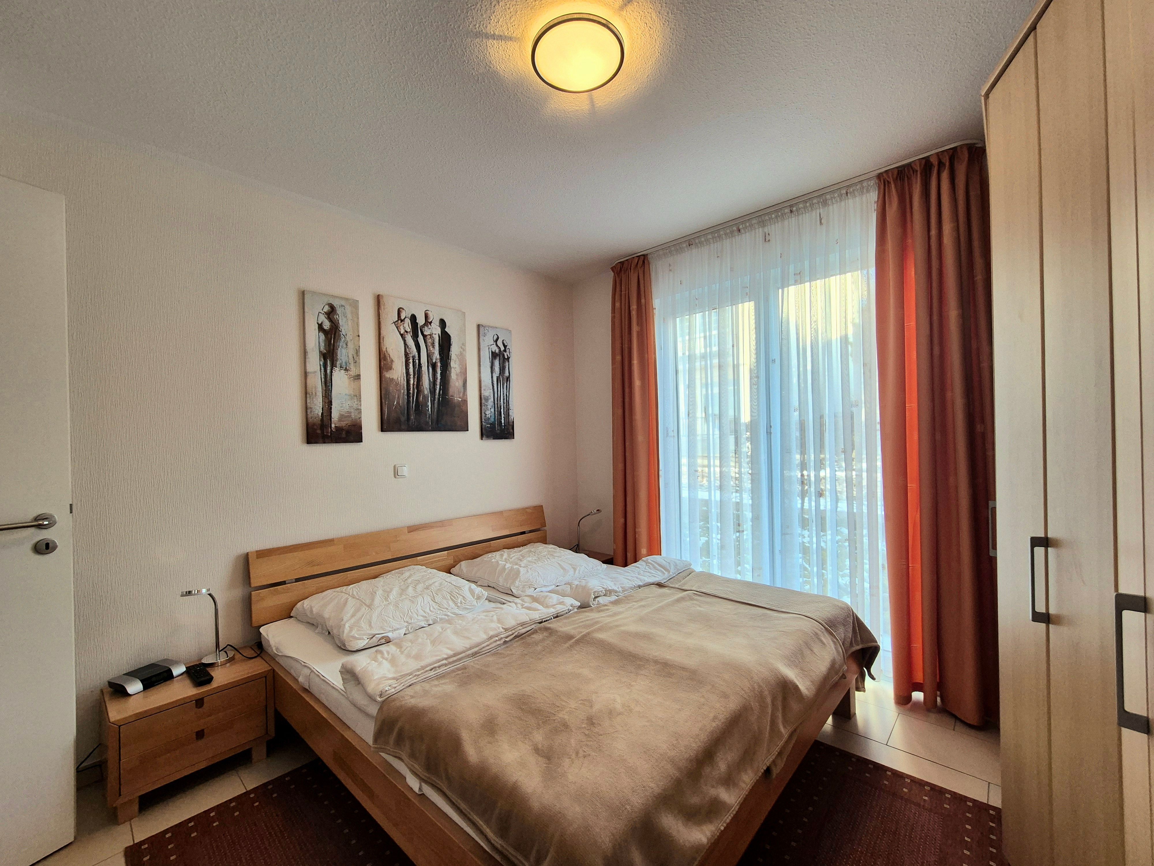 Im Schlafzimmer befindet sich ein Doppelbett, Kleiderschrank und ein Flachbild TV. Das Badezimmer ist mit einer Dusche, WC und Fußbodenheizung ausgestattet.