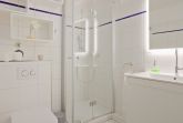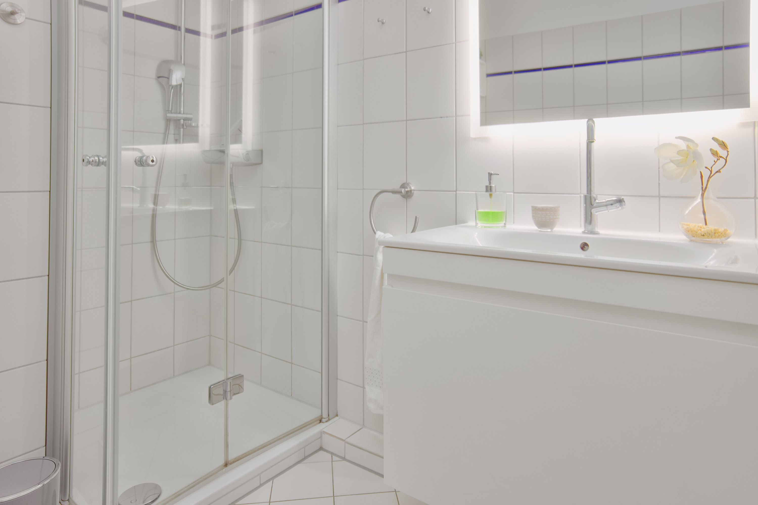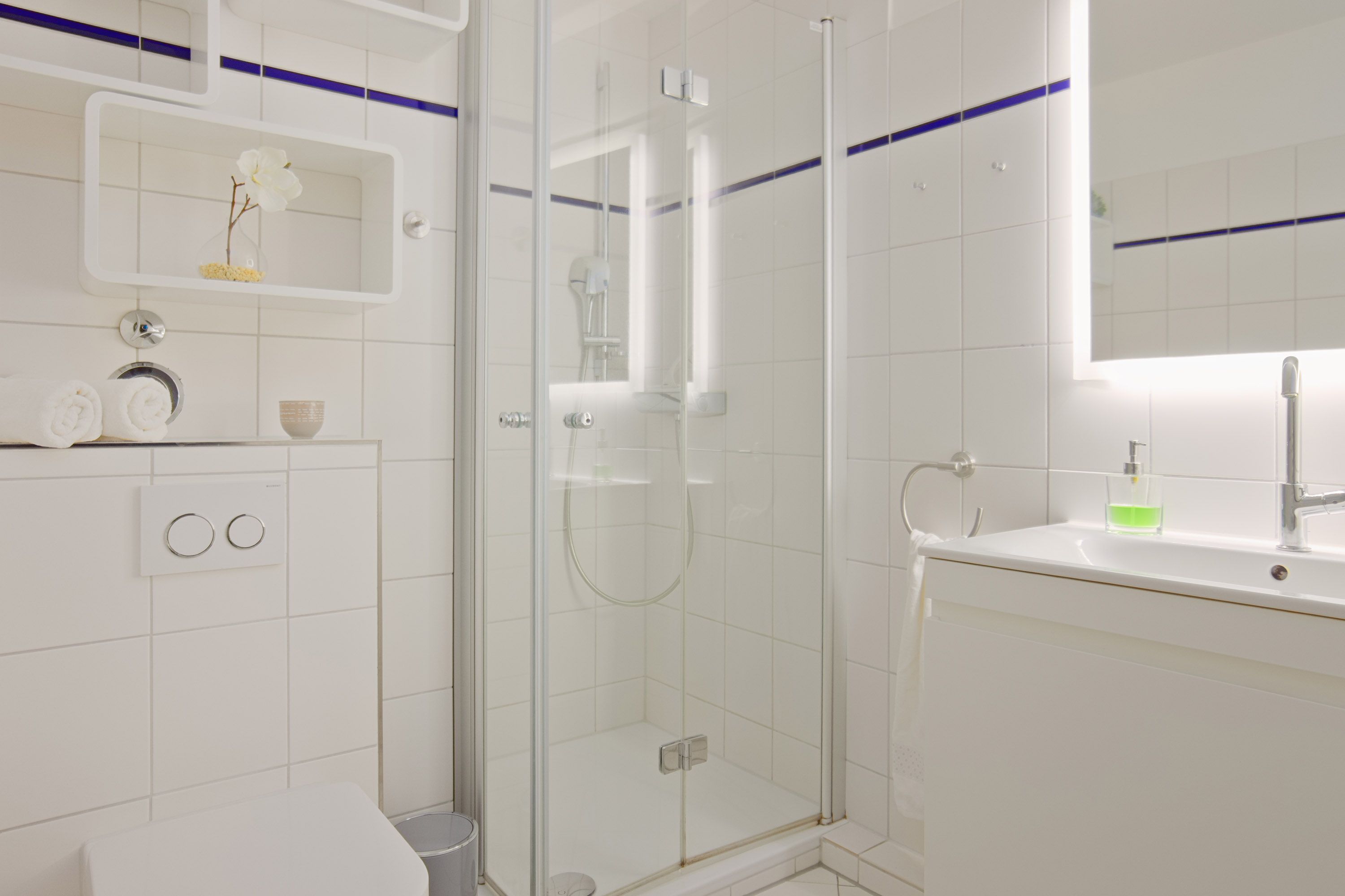 Das hochwertige, moderne Badezimmer ist mit einer geräumigen Dusche, einem beleuchteten Spiegel, einem Handtuchwärmer und einem Föhn ausgestattet perfekt für einen angenehmen Start in den Tag.