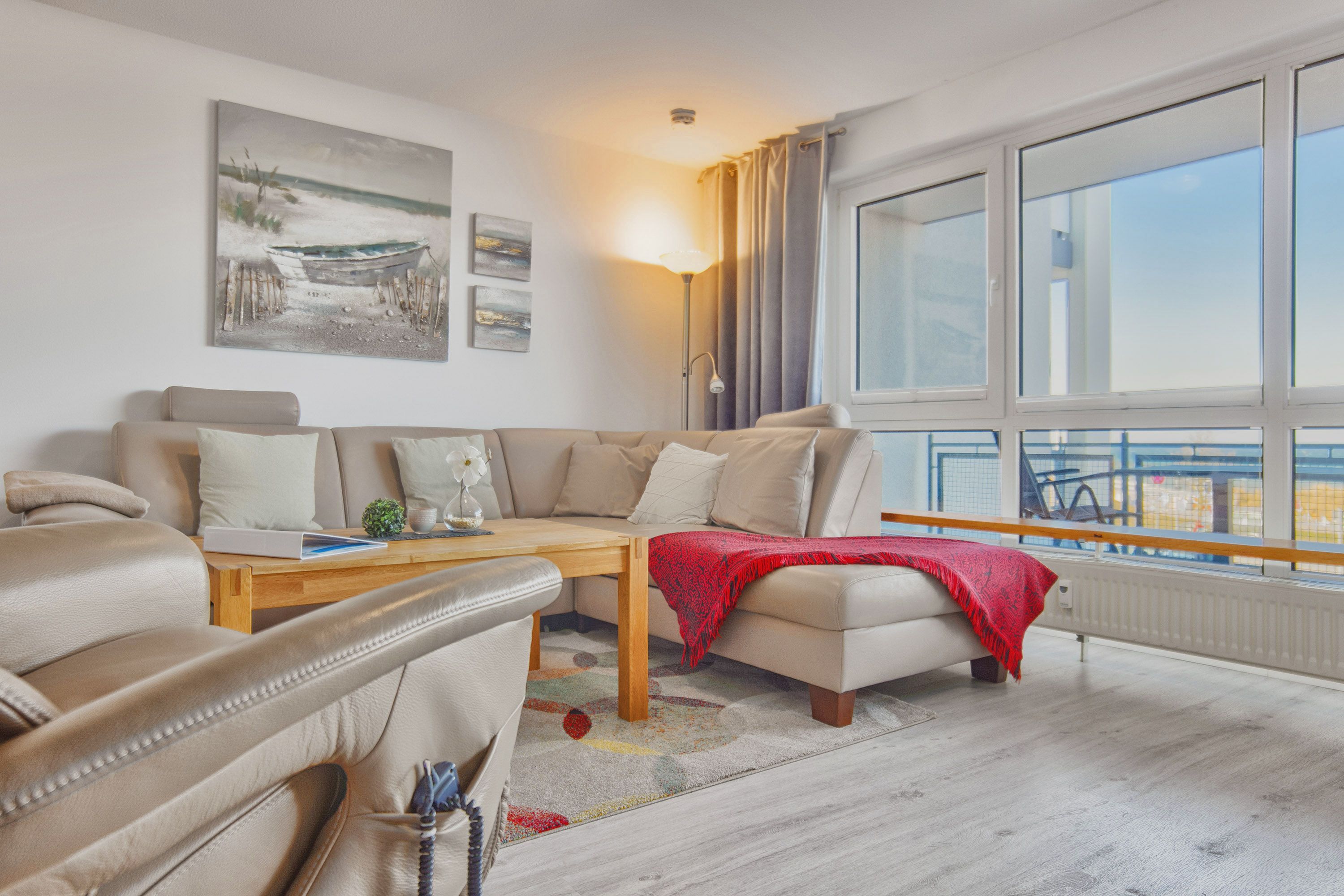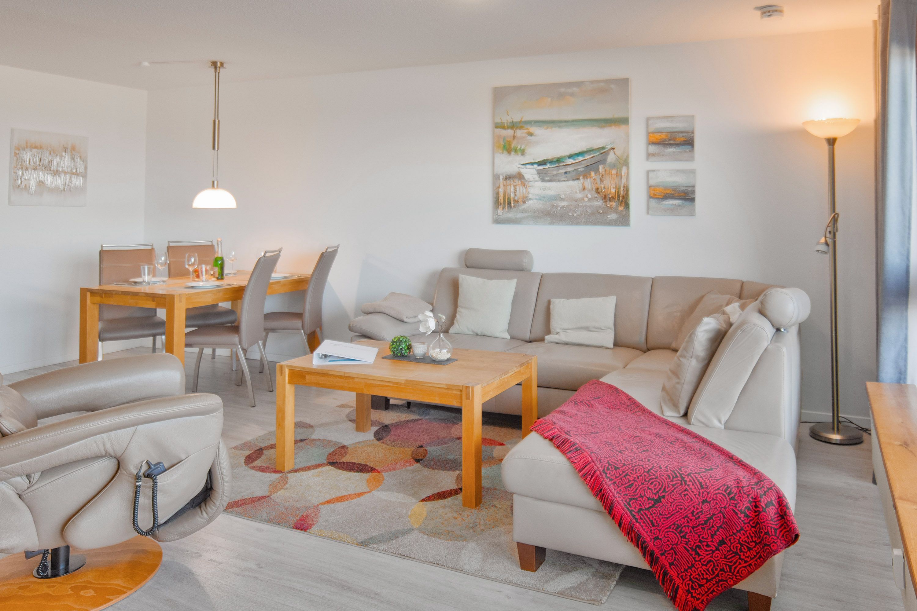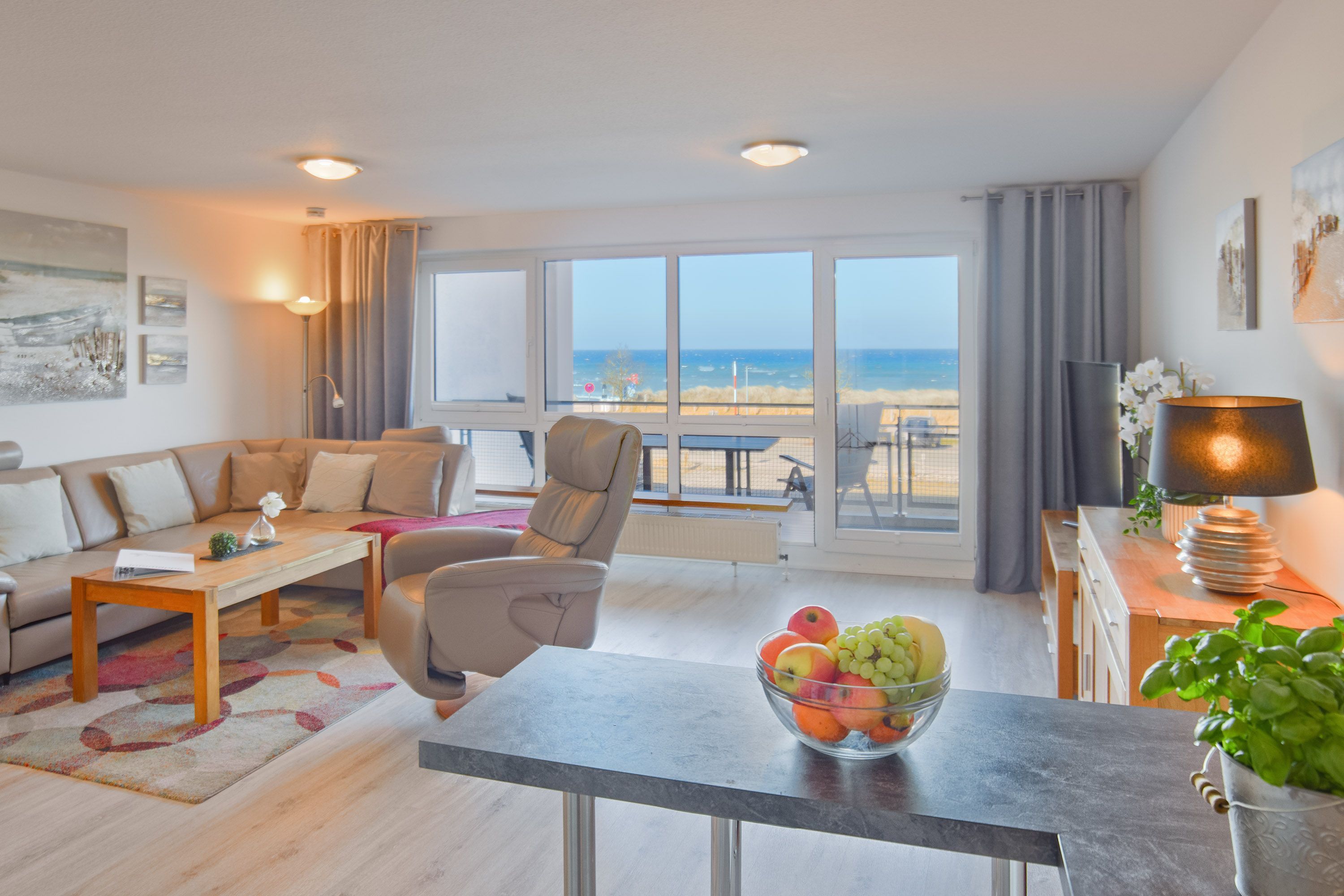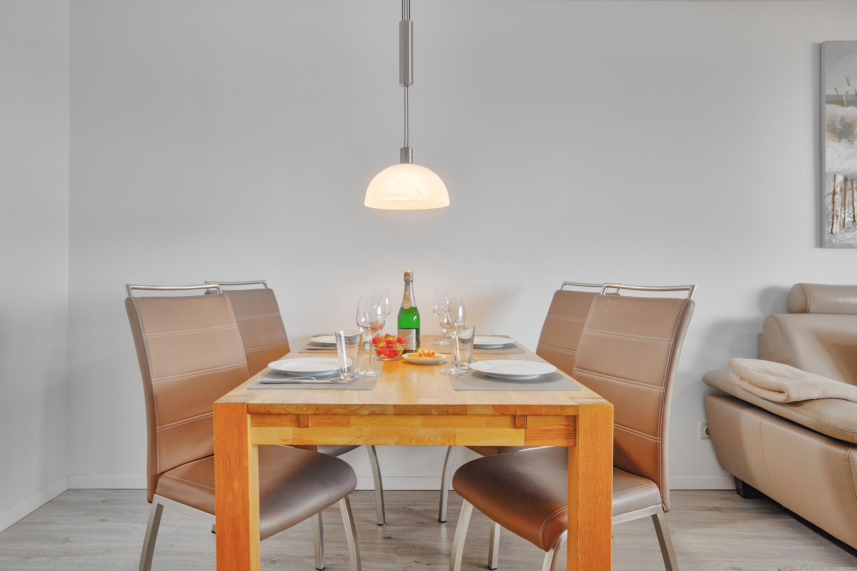 Der offene und großzügige (ca. 37 m²) Wohn- und Essbereich besticht durch eine lichtdurchflutete Panorama-Fensterfront, die einen herrlichen Blick auf die Ostsee und die angrenzenden Dünen bietet. Eine große Ledereckcouch mit Schlaffunktion lädt zum Entspannen ein, während der moderne 55-Zoll-LCD-TV mit Grundig-Soundsystem für beste Unterhaltung sorgt. Ein Esstisch für vier Personen rundet den Wohnbereich ab und bietet den perfekten Platz für gemeinsame Mahlzeiten oder einen gemütlichen Spieleabend Gesellschaftsspiele und Bestseller-Bücher stehen zur Verfügung.