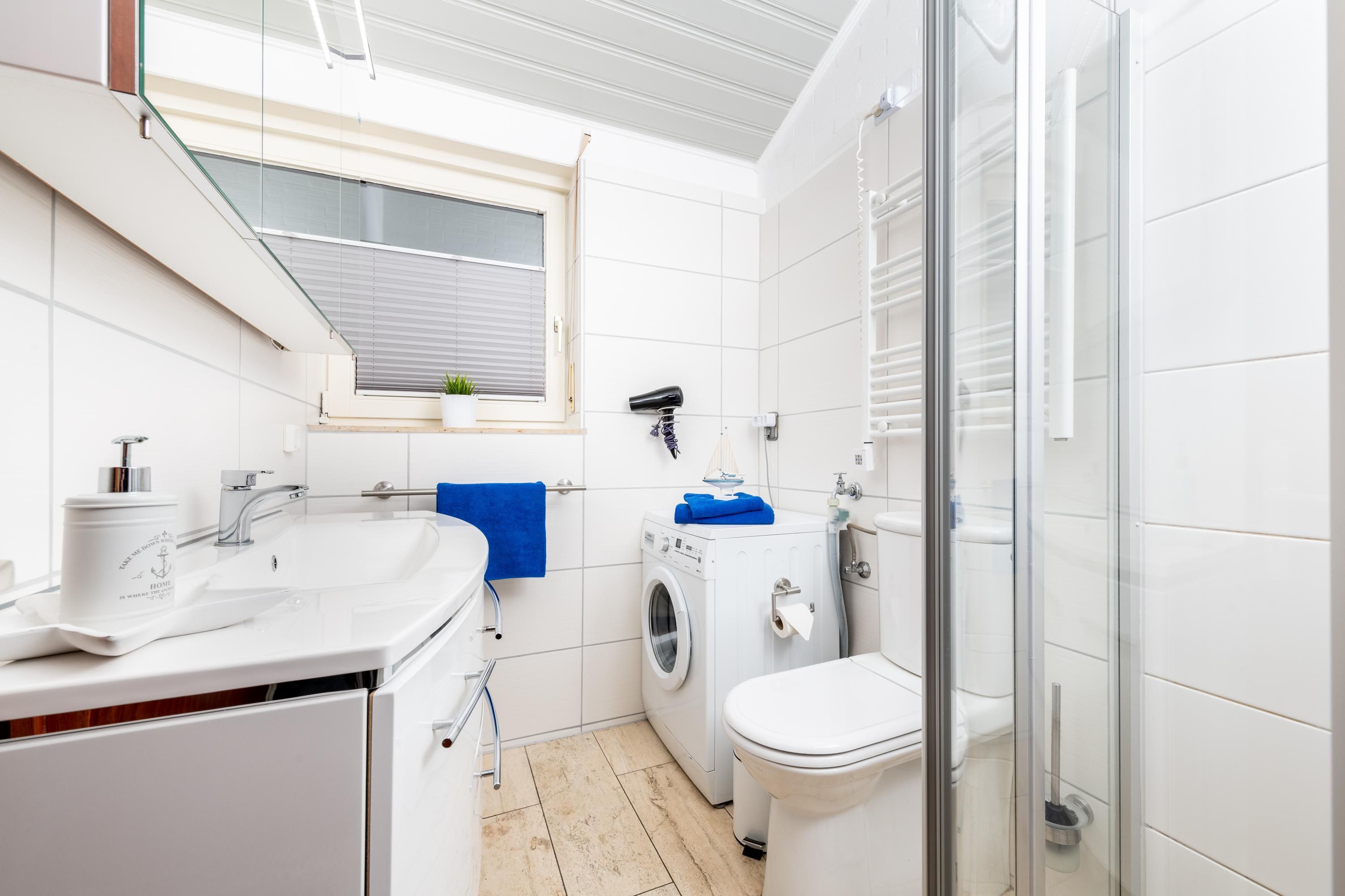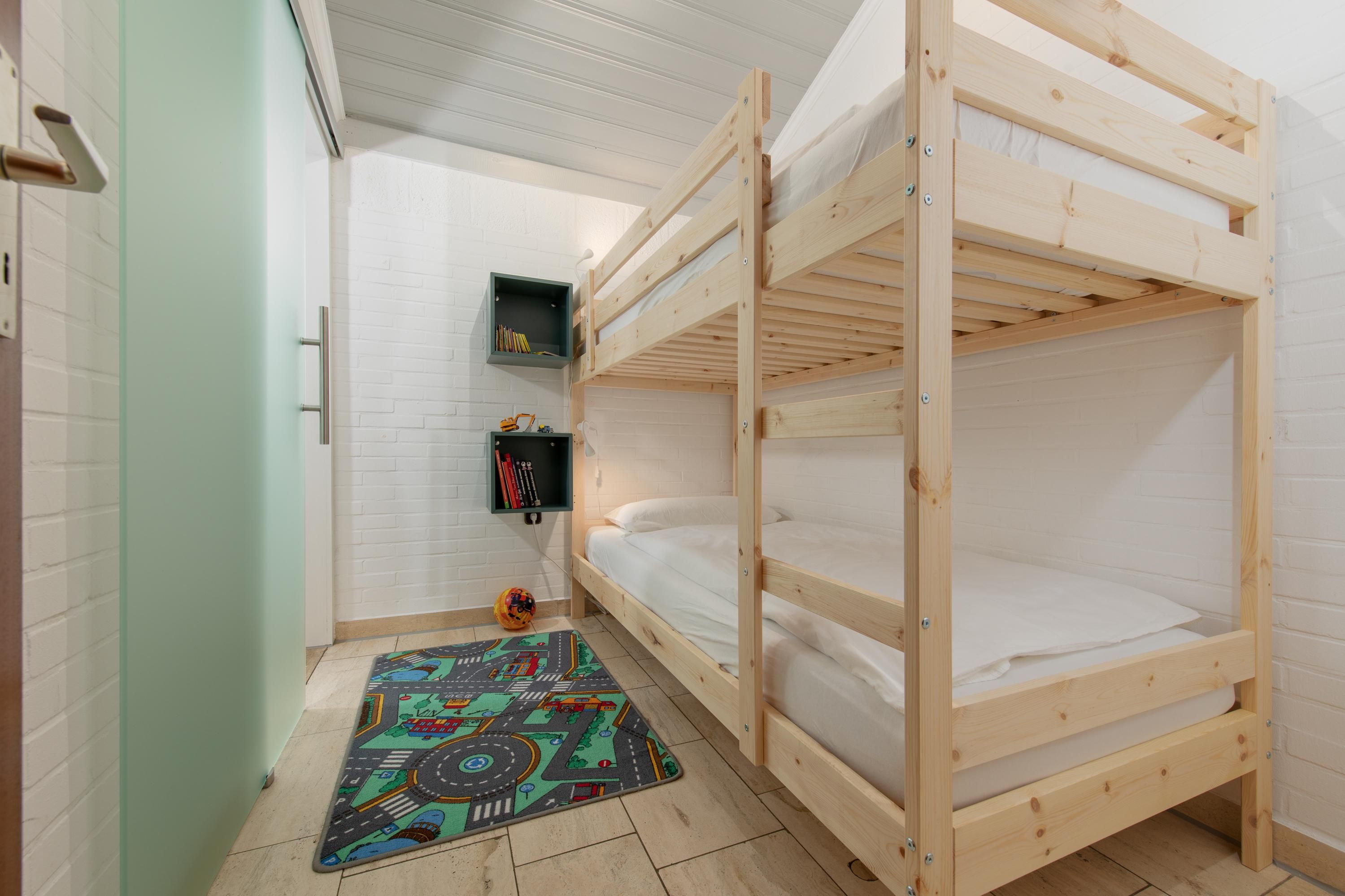 Weiterhin stehen Ihnen 1 Bad mit bodengleicher Dusche und Waschmaschine (inkl. Trockner im HWR) sowie 2 Schlafzimmer mit je einem Doppelbett (180 x 200) und je einem TV sowie ein Kinderzimmer mit einem Doppelstockbett (90 x 200) zur Verfügung.
