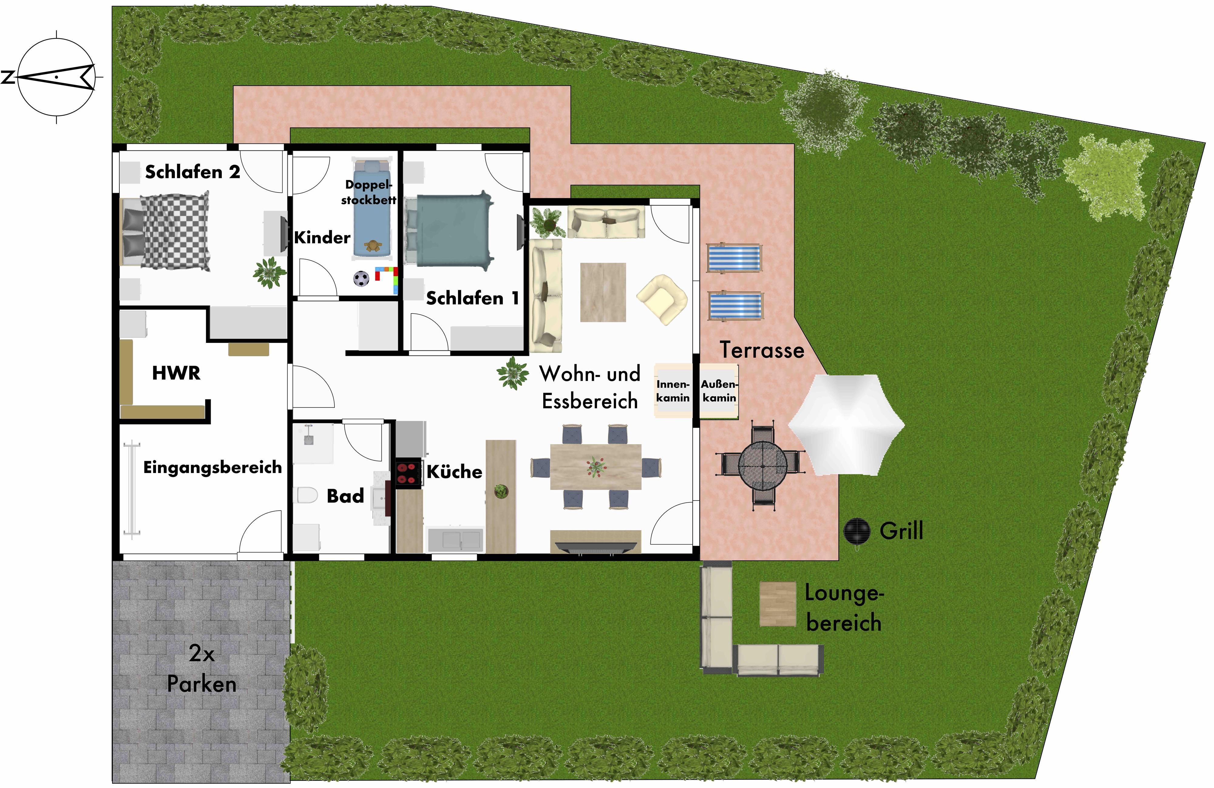 Der großzügige Wohn- und Essbereich mit großem Smart-TV und gemütlicher Sitzecke sowie die voll ausgestattete offene Küche laden zum geselligen Beisammensein ein. Das viele Grün und der Baumbestand im liebevoll angelegten Garten ermöglichen erholsame Momente in absoluter Privatsphäre. Genießen Sie die Sonne im Lounge-Bereich auf der Südterrasse. An kälteren Tagen können Sie sich mit dem Innen- und Außenkamin angenehm einheizen. Eine Grill- und Feuerschale für gemütliche Grillabende ist ebenfalls vorhanden.