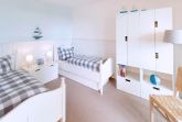 Das Ferienhaus verfügt über zwei Schlafräume, die erholsame Nächte garantieren. Ein Schlafzimmer ist mit einem großzügigen Hochbett (180 cm x 220 cm) ausgestattet, das zweite bietet zwei Einzelbetten (90 cm x 200 cm). Zusätzlich lässt sich das Sofa im Wohnzimmer zu einem Bett ausklappen ideal für zusätzliche Gäste.