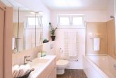 Das Badezimmer bietet modernen Komfort mit Fußbodenheizung, einer Badewanne mit integrierter Dusche, WC und einer Waschmaschine perfekt für längere Aufenthalte.