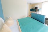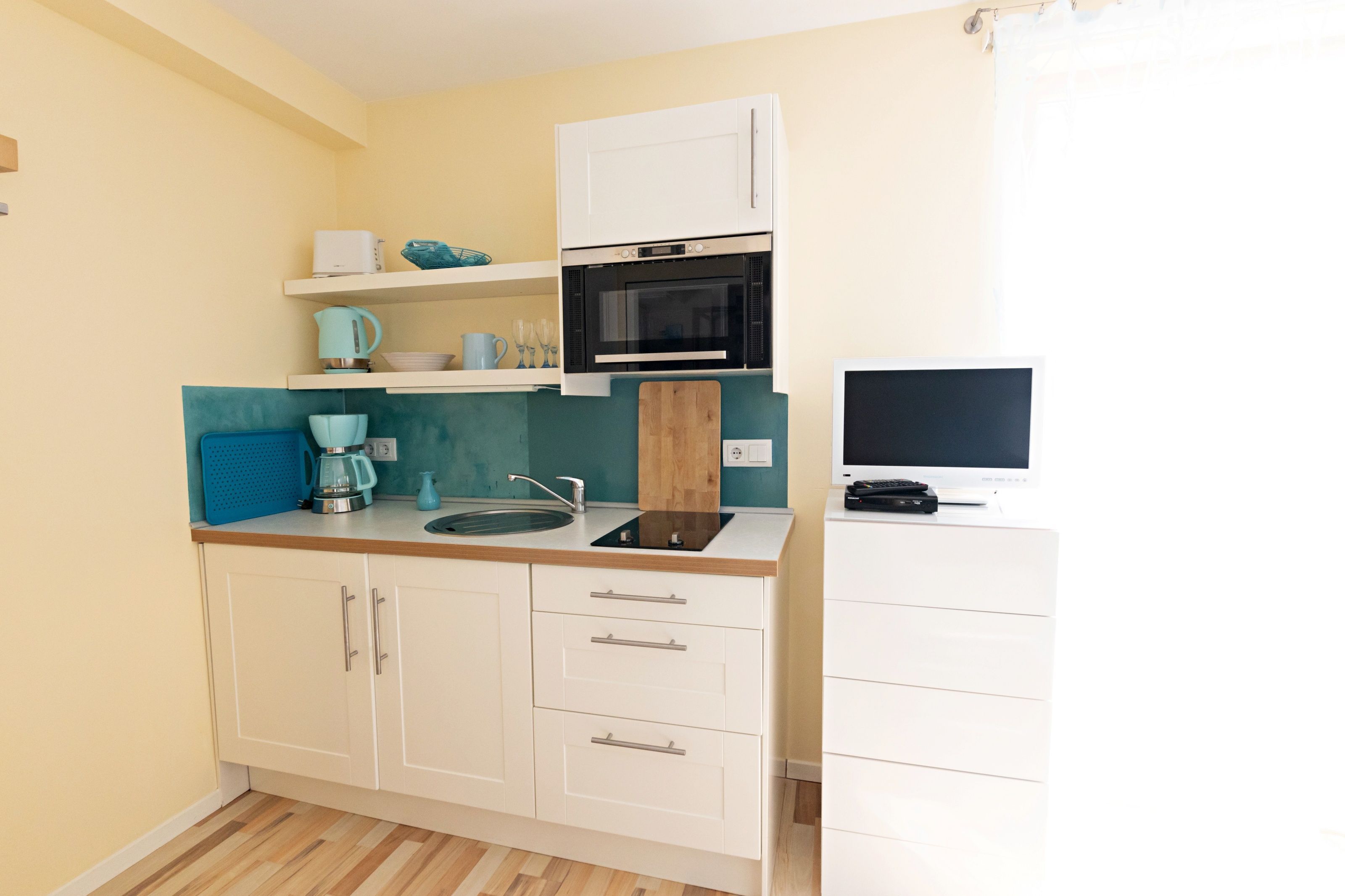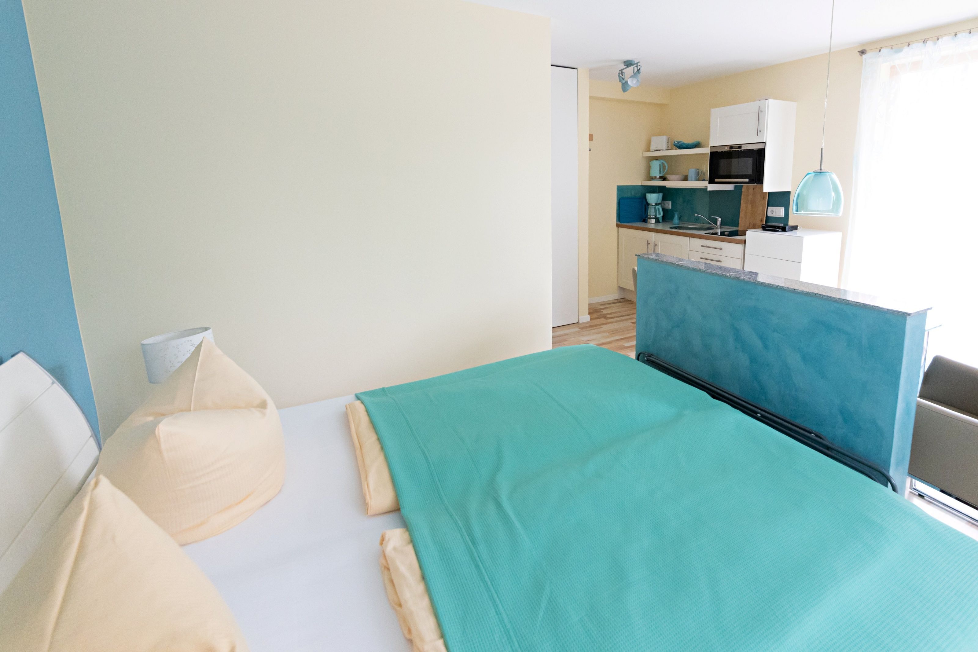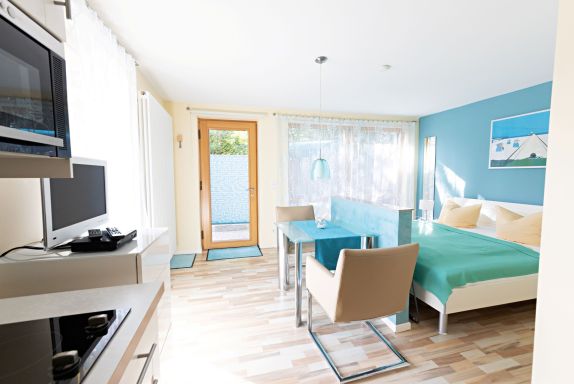 Moderne 1-Raum-Nichtraucher-Ferienwohnung (ca. 27 qm) im Erdgeschoß mit Terrasse (zur Südwestseite, umgeben von Begrünung) und separatem Eingang. Der kombinierte Wohn-/ Schlafraum verfügt über ein Doppelbett, TV, Radio, Esstisch mit zwei bequemen Stühlen sowie eine komplette Küchenzeile (mit 2-Platten-Cerandherd, Mikrowelle mit Backfunktion, Kühlschrank, Kaffeemaschine, Wasserkocher, Toaster etc.). Das Bad verfügt über DU/WC sowie Haarfön. Die Wohnung ist mit einem allergikerfreundlichem Holzfußboden ausgestattet.