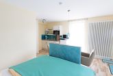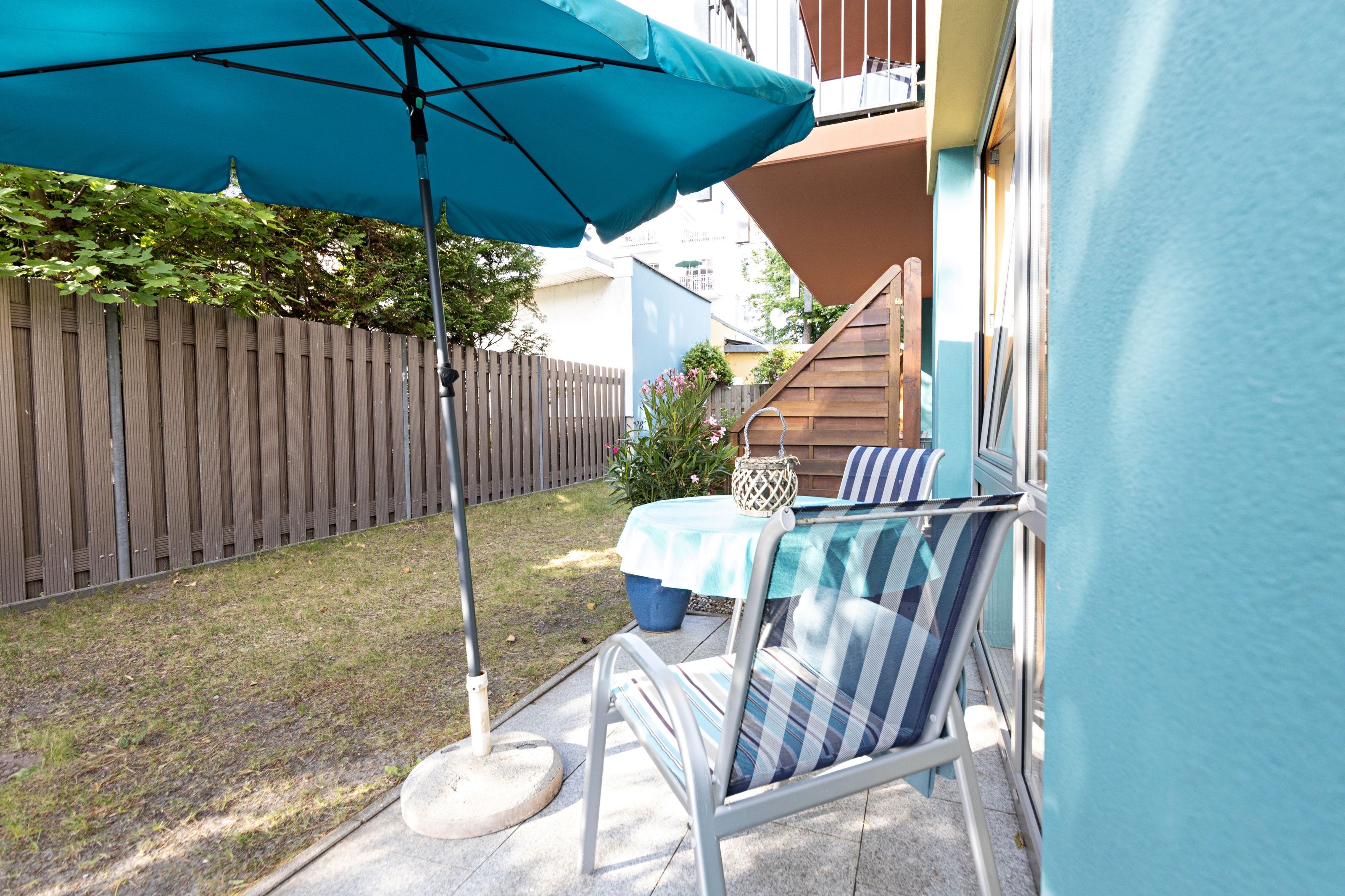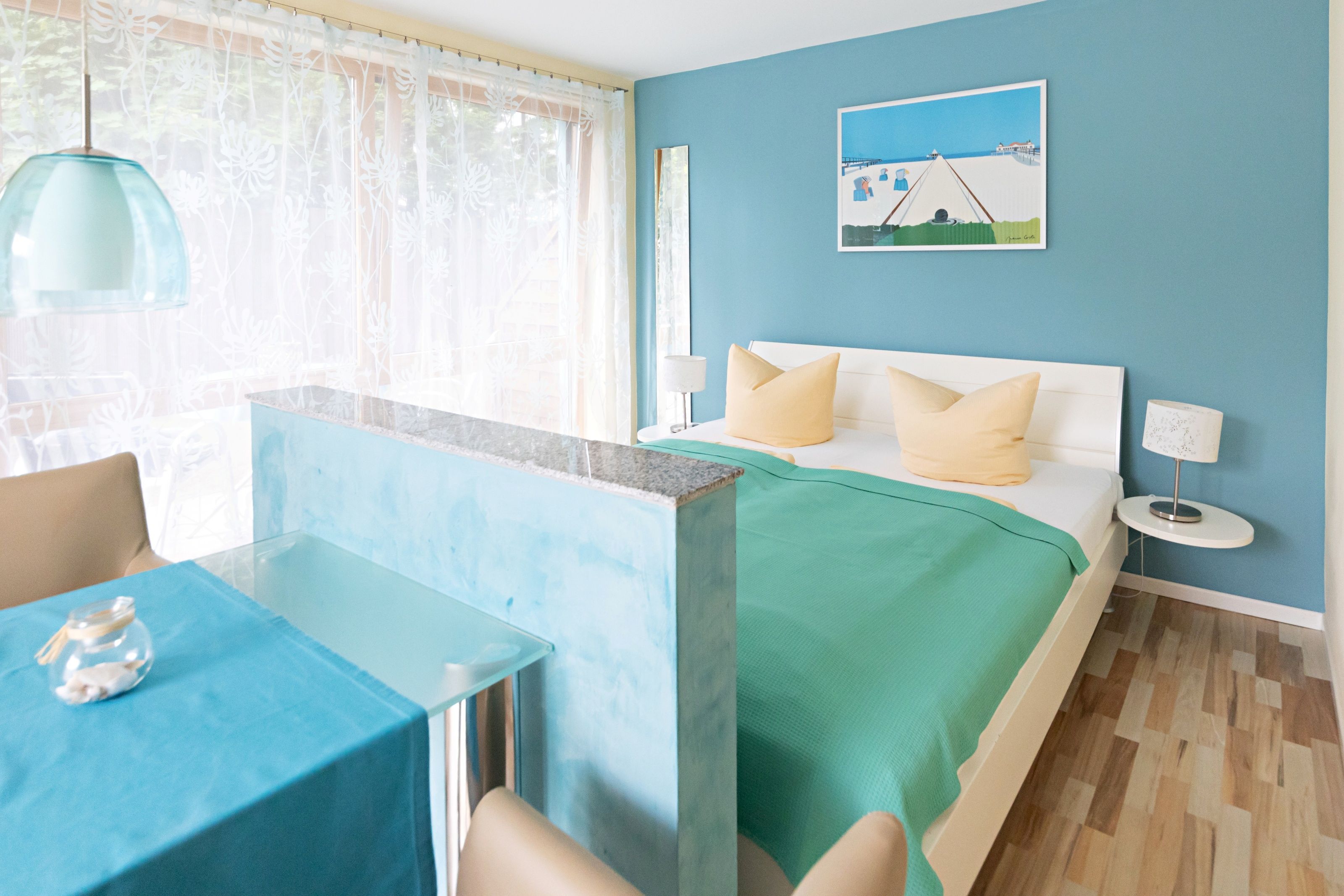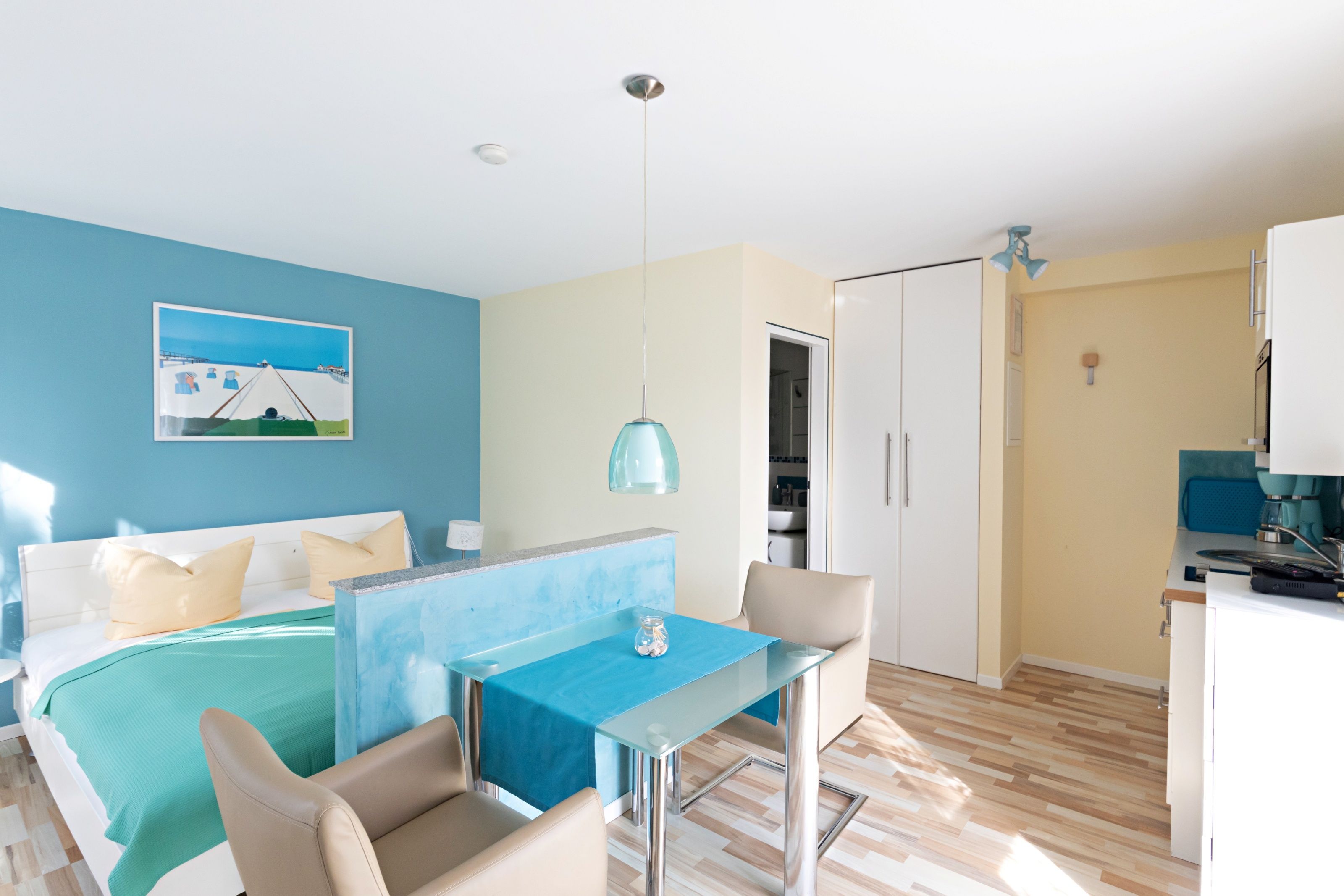 Moderne 1-Raum-Nichtraucher-Ferienwohnung (ca. 27 qm) im Erdgeschoß mit Terrasse (zur Südwestseite, umgeben von Begrünung) und separatem Eingang. Der kombinierte Wohn-/ Schlafraum verfügt über ein Doppelbett, TV, Radio, Esstisch mit zwei bequemen Stühlen sowie eine komplette Küchenzeile (mit 2-Platten-Cerandherd, Mikrowelle mit Backfunktion, Kühlschrank, Kaffeemaschine, Wasserkocher, Toaster etc.). Das Bad verfügt über DU/WC sowie Haarfön. Die Wohnung ist mit einem allergikerfreundlichem Holzfußboden ausgestattet.
