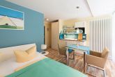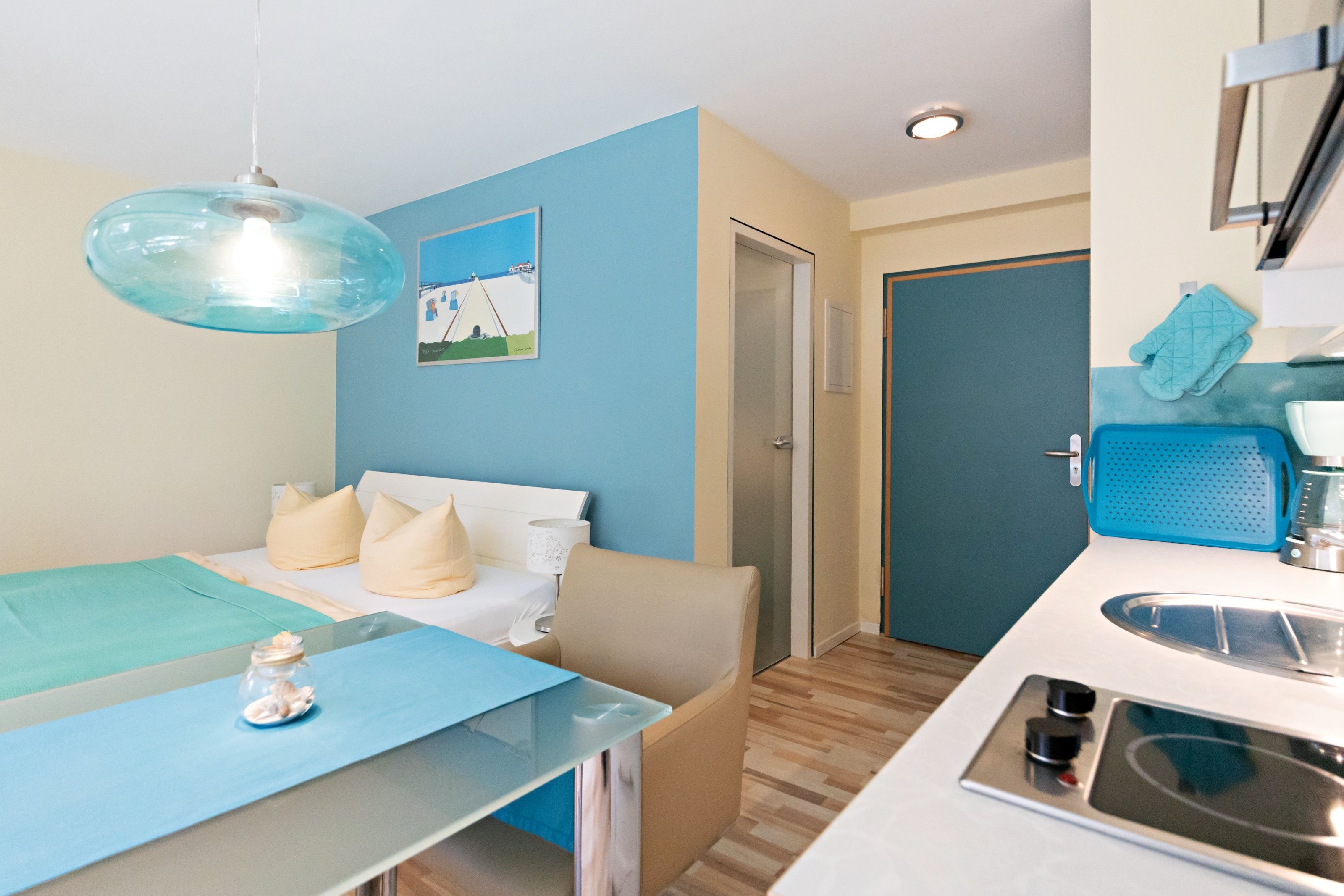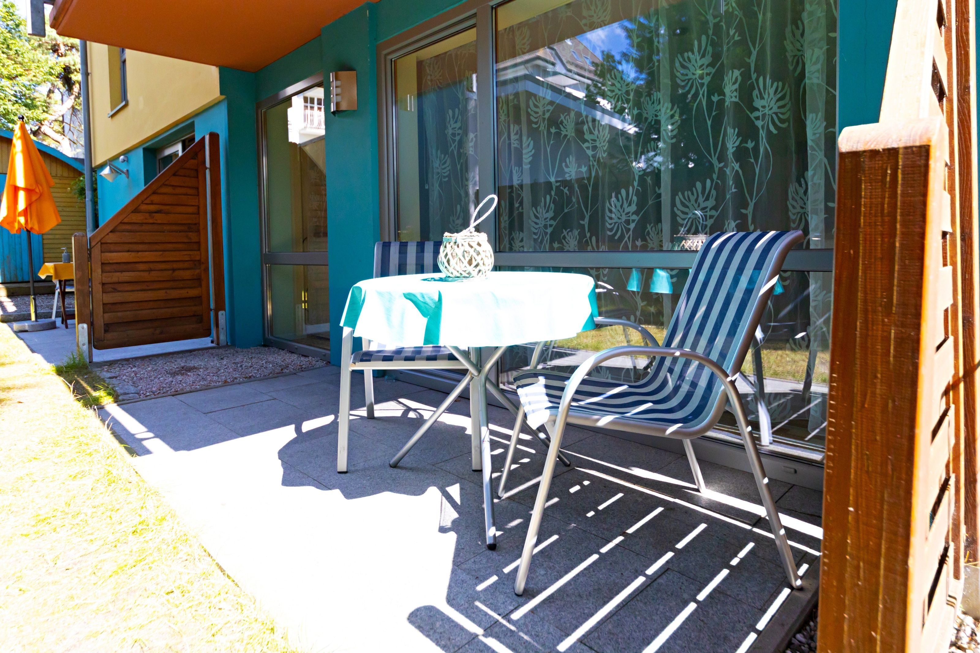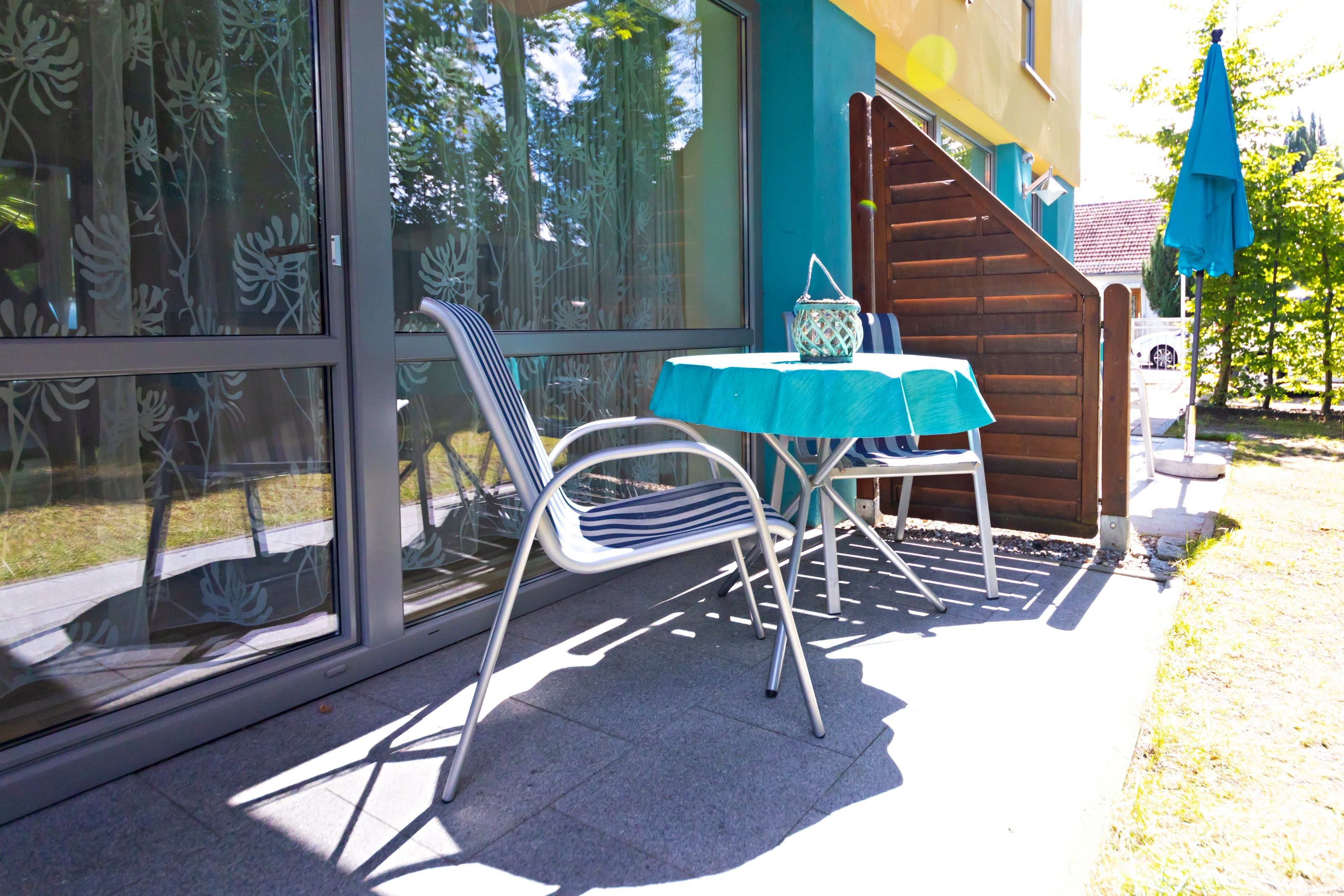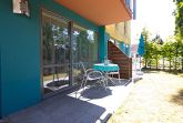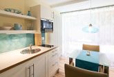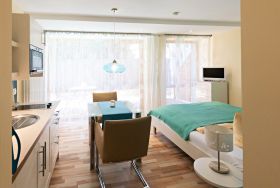 Moderne 1-Raum-NICHTRAUCHER-Ferienwohnung (ca. 28 qm) im Erdgeschoß mit Terrasse (zur Südwestseite, umgeben von Begrünung) und separatem Eingang. Der kombinierte Wohn-/Schlafraum verfügt über ein Doppelbett, TV, Radio, Esstisch mit zwei bequemen Stühlen sowie eine komplette Küchenzeile (mit 2-Platten-Ceranherd, Mikrowelle mit Backfunktion, Kühlschrank, Kaffeemaschine, Wasserkocher, Toaster etc.). Das Bad verfügt über DU/WC sowie Haarfön. Die Wohnung ist mit einem allergikerfreundlichem Holzfußboden ausgestattet.