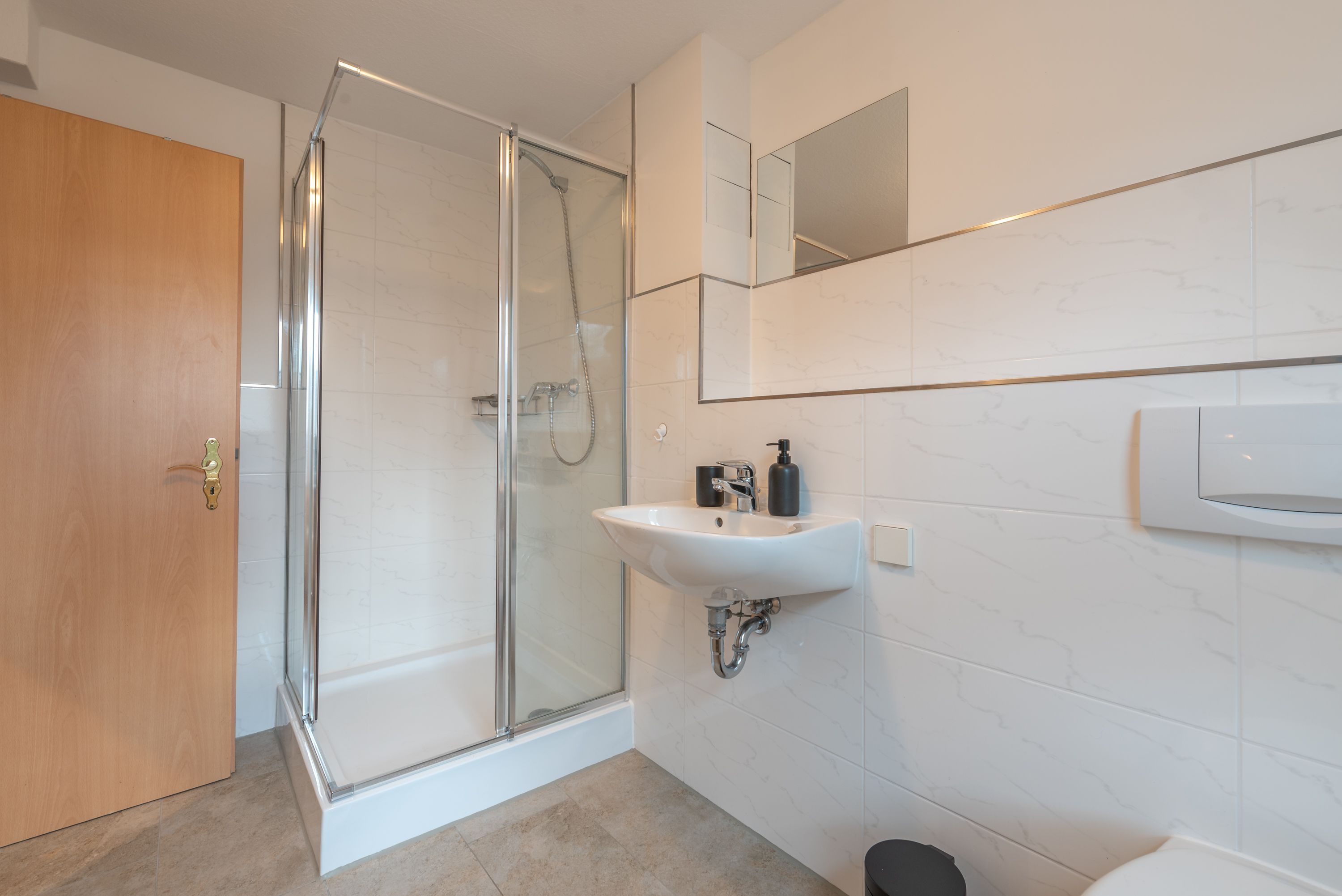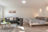 Der offene Wohn- und Schlafbereich ist mit einem bequemen Doppelbett, einem Kleiderschrank sowie einer gemütlichen Sitzecke mit Sofa, Sessel und Fernseher ausgestattet. In der separaten, kleinen Küche finden Sie einen Essplatz für zwei Personen perfekt für ein entspanntes Frühstück. Das Badezimmer verfügt über eine Dusche und ein WC.