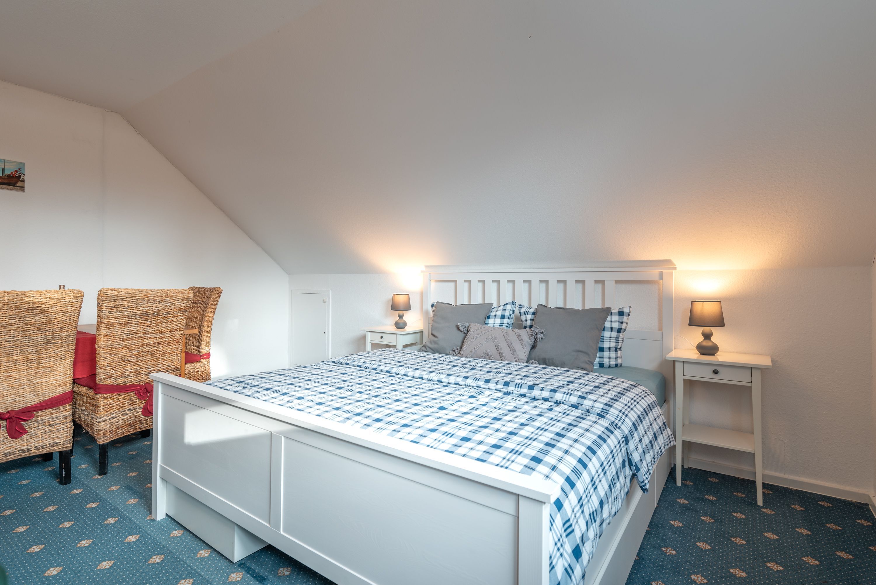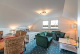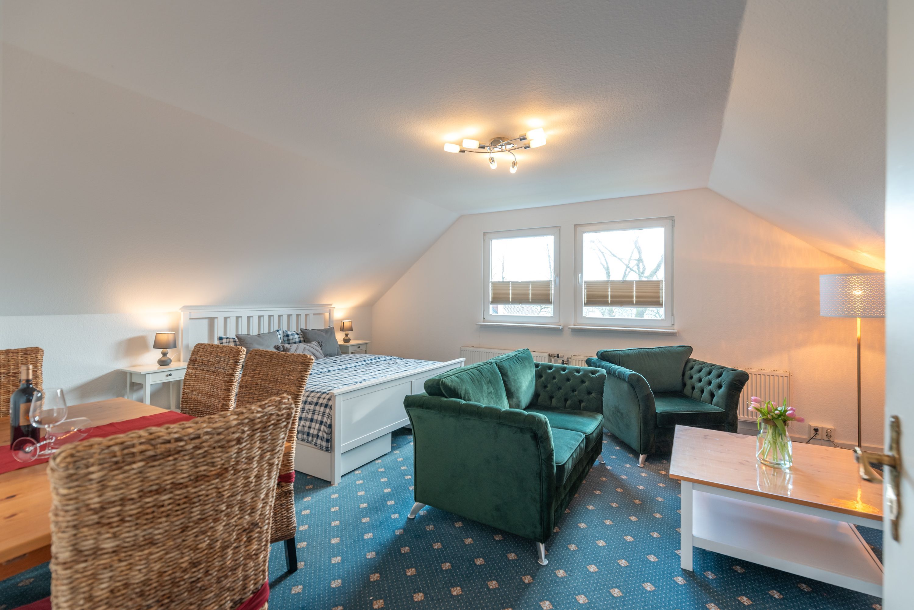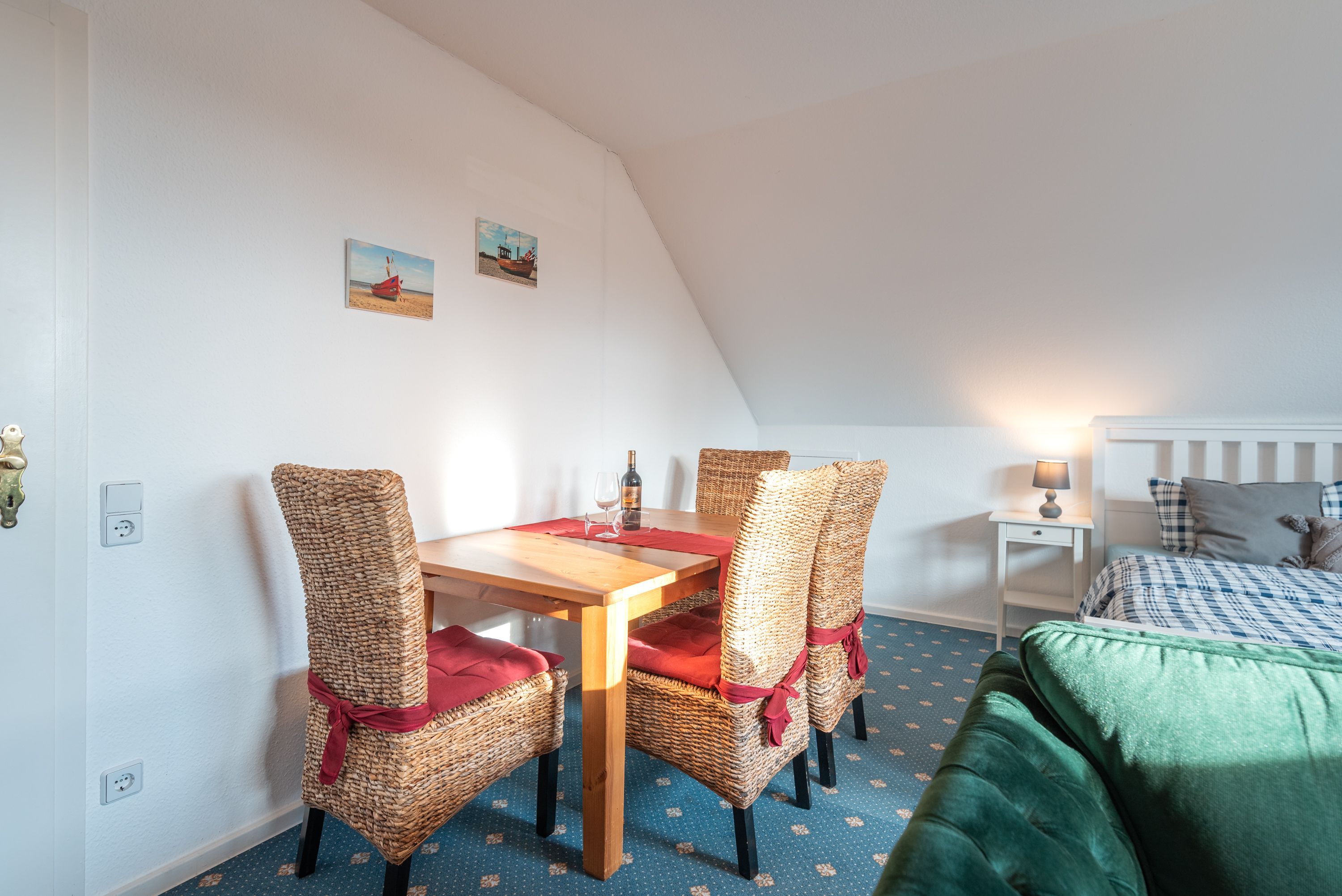 • Wohn- und Schlafbereich: Ein heller, geräumiger Raum mit einem bequemen Doppelbett, einer gemütlichen Couchecke zum Entspannen, einem TV sowie einem Esstisch für gesellige Stunden.