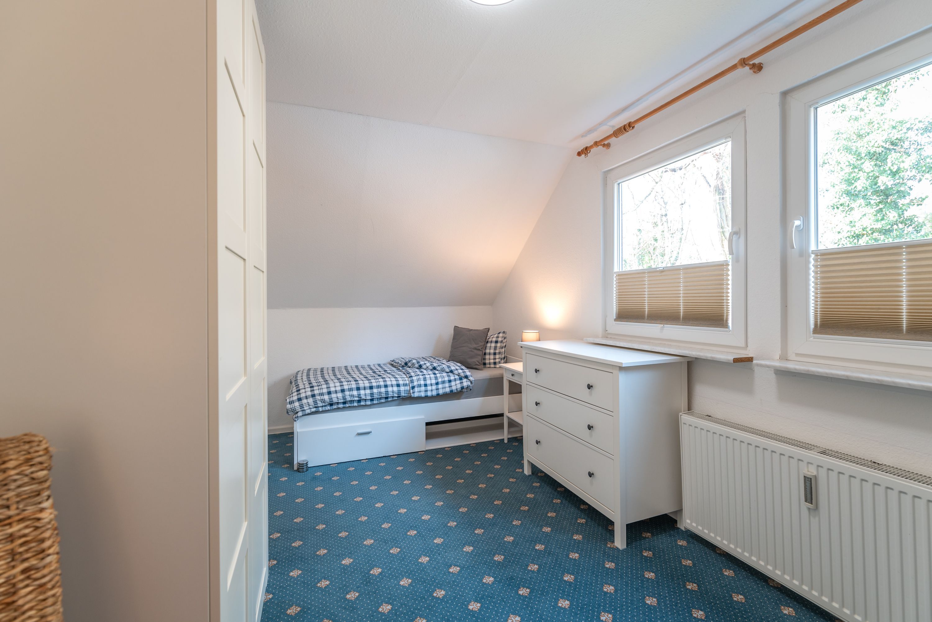 • Zweites Schlafzimmer: Ausgestattet mit zwei Einzelbetten und einem großzügigen Kleiderschrank ideal für Kinder oder weitere Mitreisende.