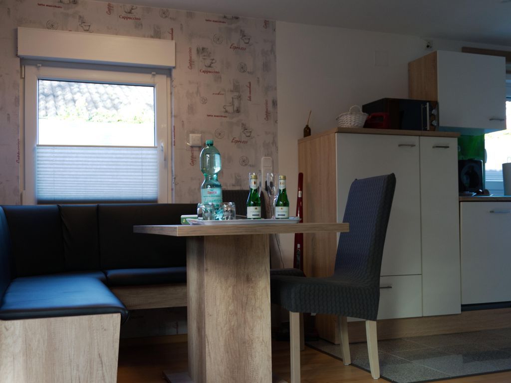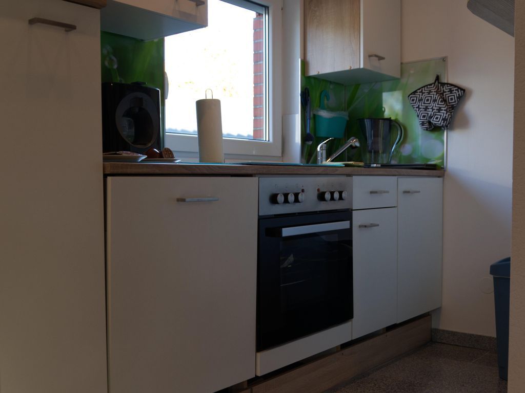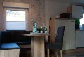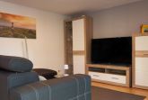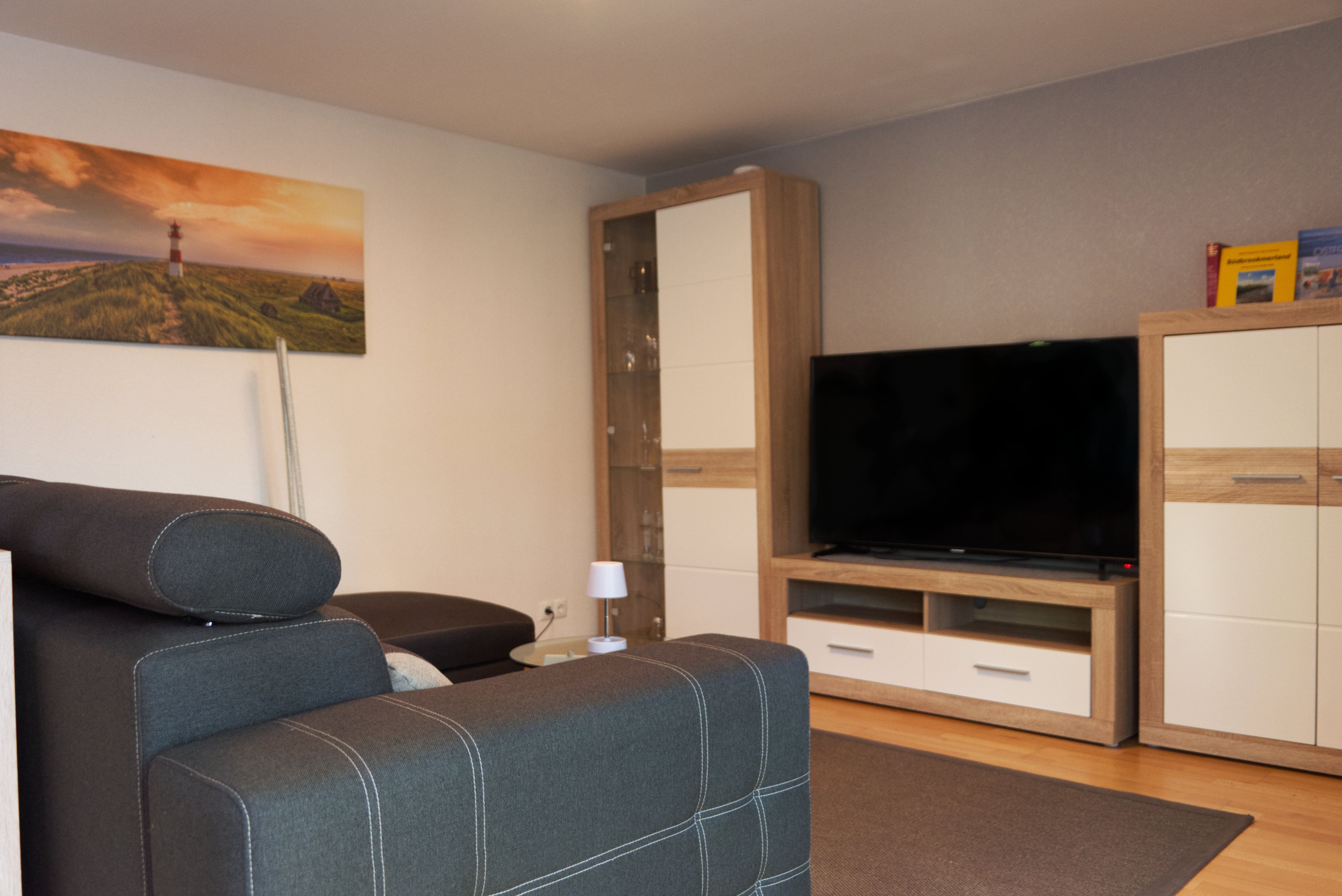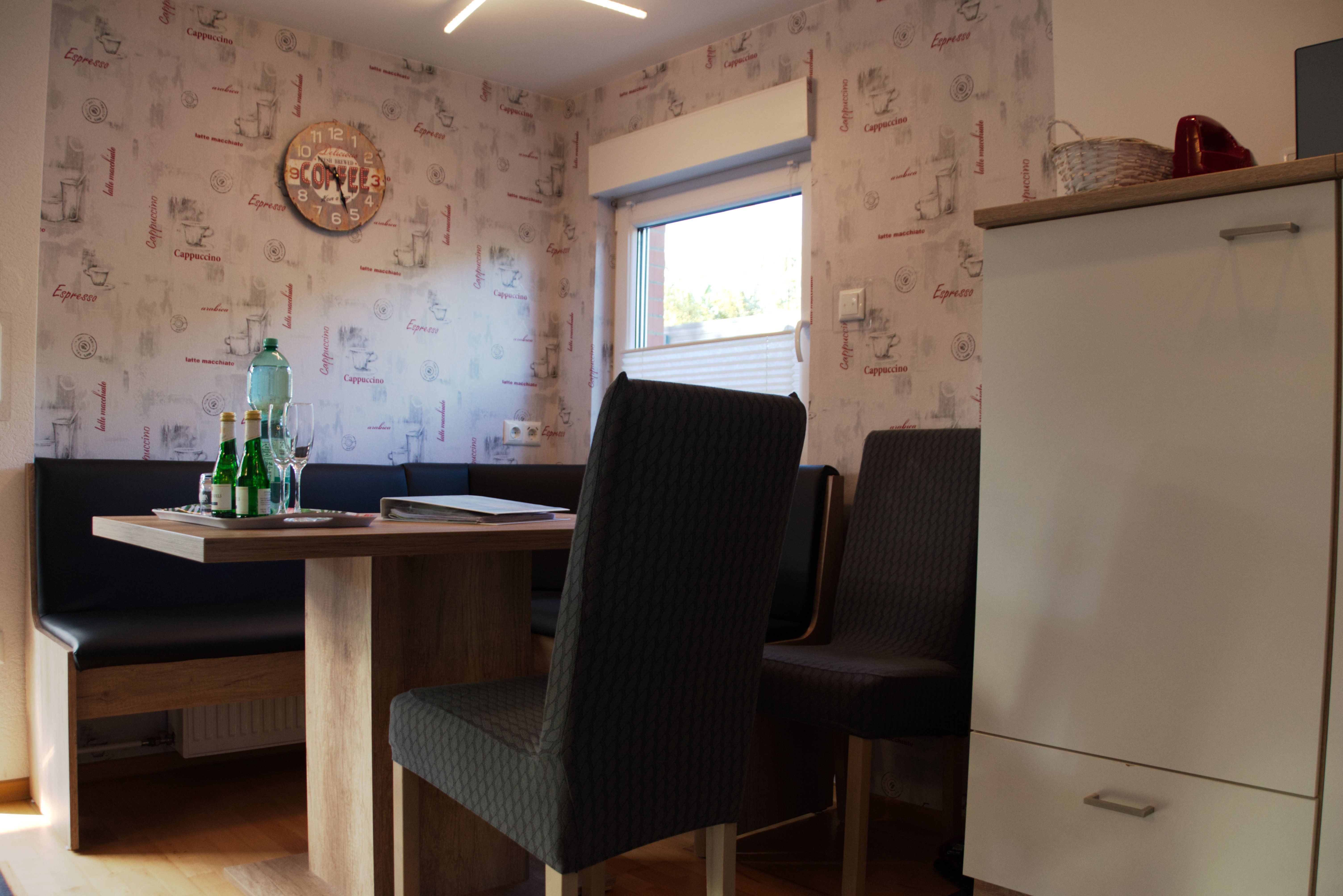 Wohnbereich: Offene, komplett eingerichtete Küche mit Herd, Spülmaschine, Kühlschrank mit Gefrierfach und allem, was Sie für Ihren Aufenthalt benötigen. Die Essecke ist mit einer gemütlichen Eckbank ausgestattet, und im Wohnbereich lädt ein Sofa mit Fernseher zum Entspannen ein.