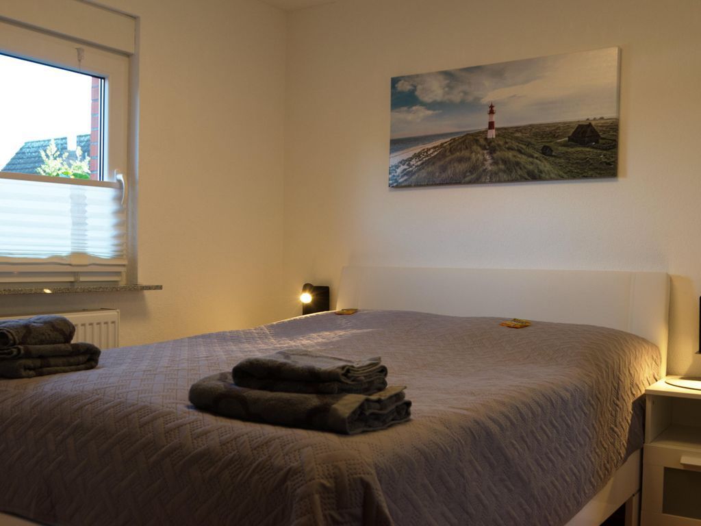 Schlafzimmer: Ein Schlafzimmer mit einem 1,4 m breiten Doppelbett, großem Kleiderschrank und Fernseher.