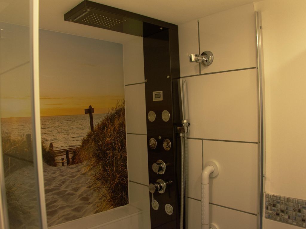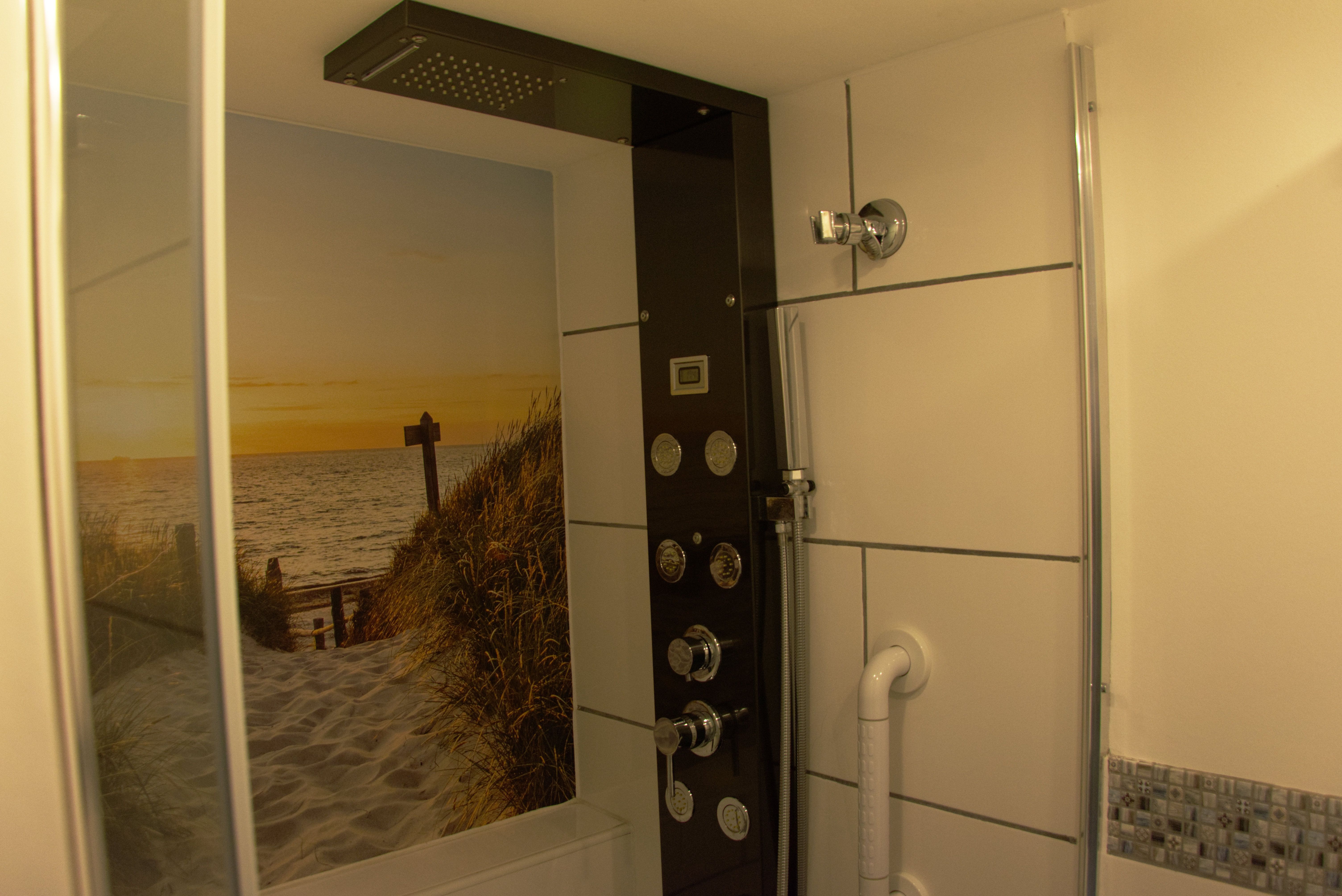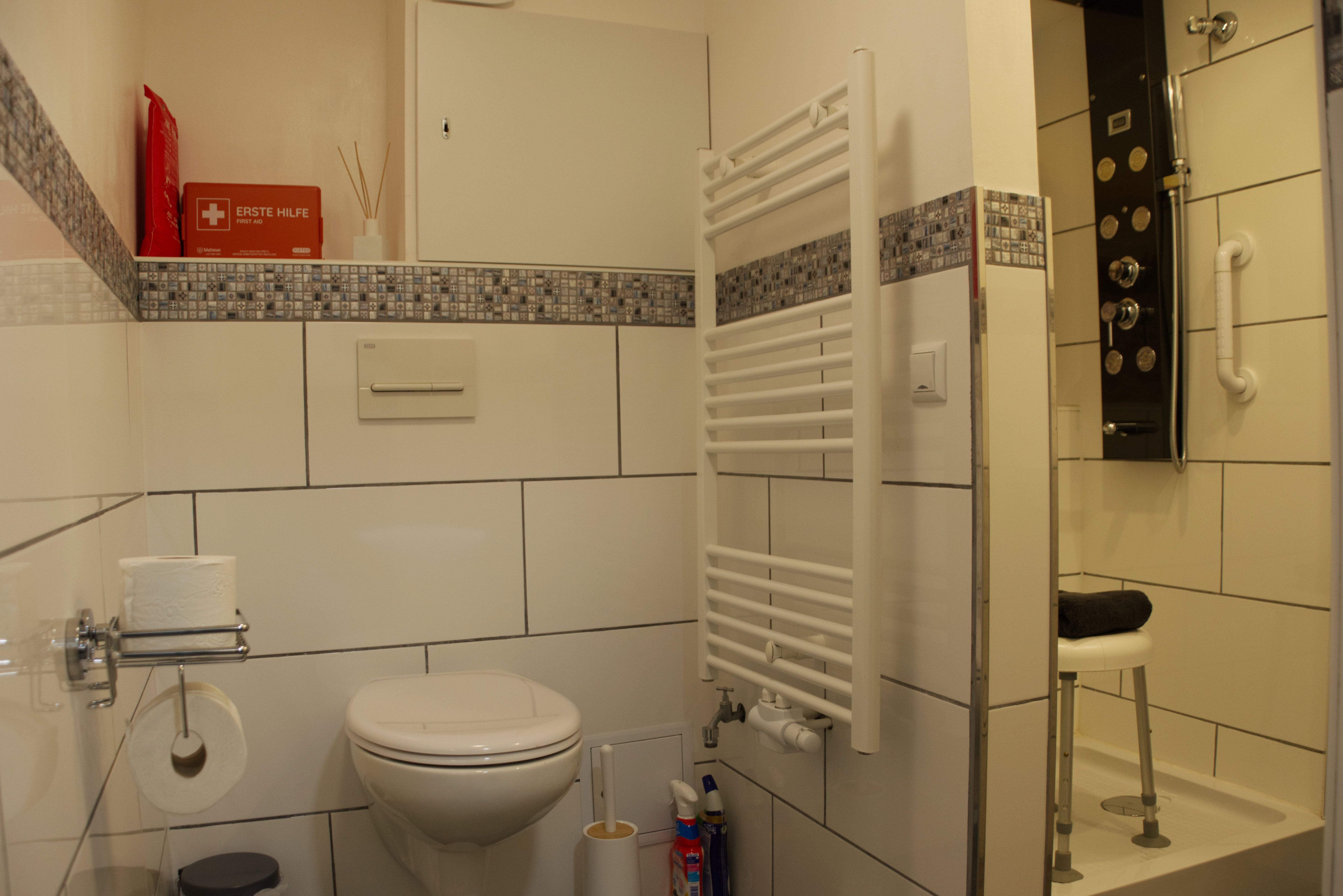 Badezimmer: Zwei moderne Bäder, jeweils mit Dusche und WC.