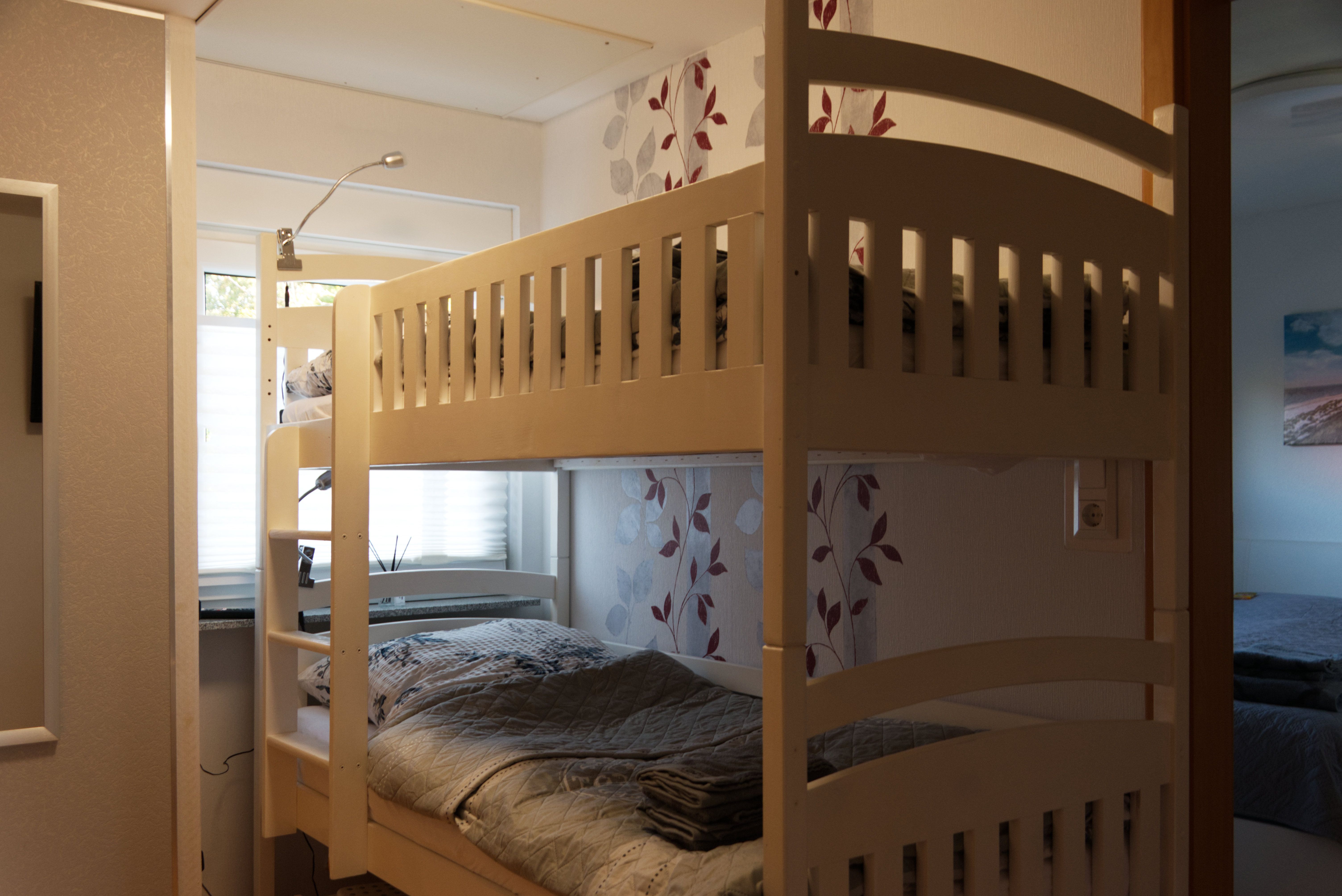 Kinderzimmer: Kinder-Etagenbett (1,6 m x 0,8 m) mit eigenem Fernseher.