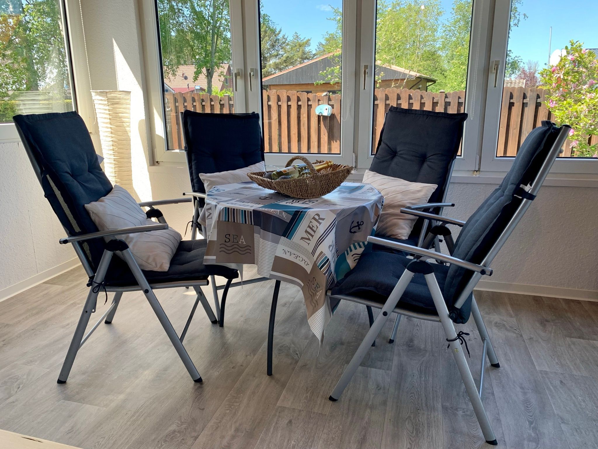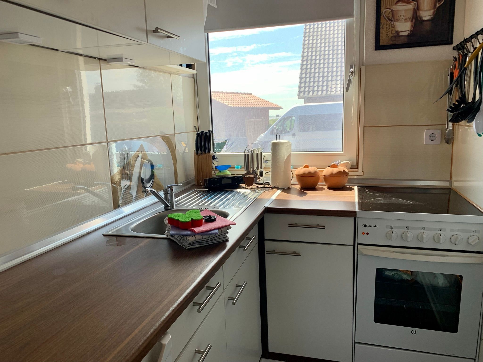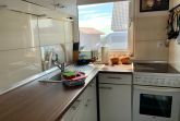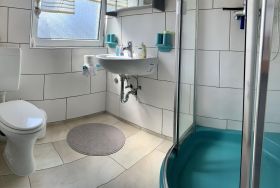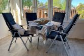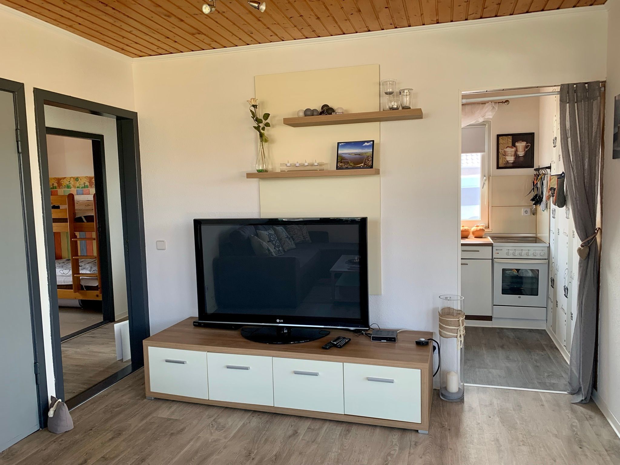 Die offene Küchenzeile ist in den Wohn- und Essbereich integriert und bietet alles Nötige für die Zubereitung leckerer Mahlzeiten. Der gemütliche Kaminofen sorgt in den kühleren Monaten für eine behagliche Atmosphäre, während eine Elektroheizung zusätzlichen Komfort bietet.