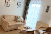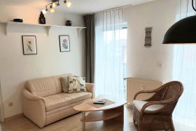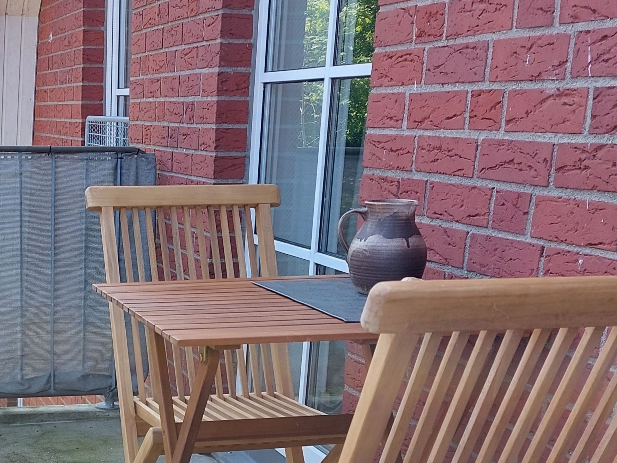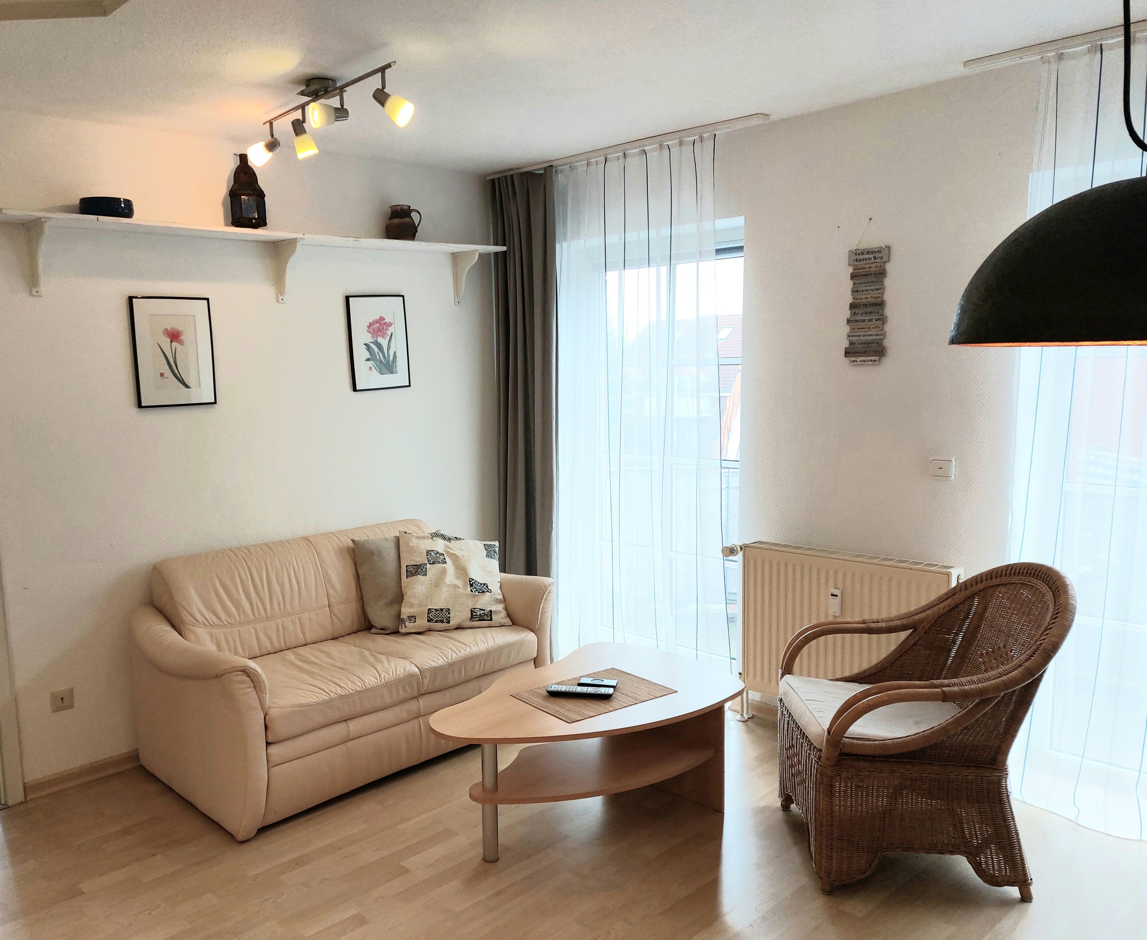 Aufgeteilt in: Wohnzimmer mit Essbereich, Schlafzimmer mit Doppelbett (140x200 cm mit einteiliger Matratze), Küchenzeile im Wohnbereich, Duschbad/WC, Balkon zur Ostseite, WLAN, PKW-Stellplatz und Fahrradbügel