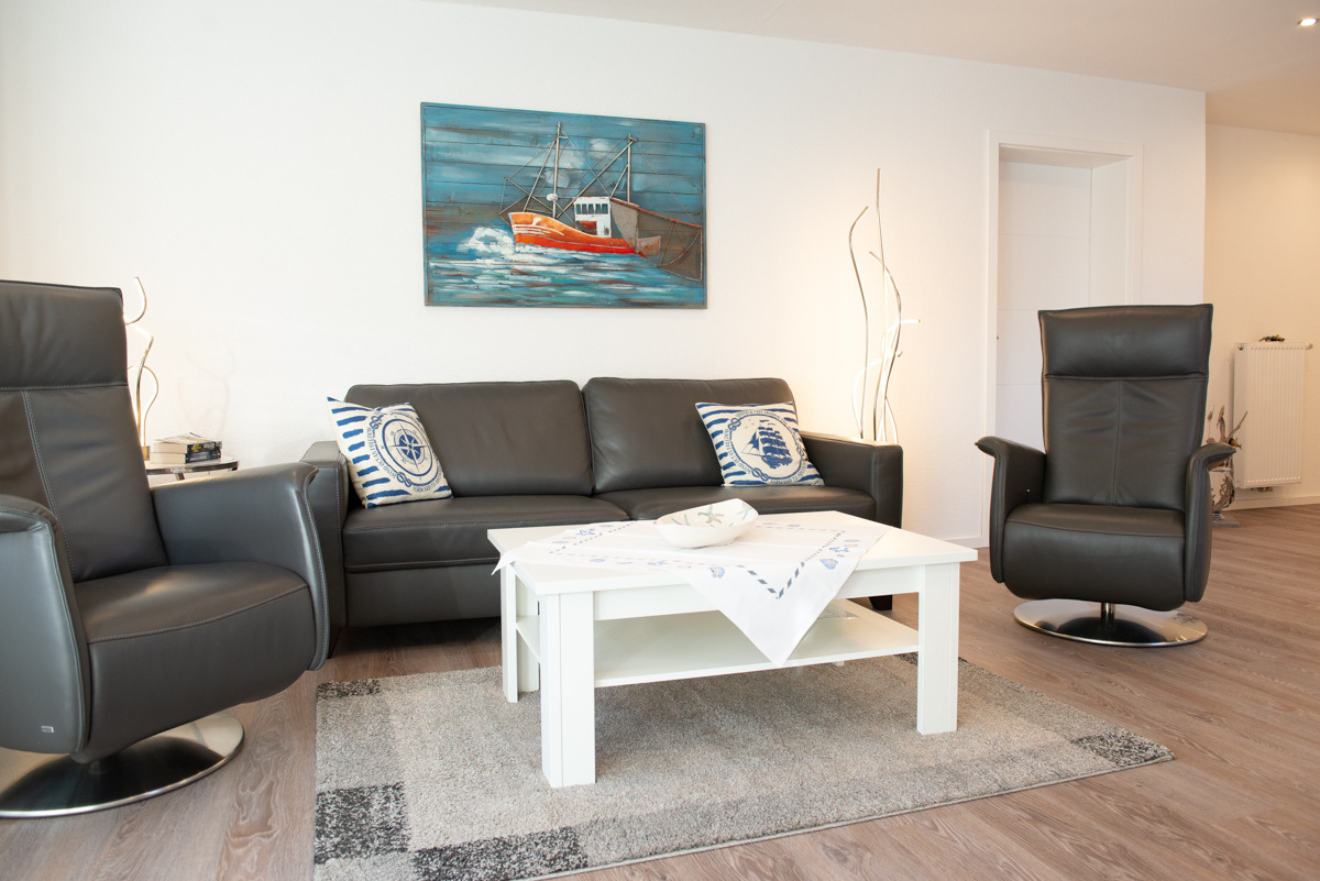 Die Ferienwohnung Deichnähe G liegt im Erdgeschoss, durch die große, moderne Diele mit Garderobe und heller Beleuchtung gelangen Sie in das Wohn/Esszimmer, das mit einer gemütlichen Couch und 2 Relaxsessel, einer kompletten Essgruppe und einer voll ausgestatteten Einbauküche eingerichtet ist.