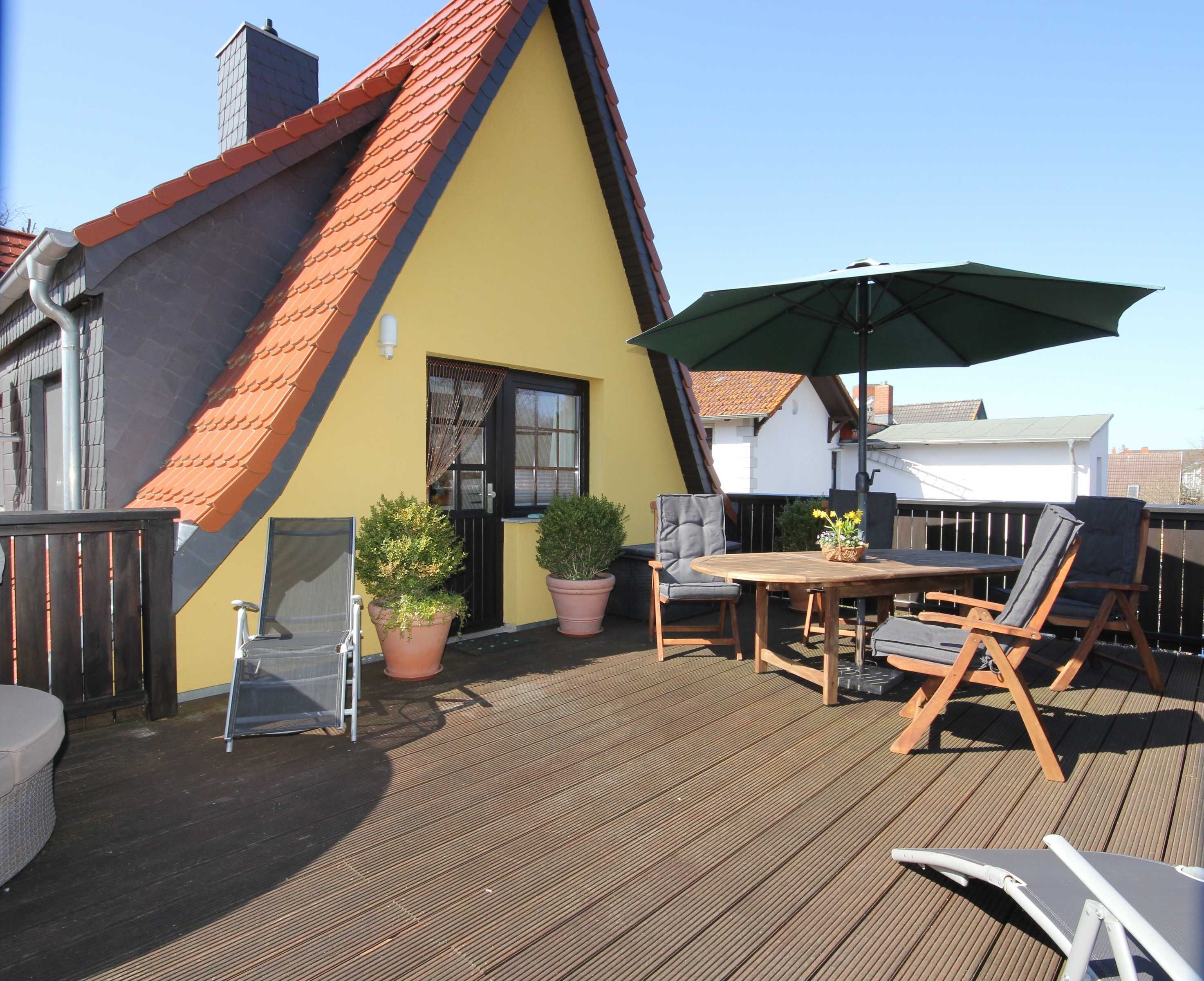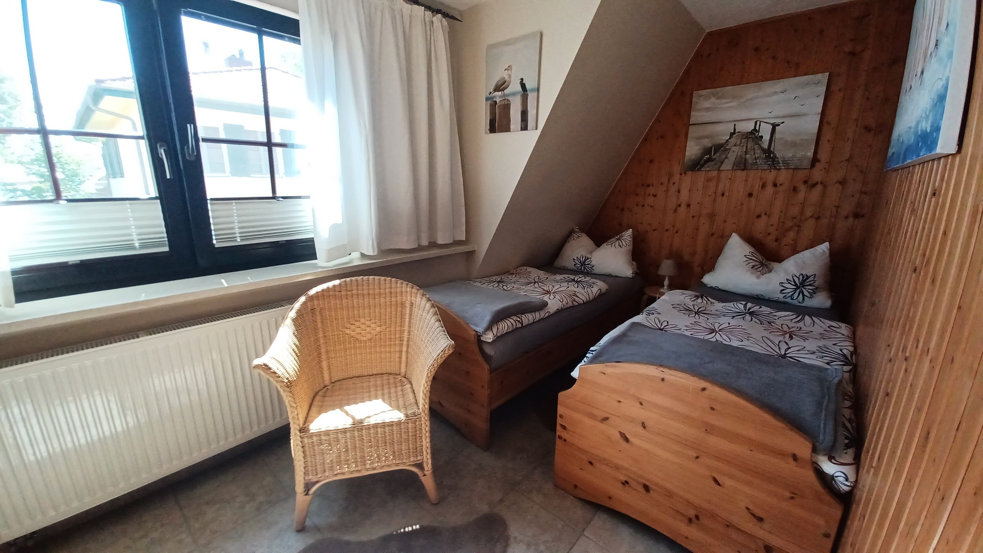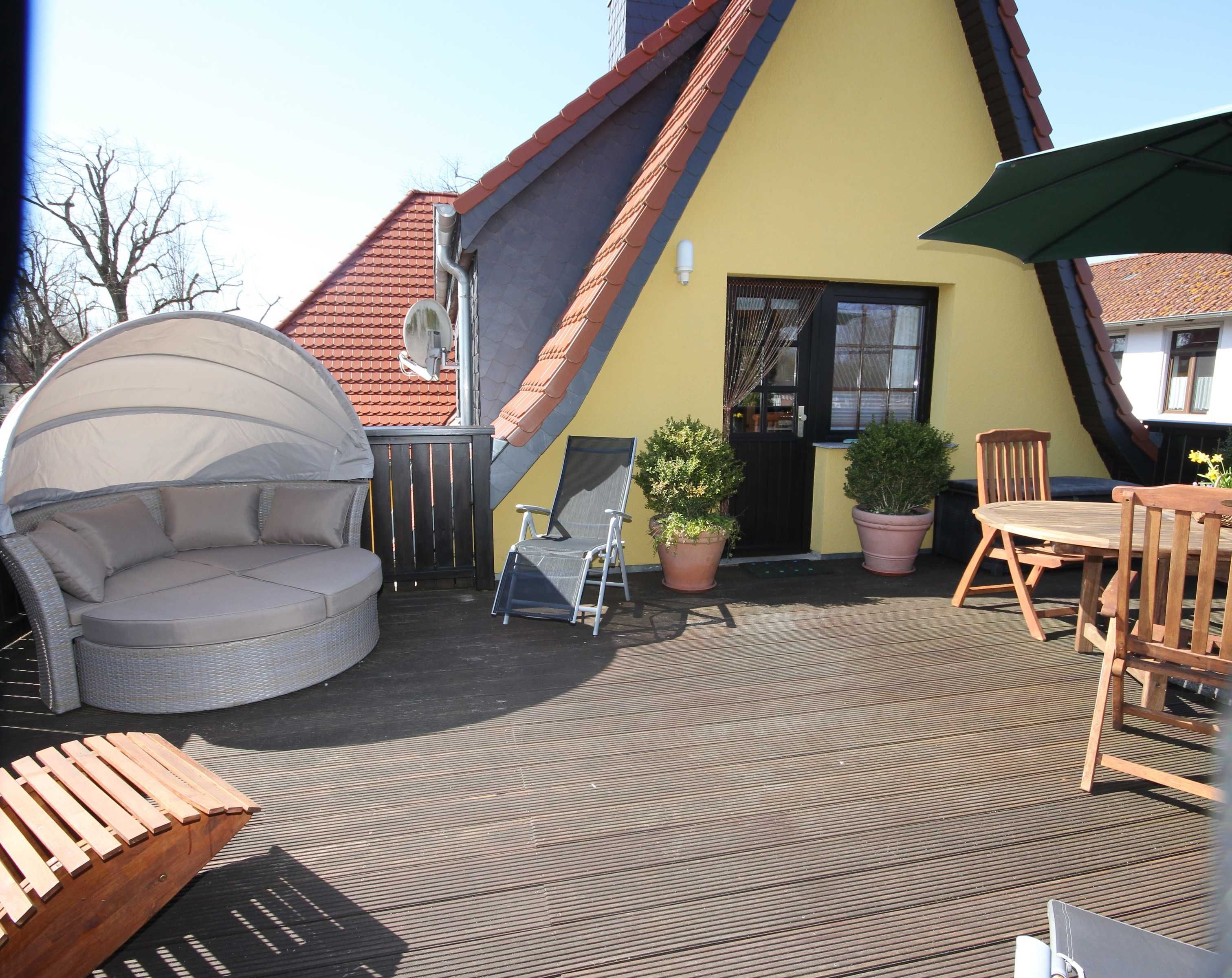 die komfortable Ferienwohnung mit liebevoller Ausstattung zum Detail und separatem Eingang über eine Freitreppe erreichbar, liegt im Obergeschoss. Genießen Sie die Nord- Ostseitige große Dachterrasse mit Gartenmöbel, einer Liegeinsel und Sonnenliegen, beim Frühstück oder lassen Sie den Abend mit einem guten Glas Wein am Strand in 250 m Entfernung ausklingen.Das Wohnzimmer verfügt über eine gemütliche Couch, kostenlosen WLAN- Gastzugang und SAT-TV. An das Wohnzimmer schließt sich die offene Küchenzeile an und ist ausgestattet mit einer Kühlschrank, und 2- Platten Cerankochfeld . Das separate Schlafzimmer verfügt über ein Doppelbett 1,80 x 2,00 m (getrennte Matratzen) und einem Kleiderschrank mit viel Stauraum.In der Ferienwohnung ist die Bettwäsche nicht vorhanden, die Handtücher können in der Zimmervermittlung für 7,00 € pro Person (1 Badetuch, 1 Handtuch) dazugebucht werden. Das Bad verfügt über eine Dusche/WC Für unsere Gäste sind die Fahrräder inclusive . Unsere Wohnungen sind Nichtraucherwohnungen. Die Kaution beträgt 100,- € und wird nach Abreise zurücküberwiesen.