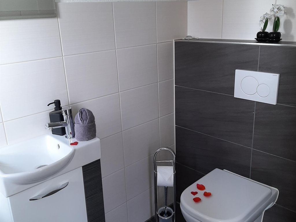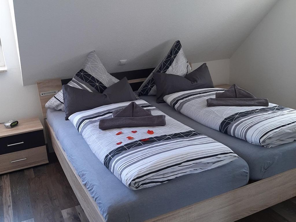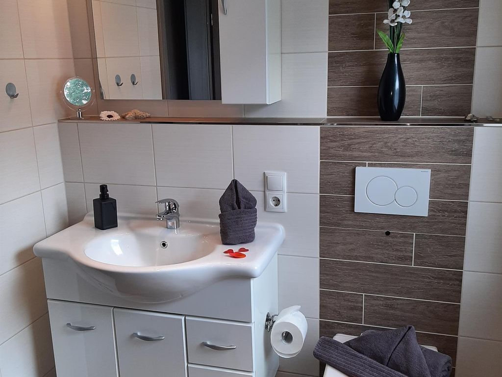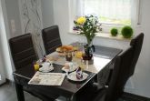 Allergikageeignetes Feriendoppelhaus (2 x 4 Betten) mit Fliesen und Laminat. Bad im OG mit ebenerdigem Duscheinstieg und separatem WC im EG. Bettwäsche und Handtücher werden kostenfrei gestellt. Keine Haustiere. Nichtraucherhaus. Möblierte Terasse mit Grill + Gartenschirm. Elektrische Jalousien am Terassenfenster. Jedes Zimmer ist verdunkelbar. Fliegengitter in den Schlafzimmern und im Bad. Kaffemaschine, Geschirspühler, Mikrowelle, Mixer, Gerfrierfach, Kosmetikspiegel, Safe, Kinderhochstuhl, Spiele und Lesematerial. Die Wohnzimmercouch ist ausziehbar. W-Lan gegen Gebühr.