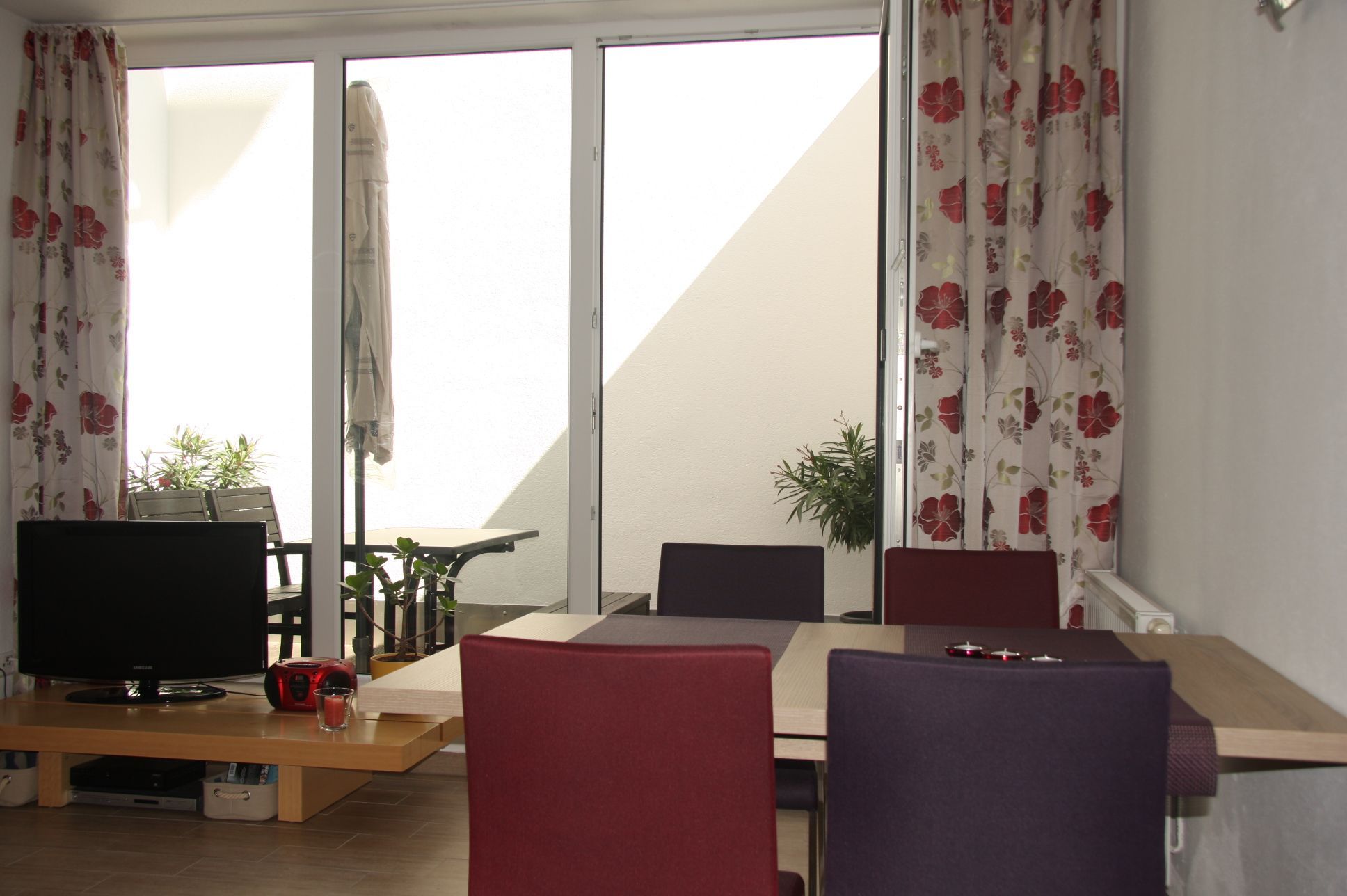 - windgeschützte Souterrain-Terrasse, ca. 5 x 2,30m, Sonnenschirm