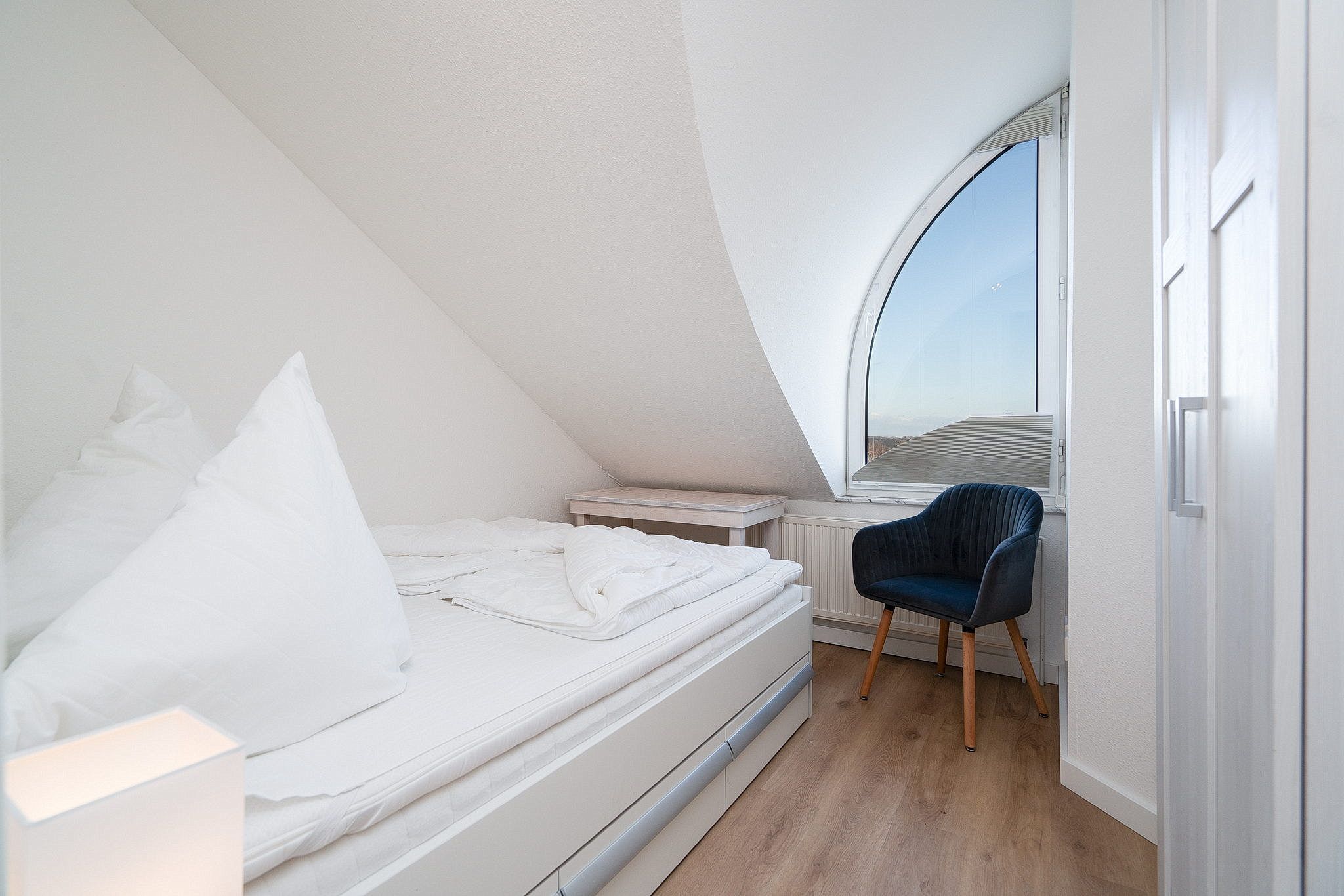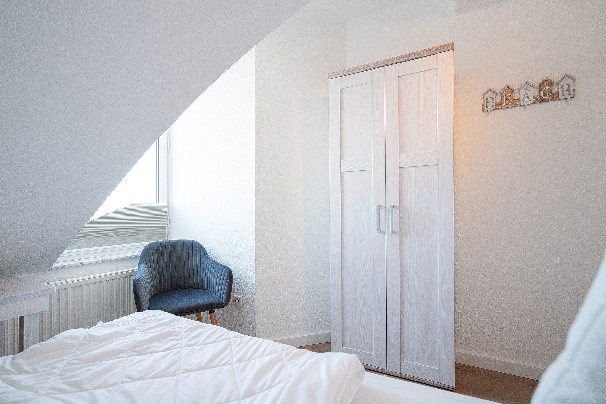 Das Schlafzimmer verfügt über ein kleines Doppelbett (140x200cm), einen 2-türigen Kleiderschrank. Das Zimmer ist mit Laminat ausgelegt und lässt sich durch ein Plissee blickdicht verdunkeln.