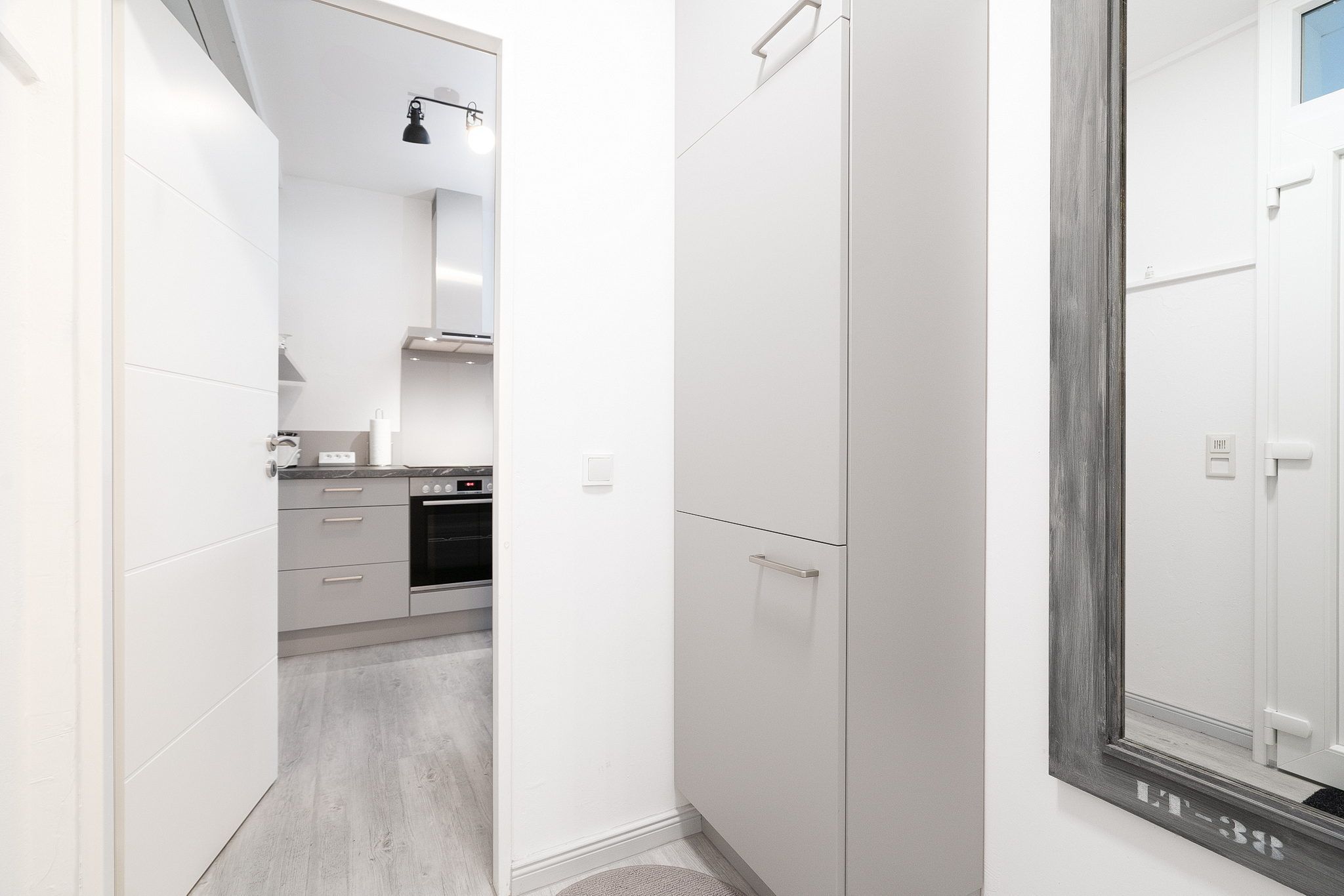 Moderne, komplett eingerichtete, zum Wohnbereich offene Küche. Die Küche ist mit einem Ceran-Kochfeld, einer Spülmaschine, einem Wasserkocher, Toaster, Kaffeemaschine und einem Kühlschrank mit kleinem Gefrierfach ausgestattet.