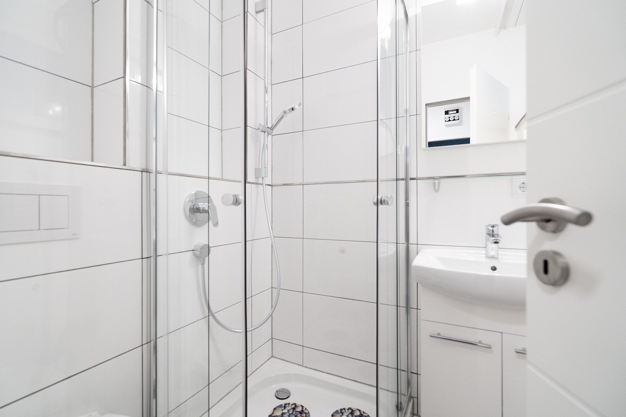 Kleines, freundliches, Tageslichtbad mit Dusche, WC und Waschbecken.