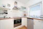 Die komplett ausgestattete, offene Küche verfügt über ein 4 Platten-Ceran-Kochfeld, einen Backofen, einen Kühlschrank mit kleinem 3-Sterne Gefrierfach sowie ein Wasserkocher, eine Kaffeemaschine und ein Toaster.
