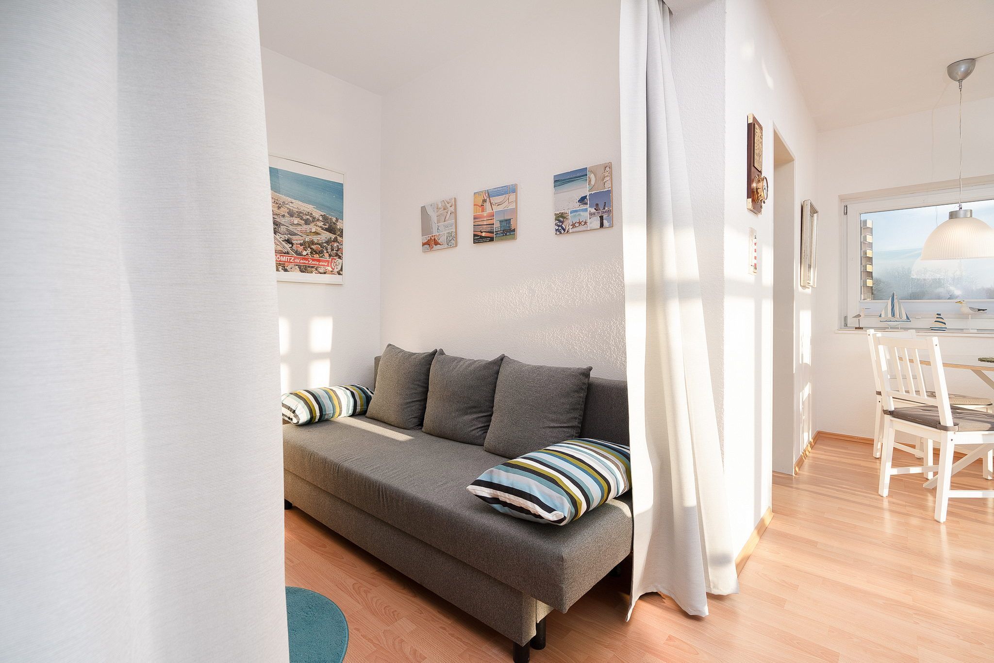In dem hellen und gemütlichen Wohn- und Esszimmer befindet sich eine Eckcouch, ein Sessel, ein Couchtisch, ein Essplatz für 4 Personen und ein Wohnzimmerschrank. Zur Unterhaltung steht Ihnen ein Flachbildfernseher und ein Radio zur Verfügung. In einer separaten Nische, diese durch einen Vorhang abgetrennt ist, befindet sich ein Etagenbett sowie ein Schlafsofa. Das Wohn- und Esszimmer ist mit Laminatboden ausgelegt.