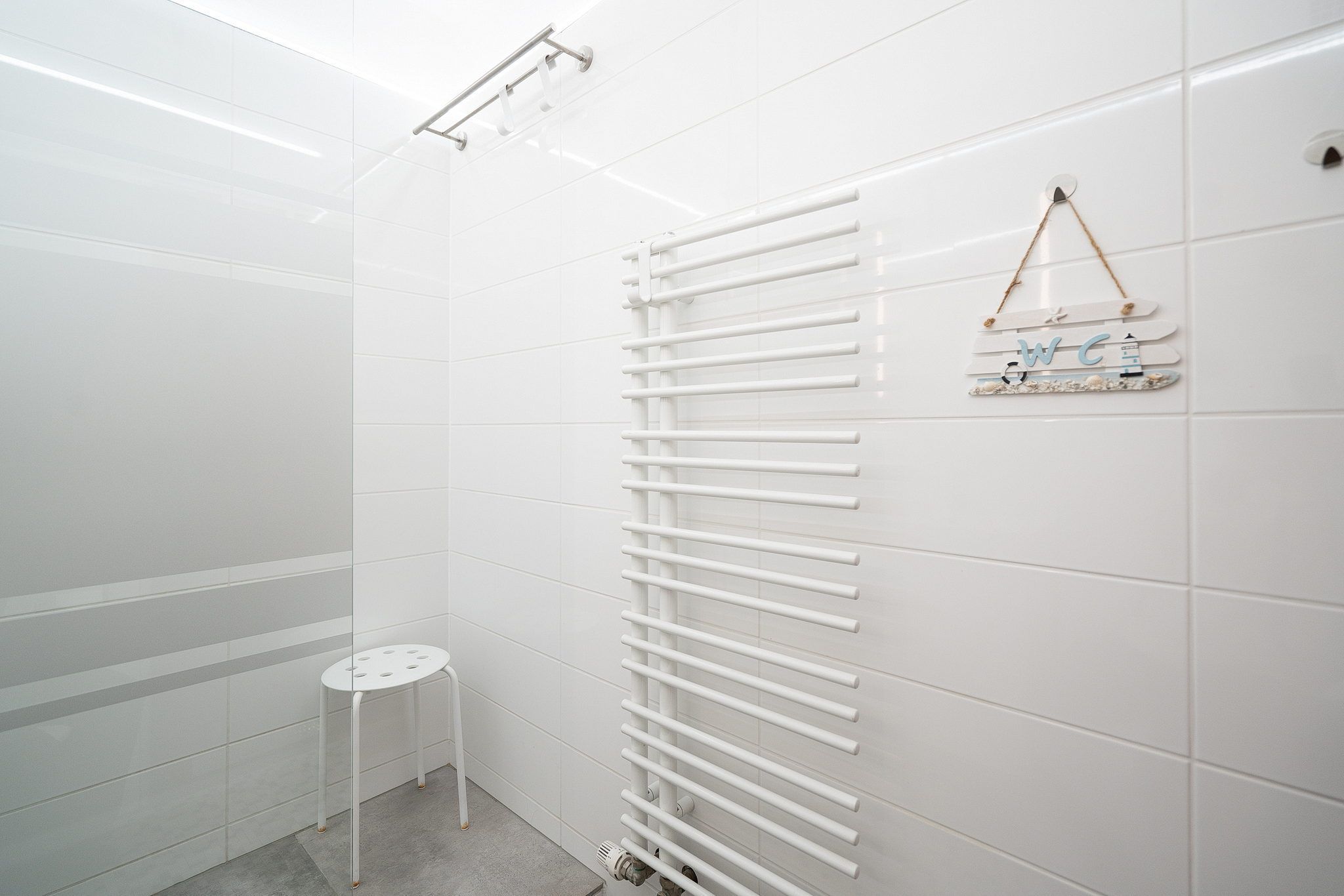 Modernes, helles und freundliches Badezimmer mit einer bodentiefen Dusche, einem Waschbecken und einem WC.