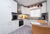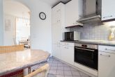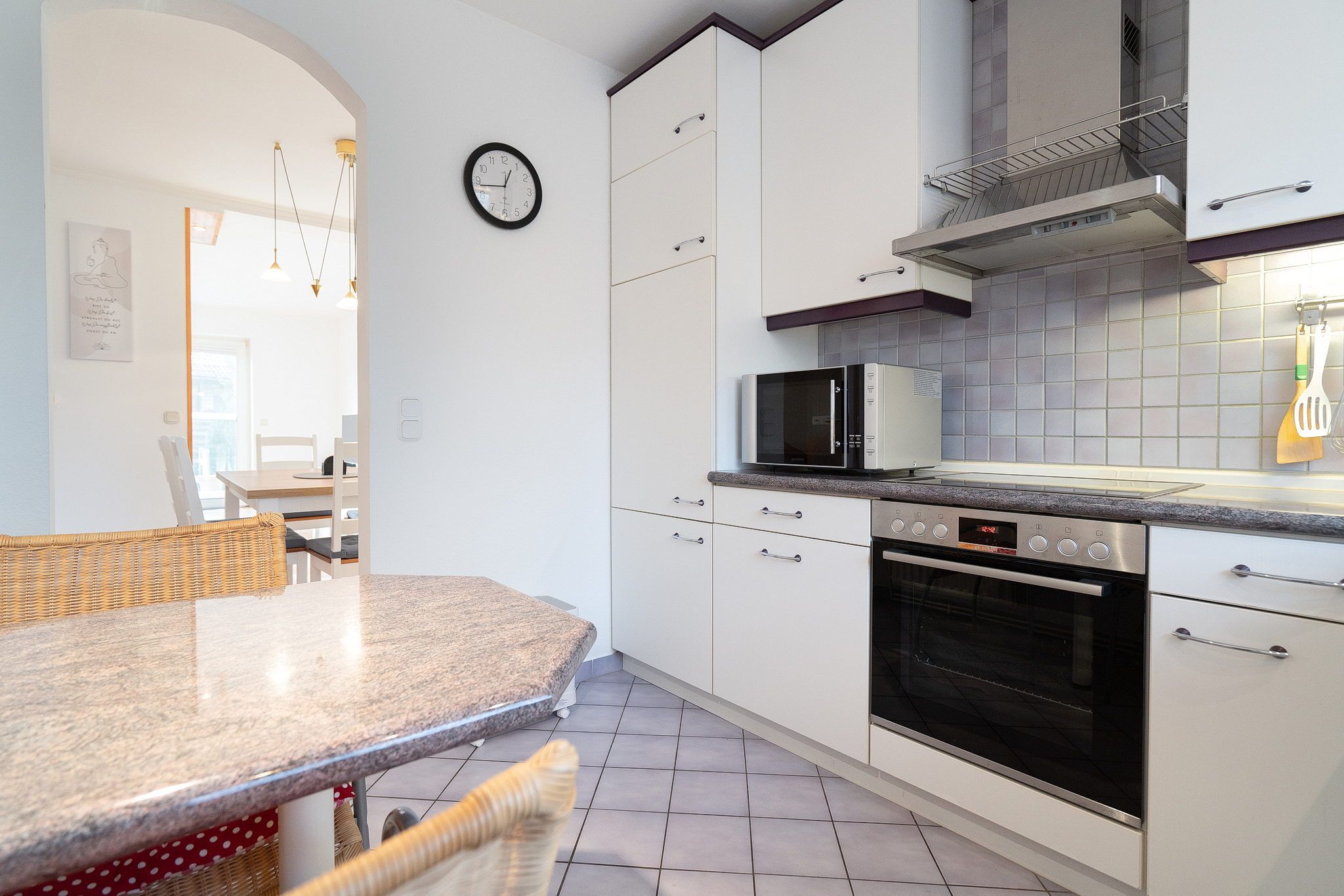 Eine abgeteilte, komplett ausgestattete Küche mit einem Tisch mit 2 Stühlen gefindet sich im Erdgeschoss. Es gibt eine Spülmaschine, Mikrowelle, Wasserkocher, Kaffeemaschine, Toaster sowie einen Backofen und 4 Platten Herd.