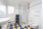 Modernes, hell gefliestes Tageslichtbad mit Dusche, WC und Waschbecken ist im Obergeschoss. Im Erdgeschoss befindet sich noch eine Gäste-Toilette mit Waschbecken.