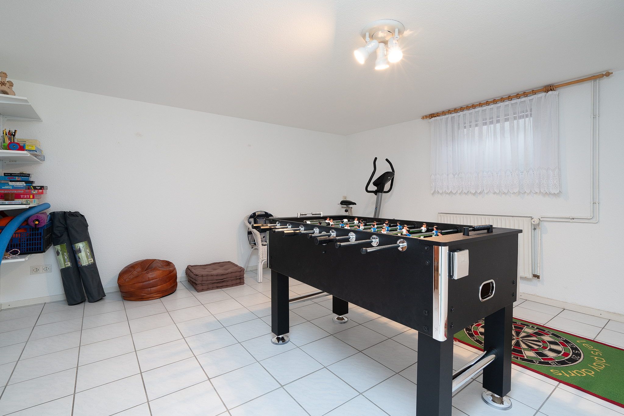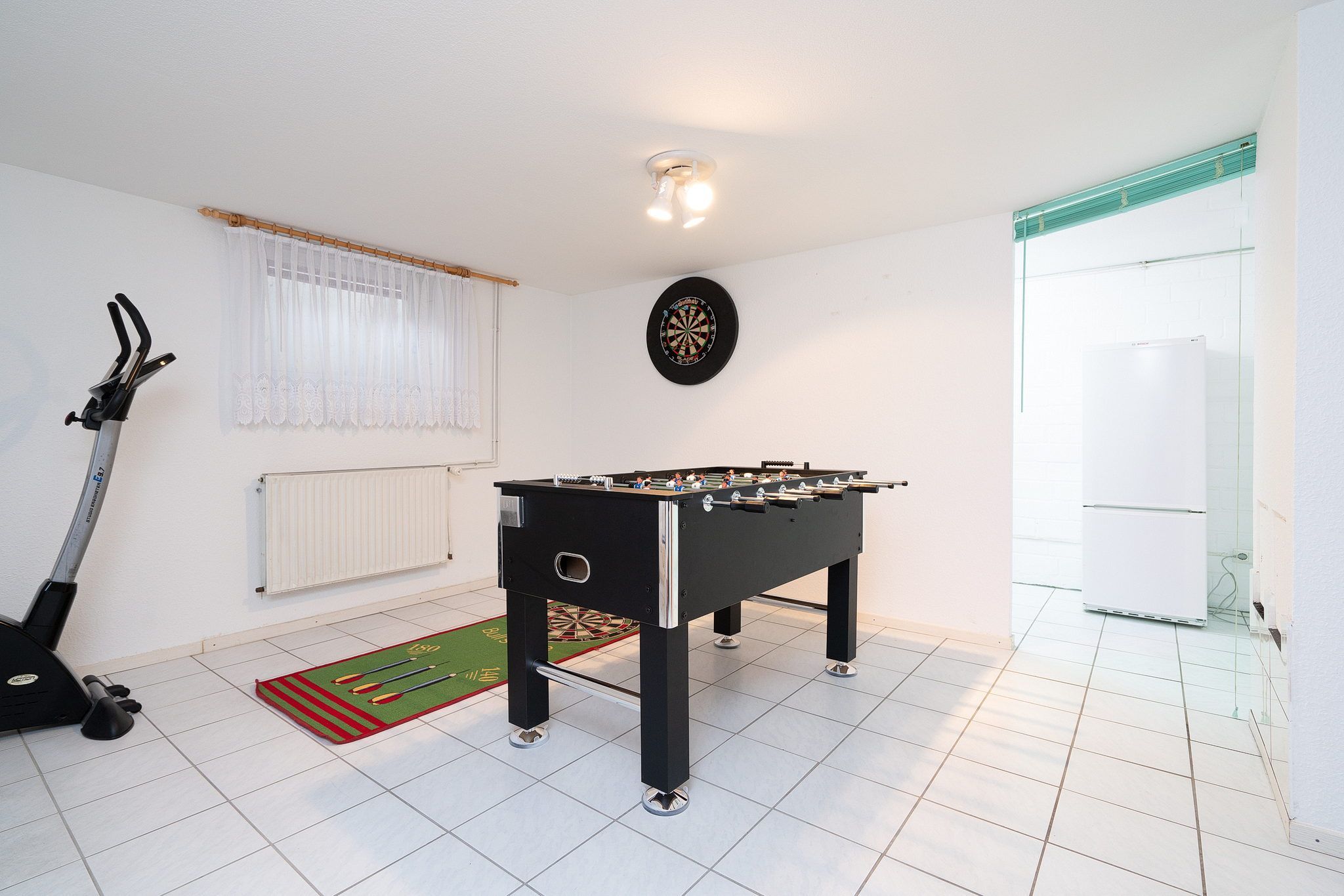 Das große Wohnzimmer (Laminatboden) ist mit Sat-TV ausgestattet. Es verfügt über 2 Sessel und eine Couch, sowie einen Esstisch mit 6 Stühlen. Es befindet sich im Erdgeschoss.