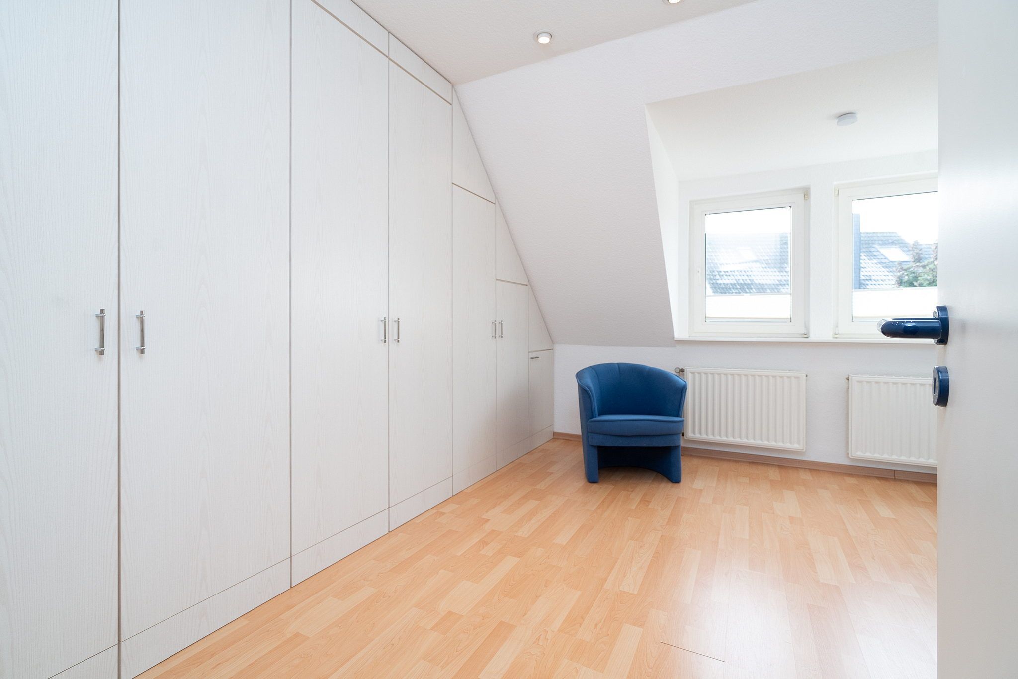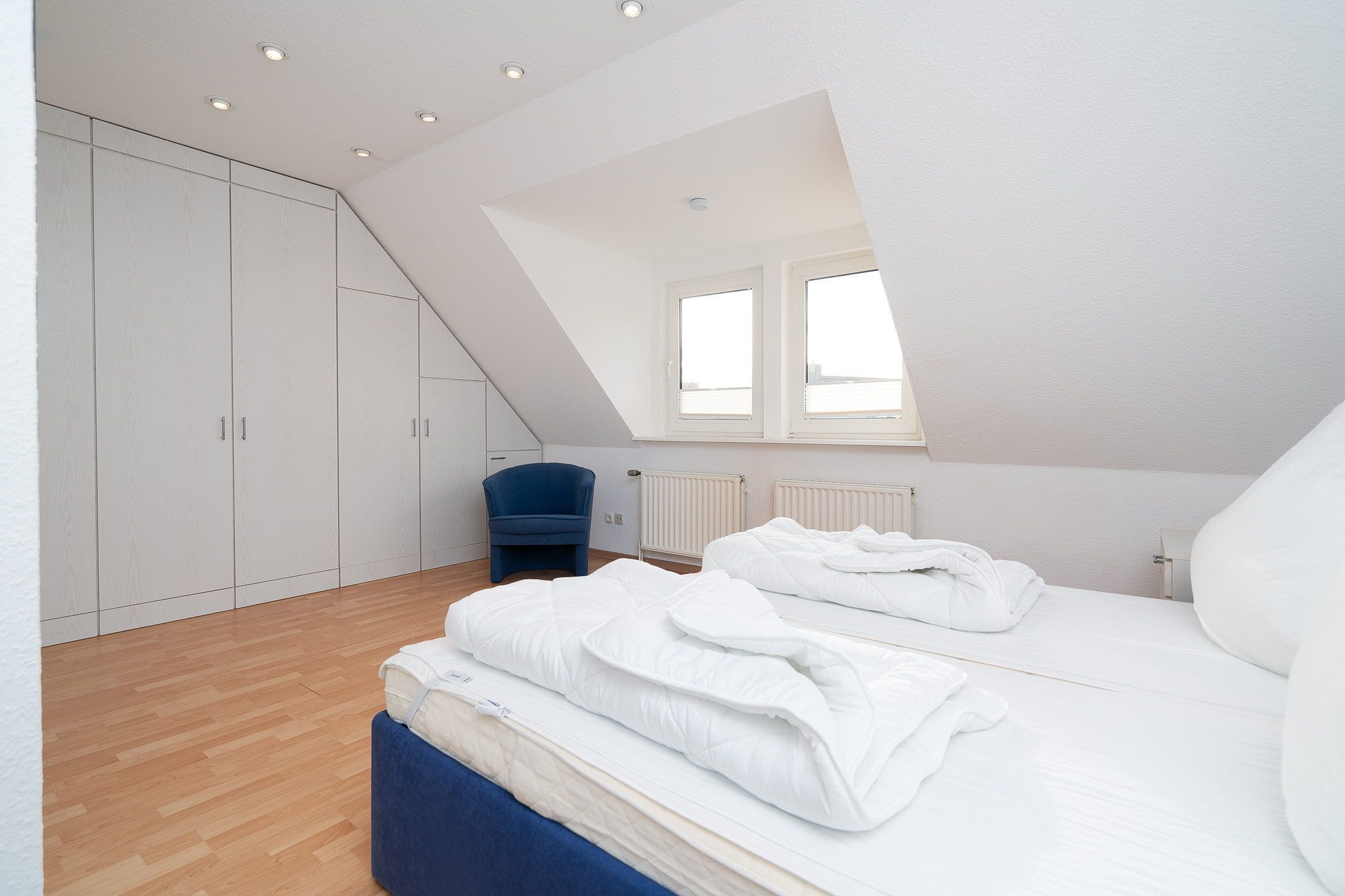 Das Schlafzimmer befindet sich im Obergeschoss und ist mit einem Doppelbett (Größe: 2x90x200cm) und einem Kleiderschrank ausgestattet. Die Fenster lassen sich mit Plissees verdunkeln.