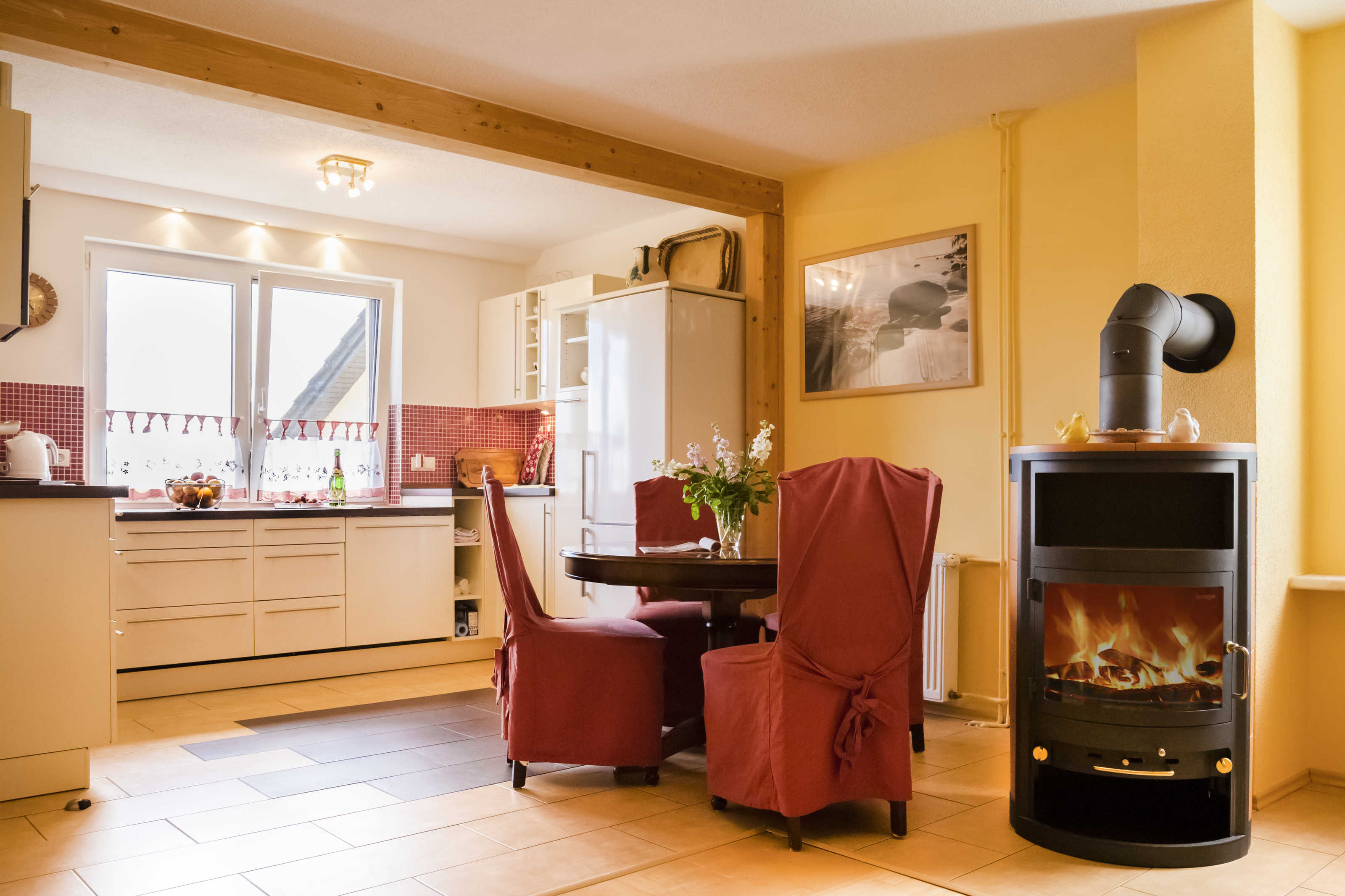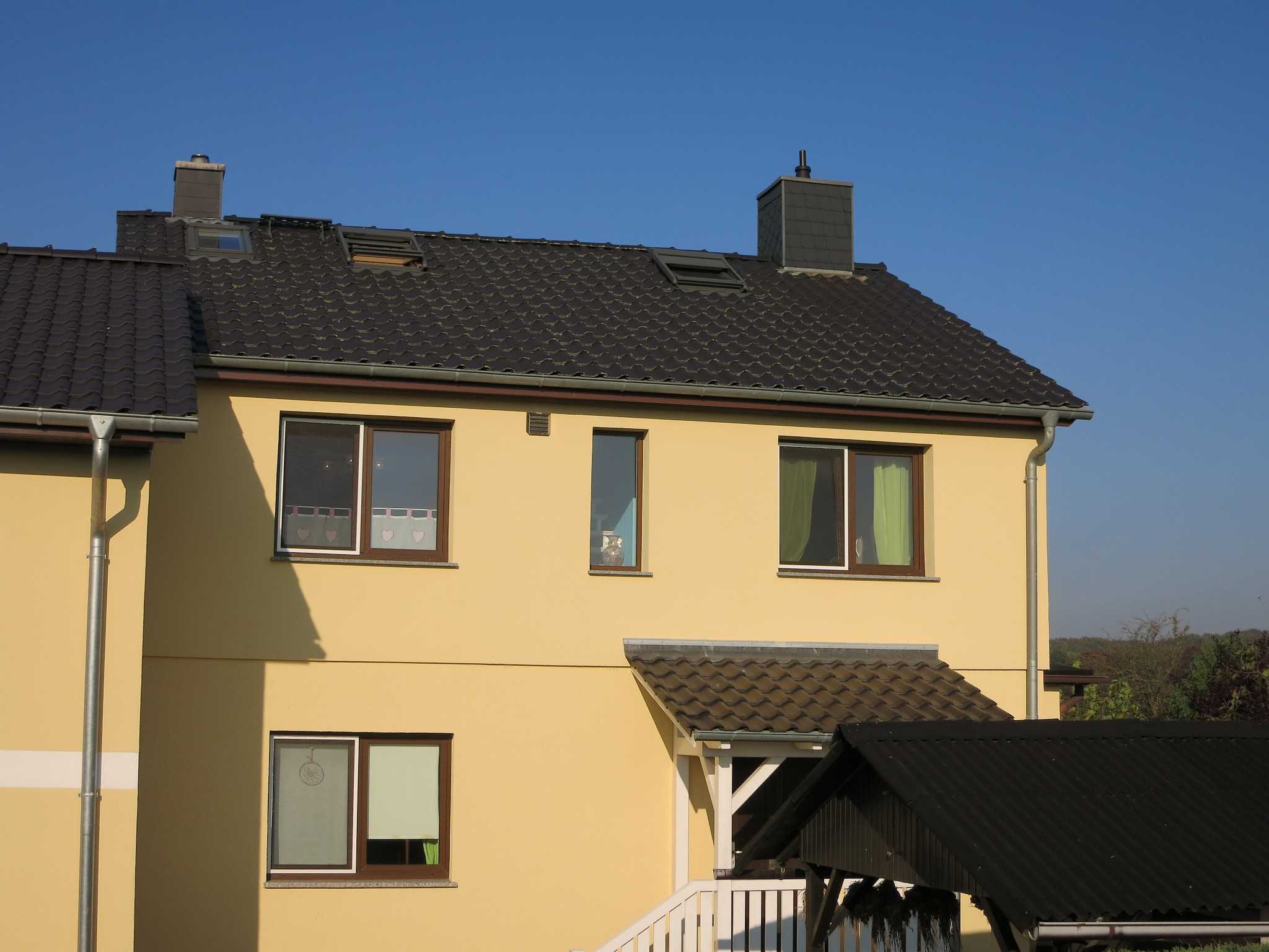 Eine großzügige Nichtraucher-Ferienwohnung befindet sich im Obergeschoss unseres Hauses und ist nur über eine Treppe erreichbar. Das Wohnzimmer ist mit Kaminofen und Parkettfußboden ausgestattet. Hier befinden sich eine große Eckcouch für kuschelige Kamin- und Fernsehabende. Zusätzlich befinden sich dahinter 2 Schlafsofas für je einen Erwachsenen. Das Bad hat eine Fußbodenheizung, Badewanne und Dusche. Es gibt ein kleines Ankleidezimmer mit großem Kleiderschrank, Schreibtisch und Sessel, durch welches Sie über eine Treppe auf den Dachboden gelangen. Hier geht es kuschelig zu. Dort befinden sich in niedriger Raumhöhe (ca. 1.75 m an höchster Stelle des Spitzdaches) ein Schlafzimmer mit Doppelbett sowie ein Schlafzimmer mit einem Kinderbett (Länge 1,30 m). Im Bett liegend können Sie durch die Dachfenster den Sternenhimmel bewundern.