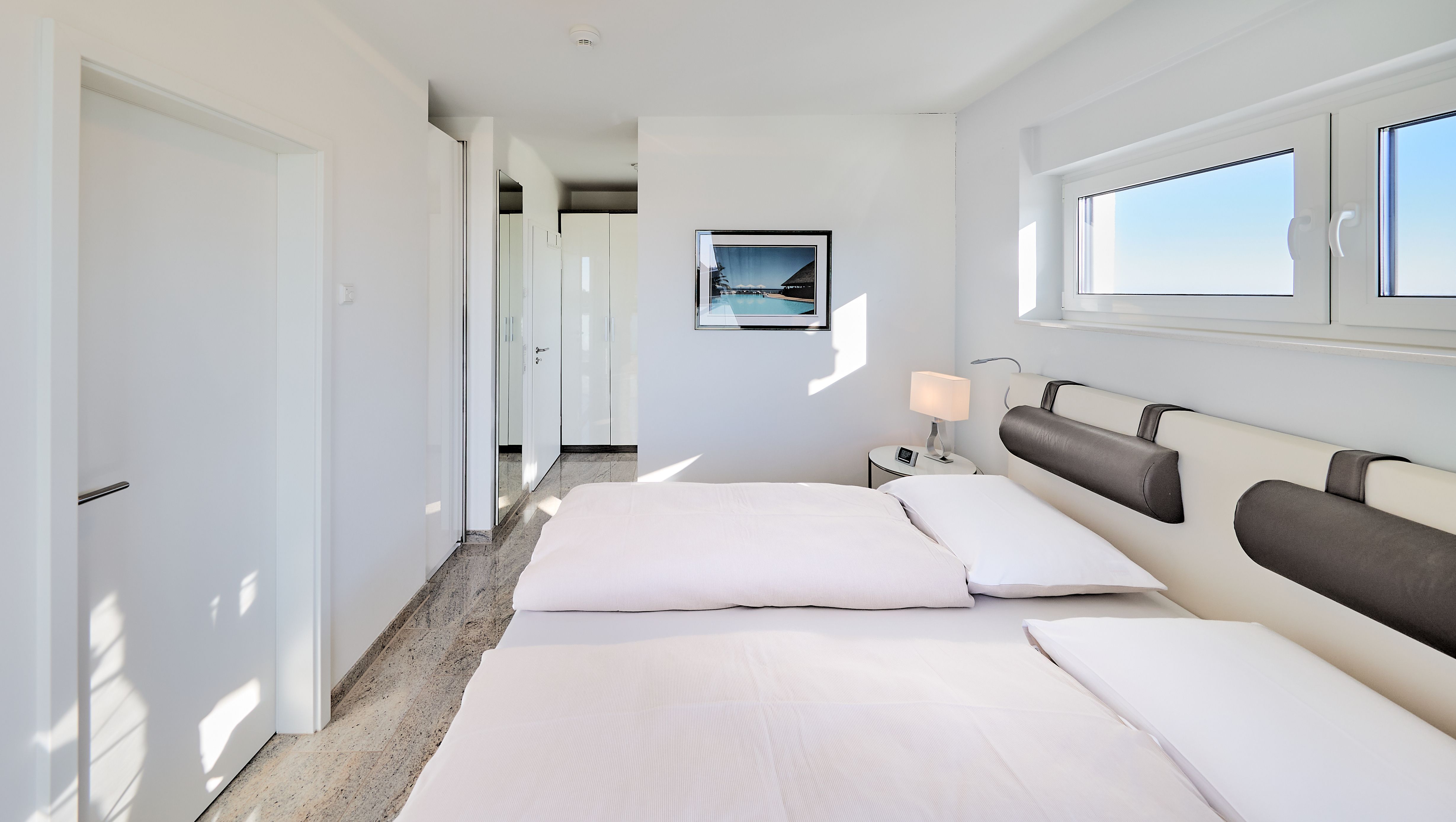 Das Appartement verfügt über zwei geschmackvoll eingerichtete Schlafbereiche. Der Hauptschlafbereich mit direktem Zugang zum Balkon bietet ein großzügiges Ankleidezimmer mit viel Stauraum und ein modernes Masterbad mit Dusche, die mit einem klappbaren Duschsitz ausgestattet ist, sowie ein WC perfekt für einen längeren Aufenthalt. Das zweite Schlafzimmer ist ideal für Kinder oder weitere Gäste. Es ist mit einem Hemnes-Ausziehbett ausgestattet, das sich von 80x200 cm auf 160x200 cm erweitern lässt. Auch steht Ihnen hier genügend Staufläche und ein TV zur Verfügung.