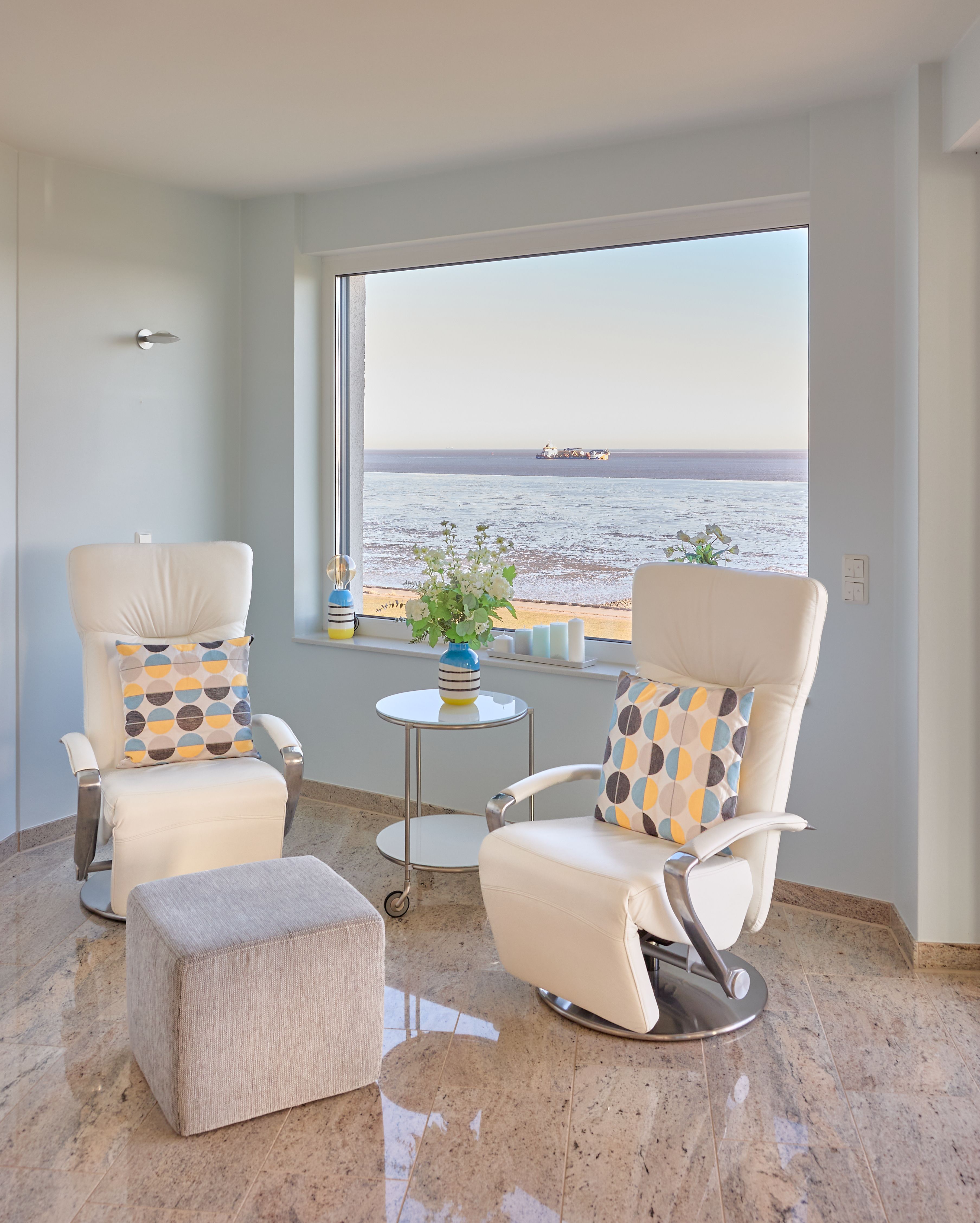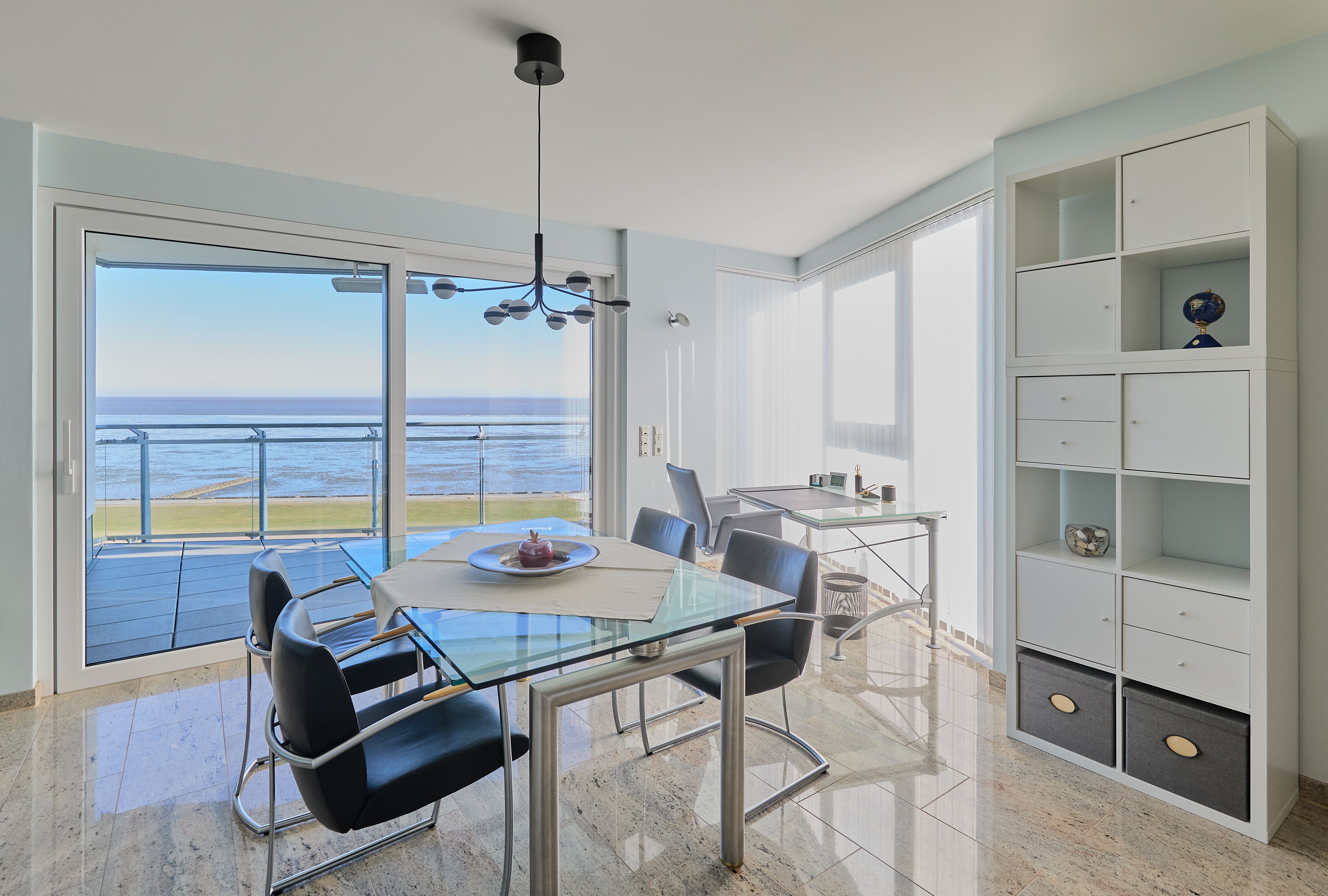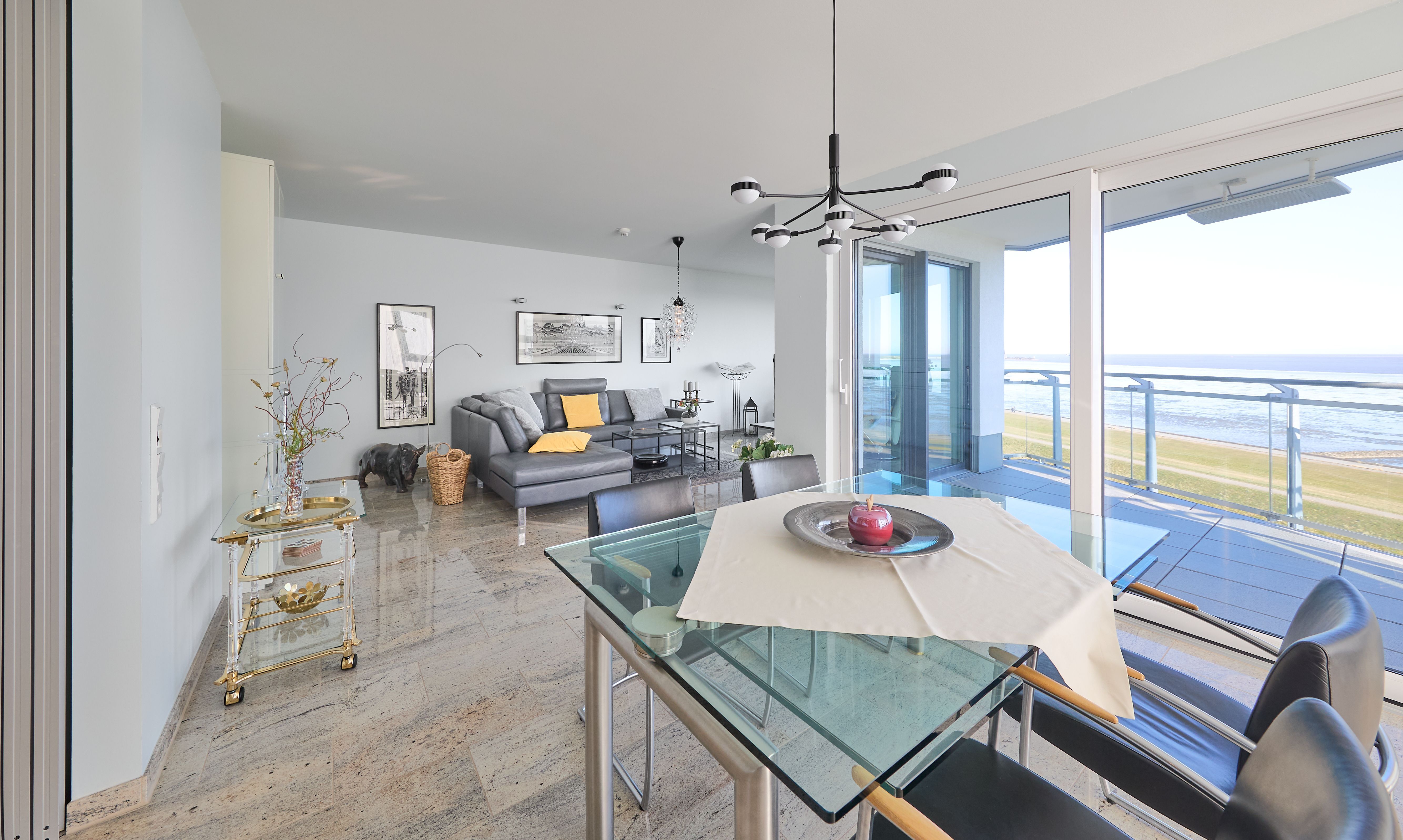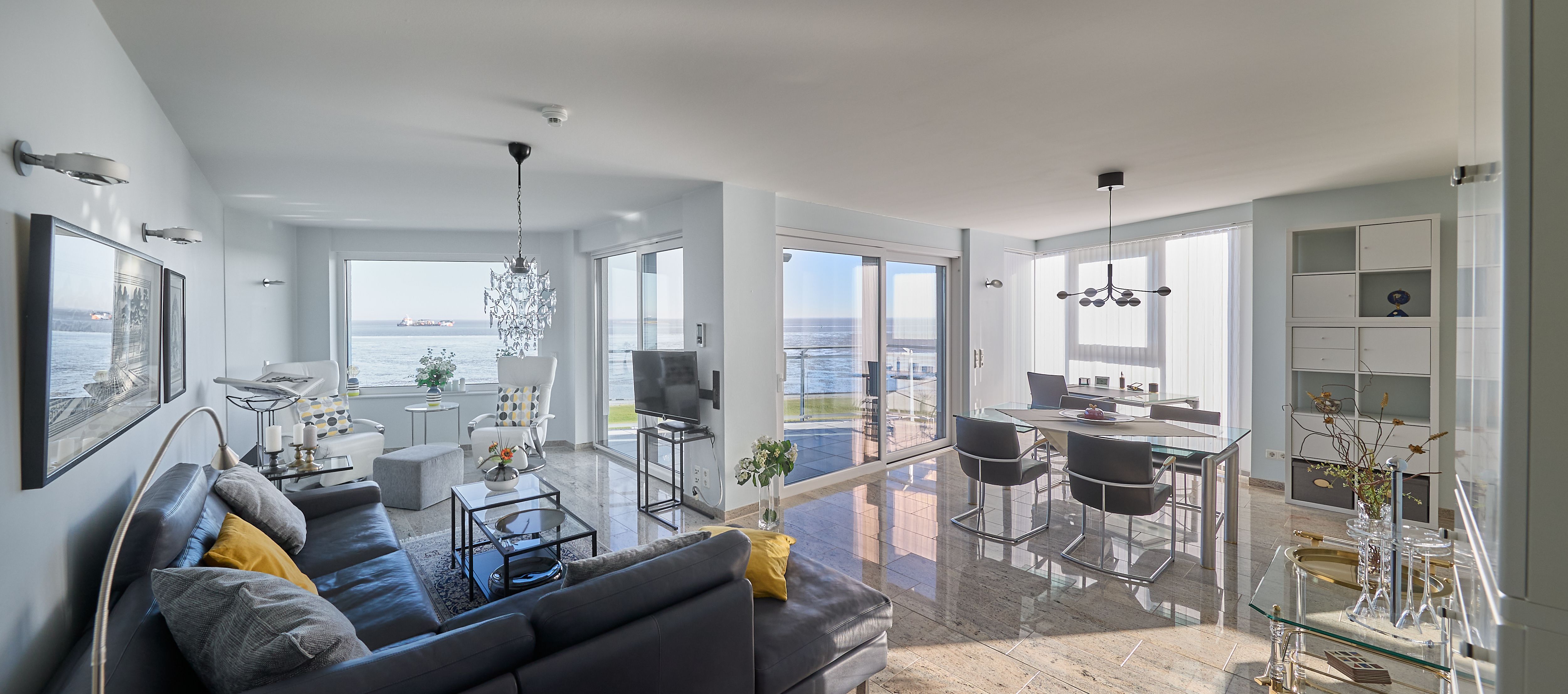 Im Wohnbereich sorgen eine hochwertige Eck-Ledercouch und zwei Sessel, die zum Fenster ausgerichtet sind, für eine gemütliche Atmosphäre. Hier können Sie entspannen und den Blick auf die Elbmündung oder die vorbeiziehenden Schiffe genießen. Der Balkon bietet einen geschützten Platz, um die frische Meeresluft zu genießen selbst bei kühleren Brisen. Die gesamte Wohnung ist mit hochwertiger Beleuchtung und zur zusätzlichen Komfortverbesserung auch mit Lichtbewegungsmeldern, z.B. im Flur ausgestattet. Im Flur finden Sie neben der offenen Garderobe auch einen großen Garderobenschrank vor.