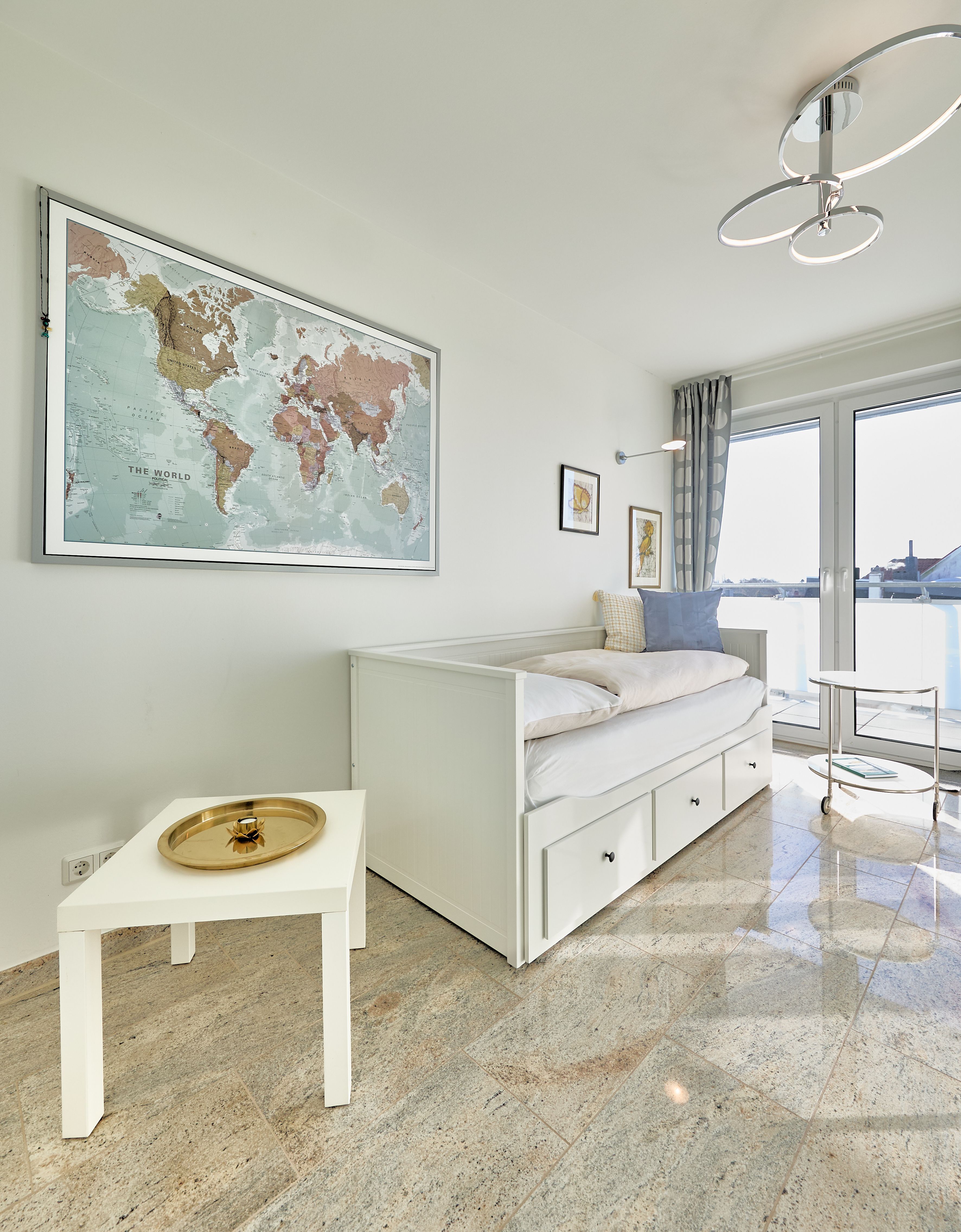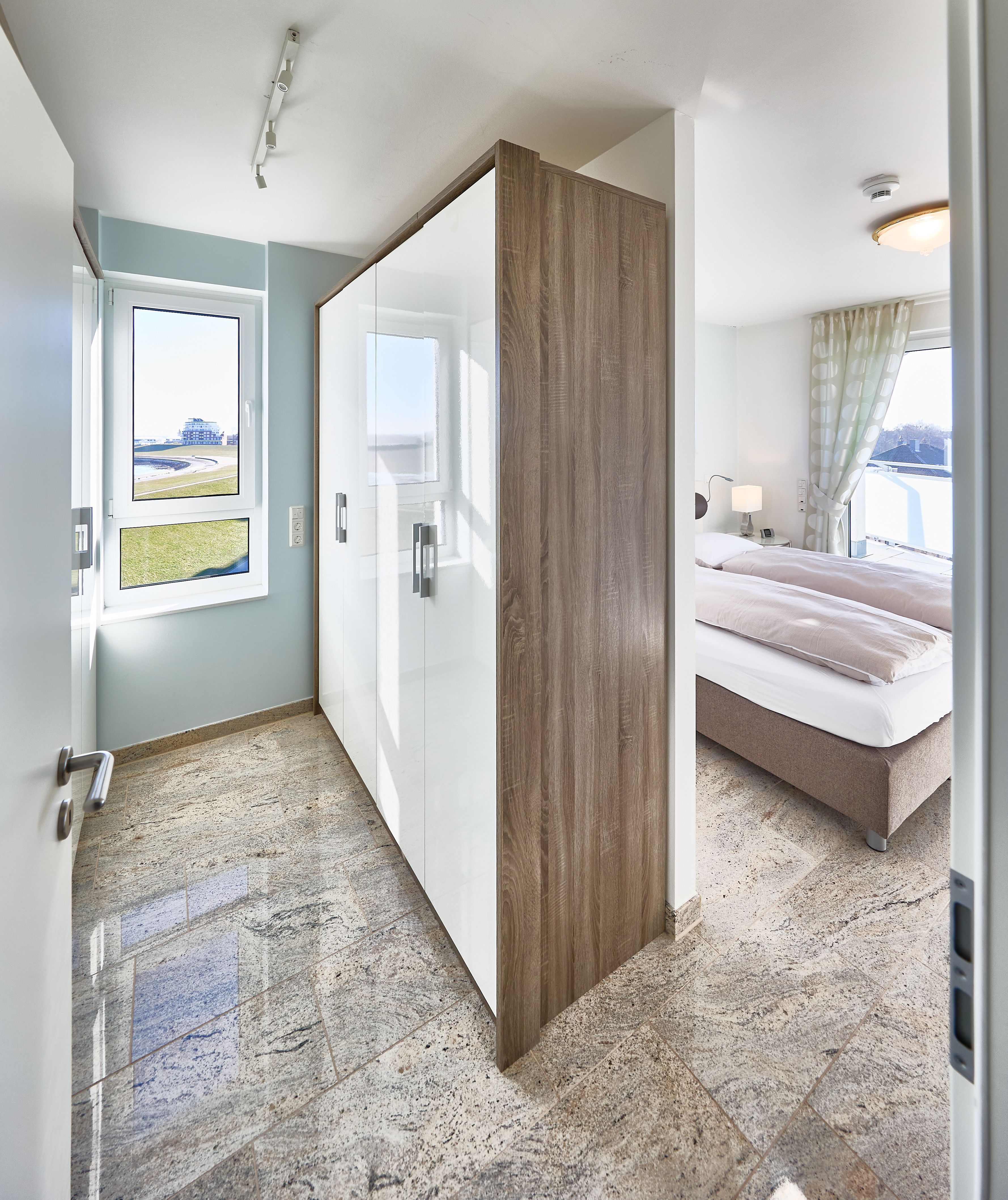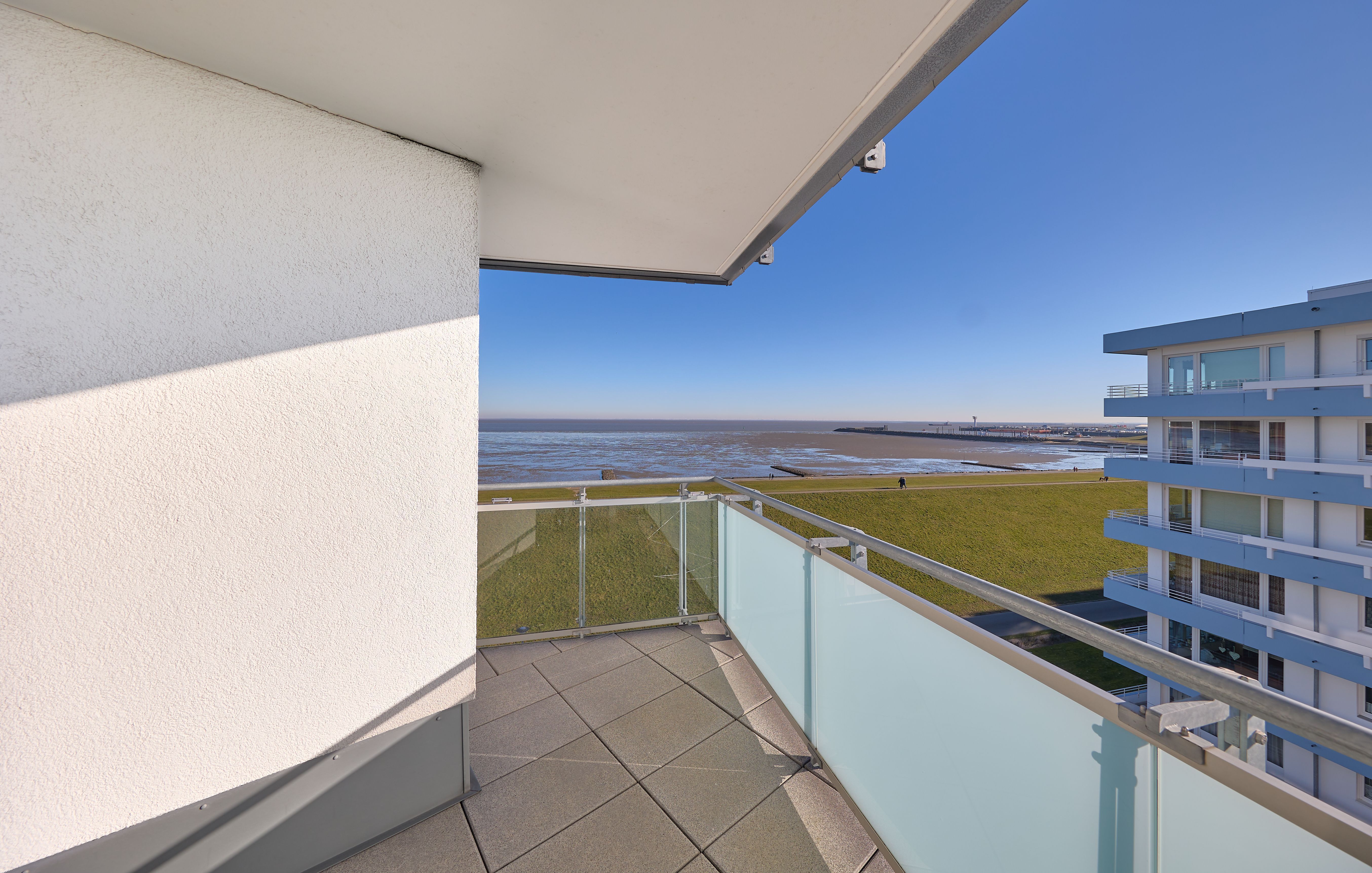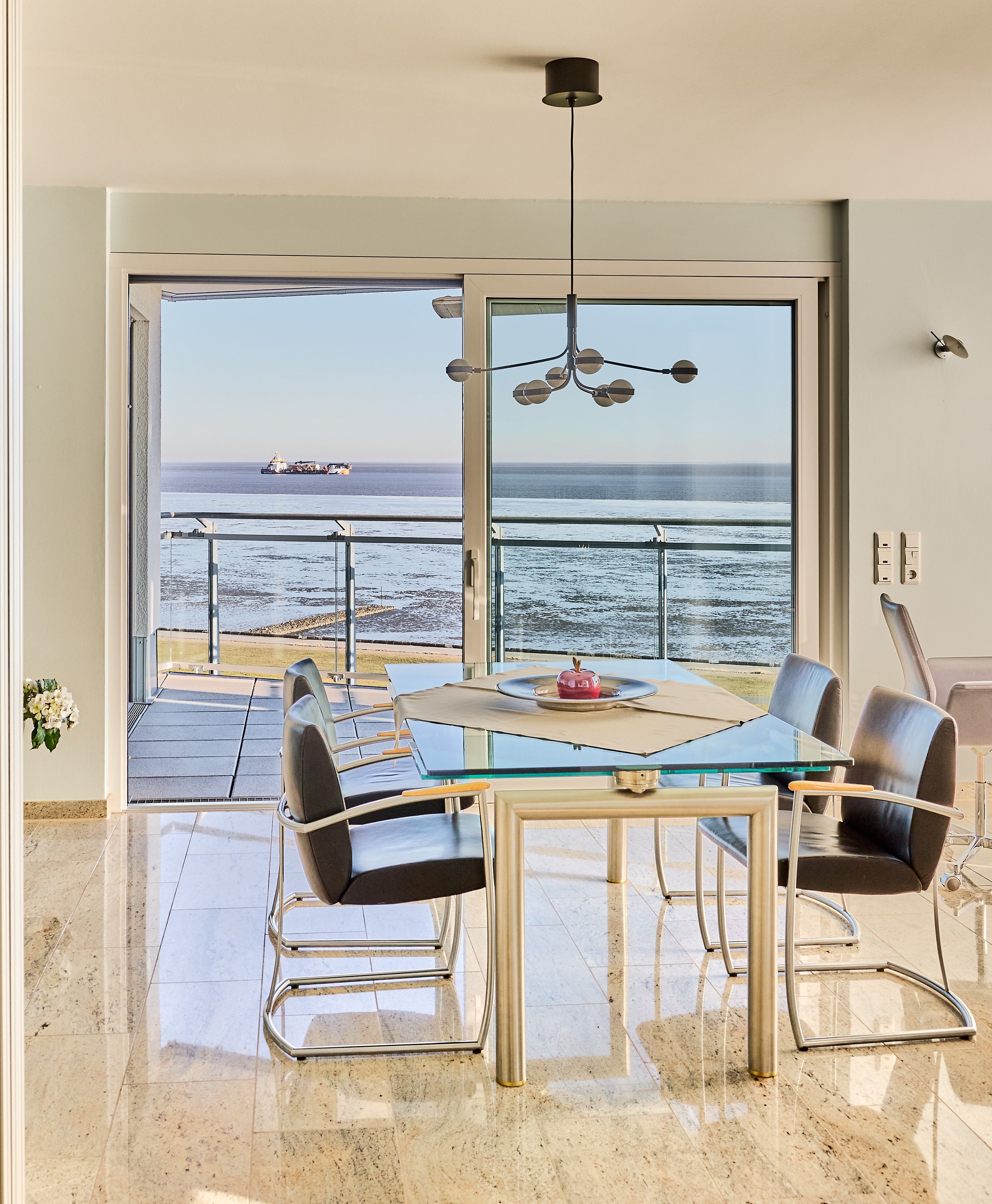 Im Wohnbereich sorgen eine hochwertige Eck-Ledercouch und zwei Sessel, die zum Fenster ausgerichtet sind, für eine gemütliche Atmosphäre. Hier können Sie entspannen und den Blick auf die Elbmündung oder die vorbeiziehenden Schiffe genießen. Der Balkon bietet einen geschützten Platz, um die frische Meeresluft zu genießen selbst bei kühleren Brisen. Die gesamte Wohnung ist mit hochwertiger Beleuchtung und zur zusätzlichen Komfortverbesserung auch mit Lichtbewegungsmeldern, z.B. im Flur ausgestattet. Im Flur finden Sie neben der offenen Garderobe auch einen großen Garderobenschrank vor.