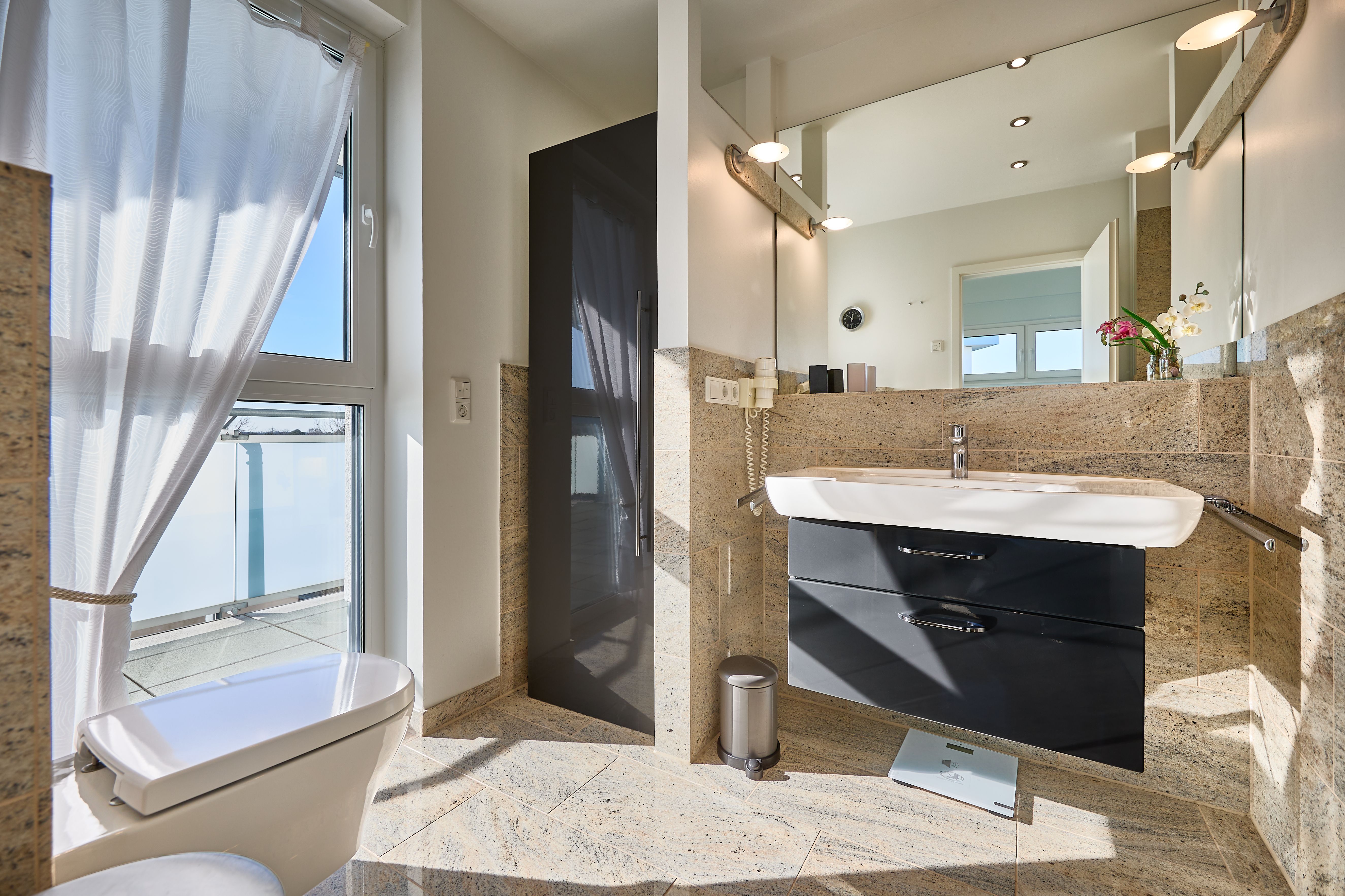 Zahlreiche Annehmlichkeiten und viel Stauraum machen Ihren Aufenthalt besonders komfortabel. Ein Fahrstuhl und ein Fahrradraum stehen Ihnen zur Verfügung, ebenso ein für Sie zu nutzender Waschraum mit einer Miele Waschmaschine und ein Miele Trockner. Ein reservierter Garagenstellplatz mit 210cm Einfahrtshöhe und einer 240cm breiten Einfahrt, bietet zusätzlichen viel Platz für Fahrräder oder E-Bikes und verfügt über eine Lademöglichkeit für Ihre E-Akkus der Fahrräder.
