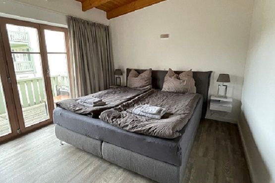 Im Obergeschoss Duschbad mit Fenster, WC und Fön, Schlafzimmer mit TV, Balkon 6 m²