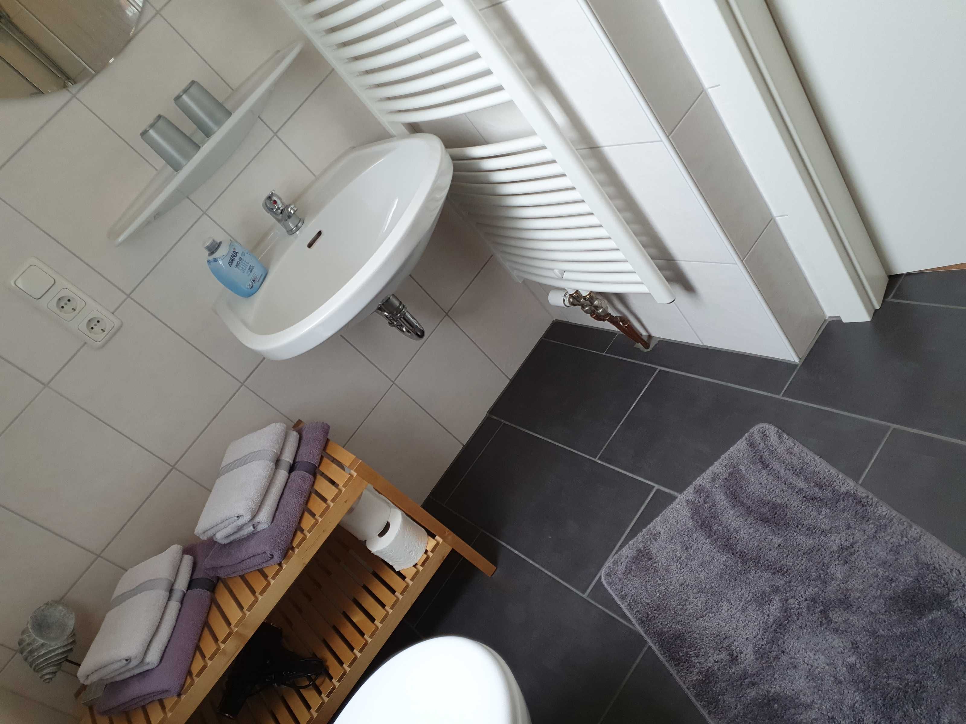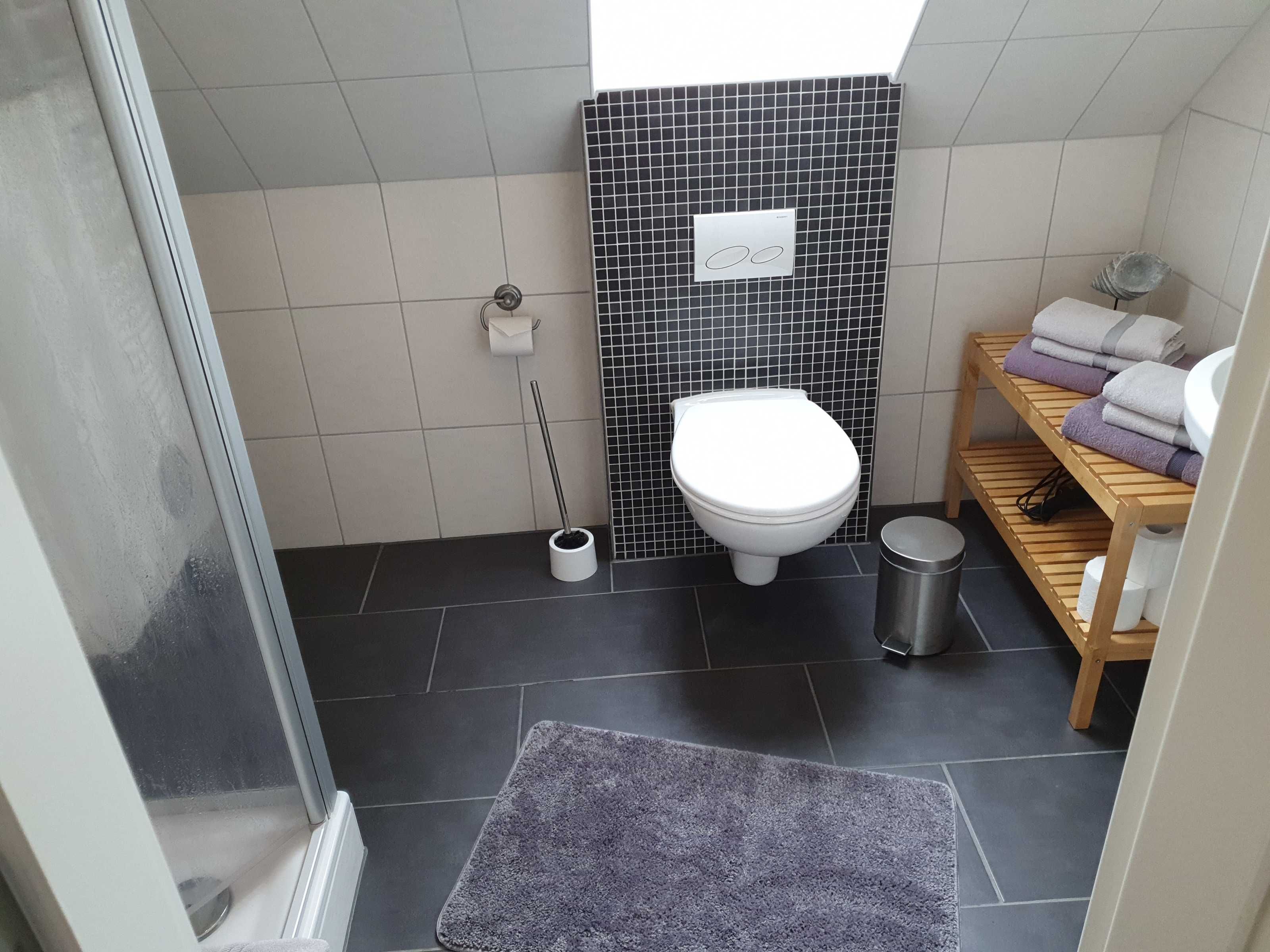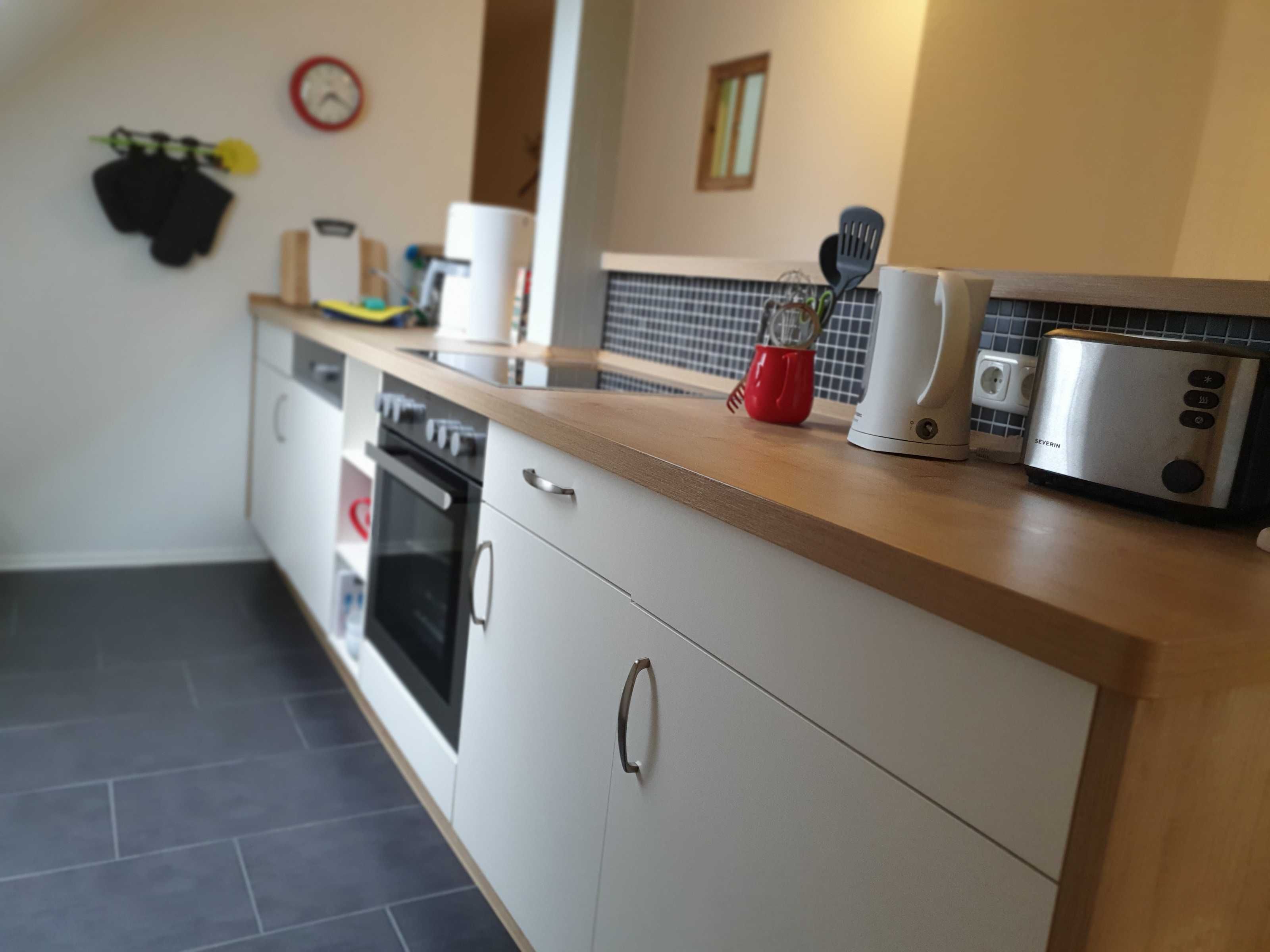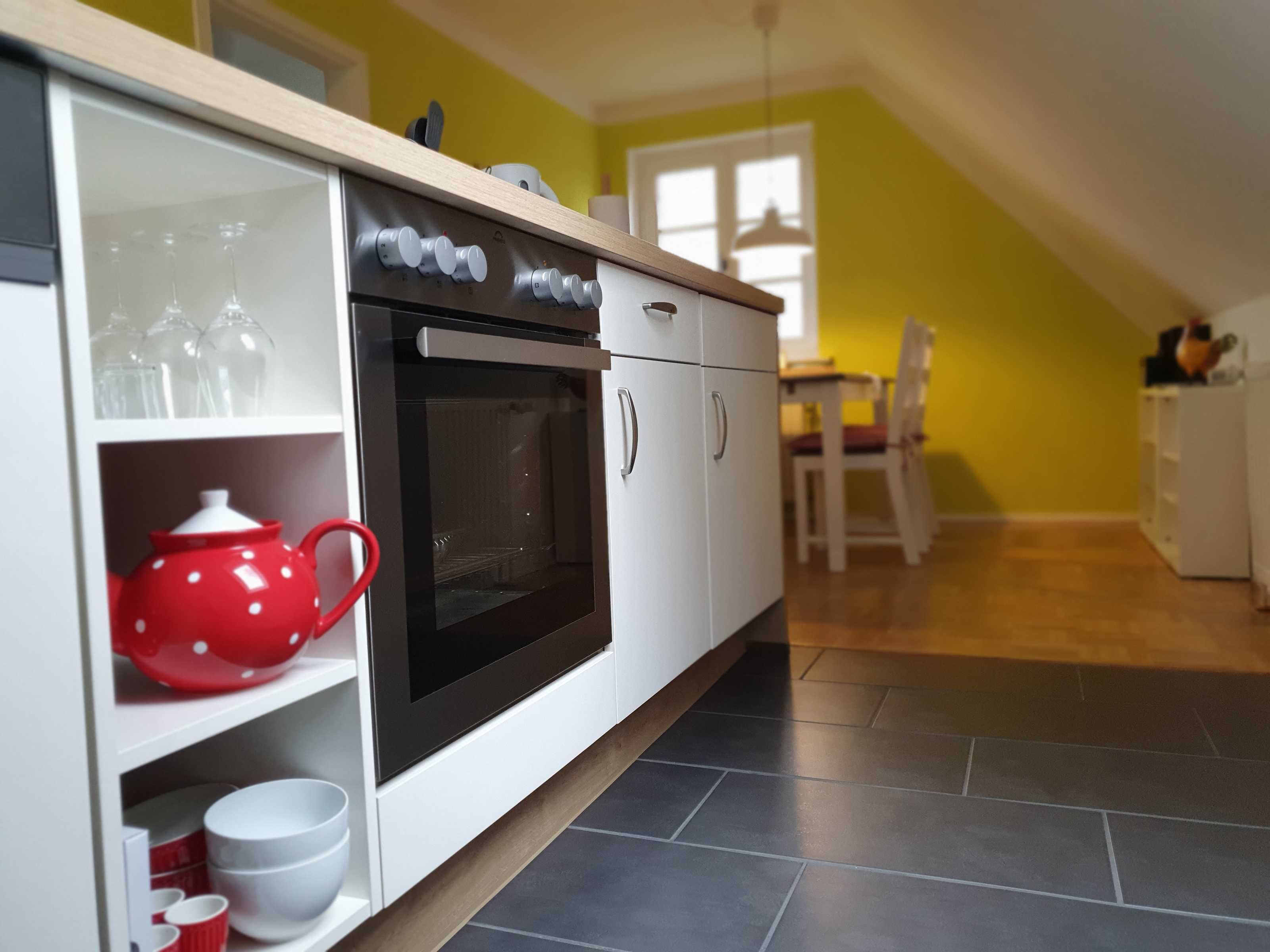 Separates Schlaf- und Wohnzimmer, offene Küche (mit Spülmaschine) mit Essbereich, Duschbad (mit Fön) mit Tageslicht. Die Wohnung befindet sich im Dachgeschoss (1. Stock) über dem Haupthaus.