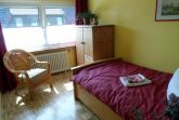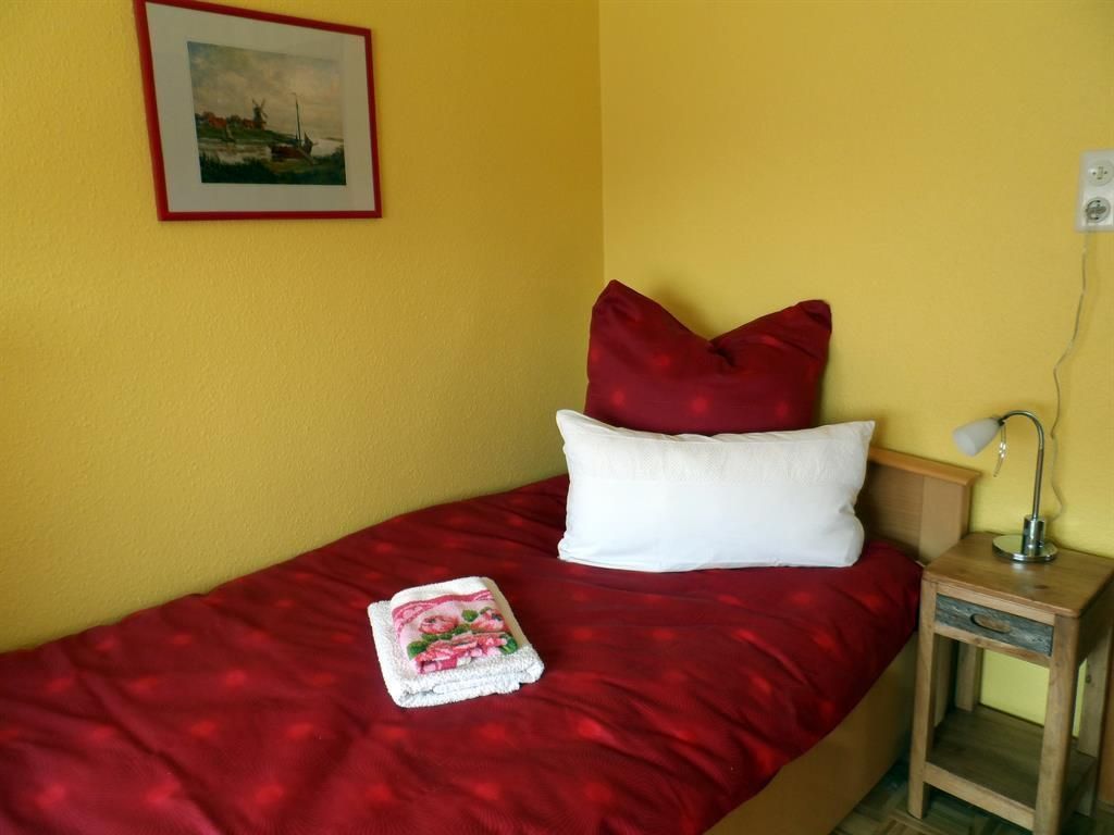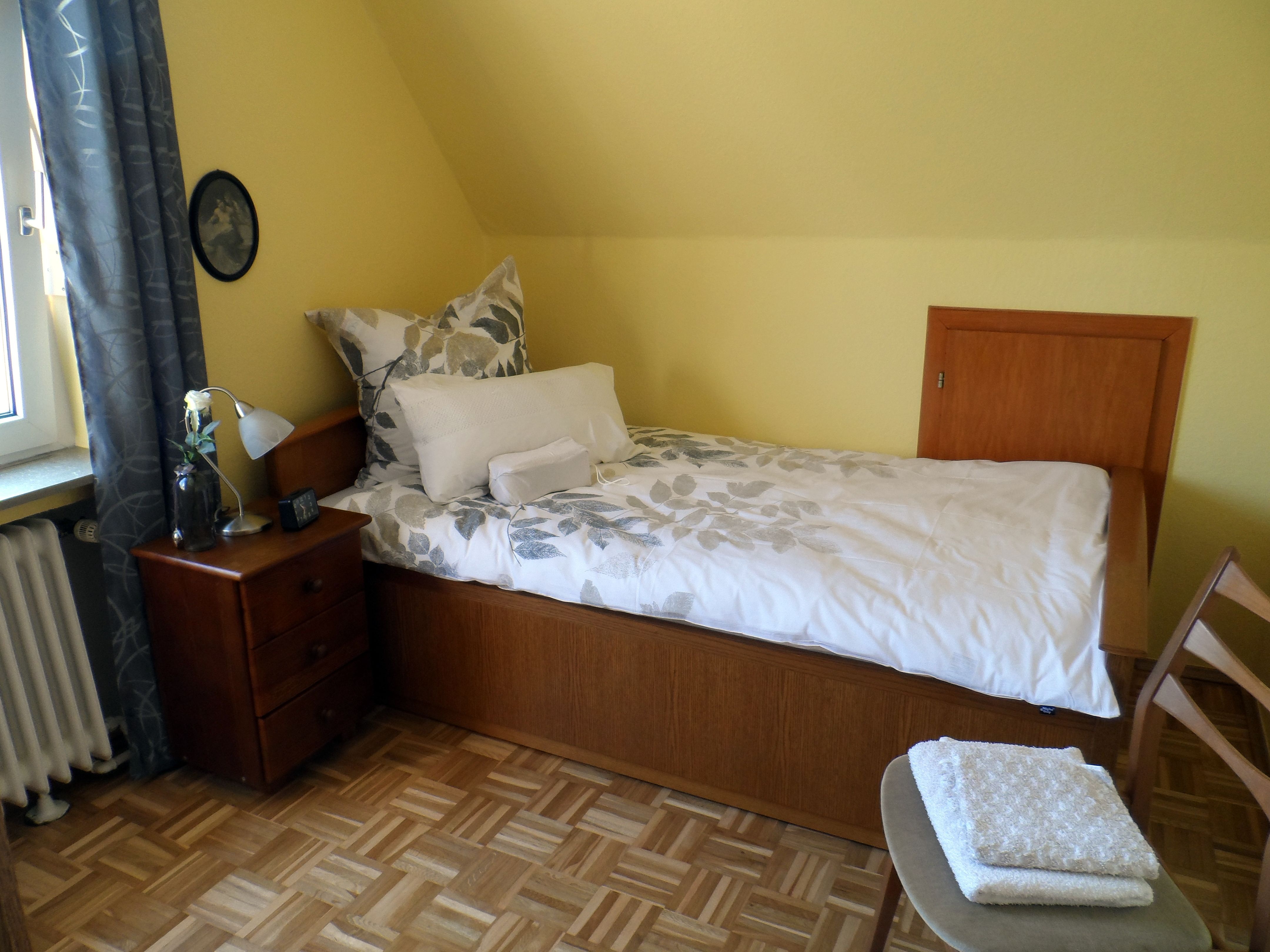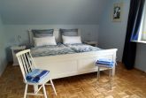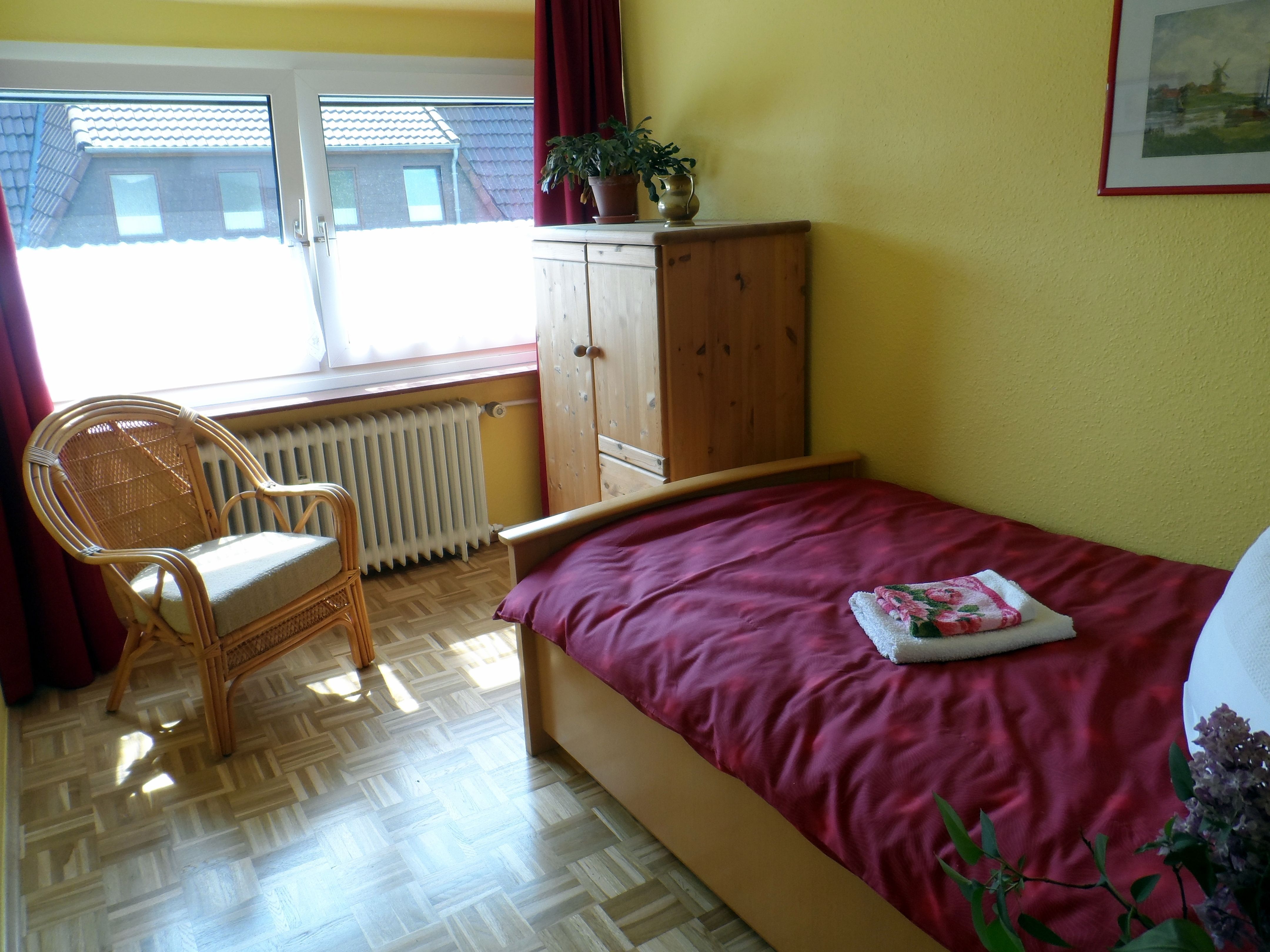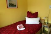 Das Obergschoß vefügt über einen großzüzigen Flur, ein Badezimmer mit Dusche und Toilette sowie drei Schlafräume. Aus dem großen, mit einem Doppelbett und Spiegelschrank ausgestatteten Zimmer, schaut man in den nach Süden gelegenen Garten. zwei kleinere Zimmer mit jeweils einem Einzelbett, Nachttisch , Schrank und Stuhl befinden sich einmal mit Blick nach vorne und auf der Ostseite des Hauses.