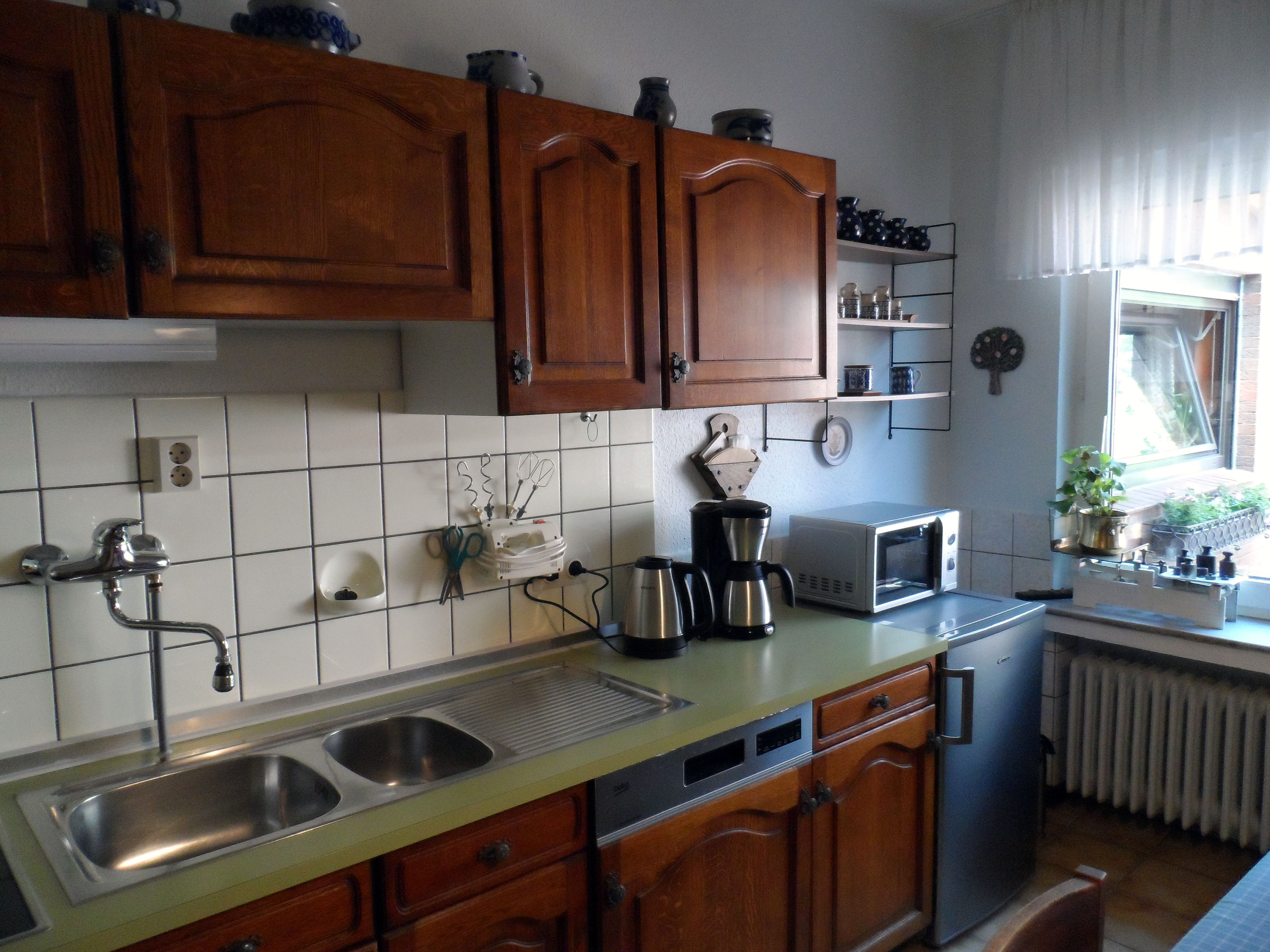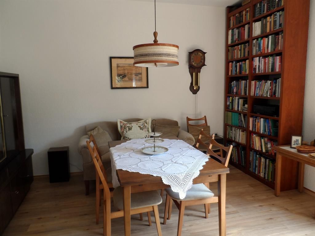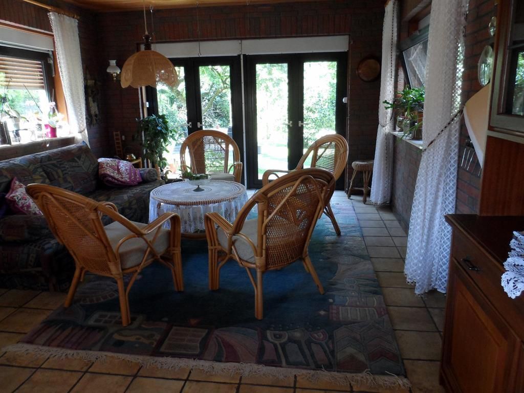 Im Erdgeschoß des Hauses befindet sich die große, gut ausgestattete Wohnküche mit Kühlschrank, Ceranfeld, Backofen, Mikrowelle, Kaffeemaschine, Wasserkocher, Mixer, Toaster, elektrischer Saftpresse und vielem mehr. Am großen Tisch mit Blick in den Garten oder draußen in der angrenzenden übderdachten Sitzecke kann man sein Essen genießen. Vorräte finden in der Speisekammer Platz. Neben der Diele mit Aufgang in die obere Etage befindet sich das große Wohnzimmer mit Essecke, Sitzecke und angrenzendem Wintergarten mit Sitzecke und Schlafcouch. Bei schlechtem Wetter kann man im Wohnzimmer fernsehen, Musik hören oder im großen Bücherregal stöbern. Im Erdgeschoß befindet sich eine Gästetoilette.