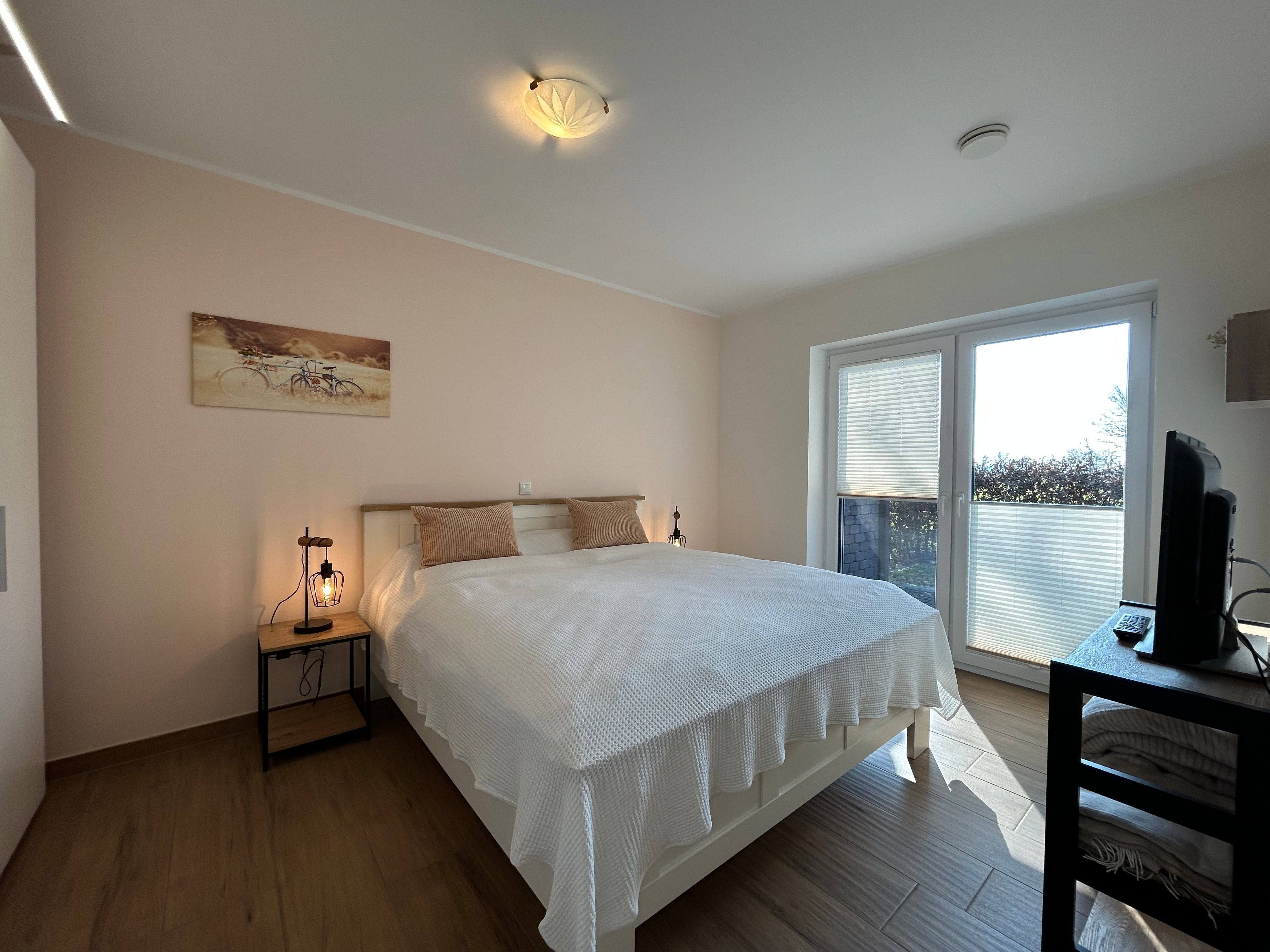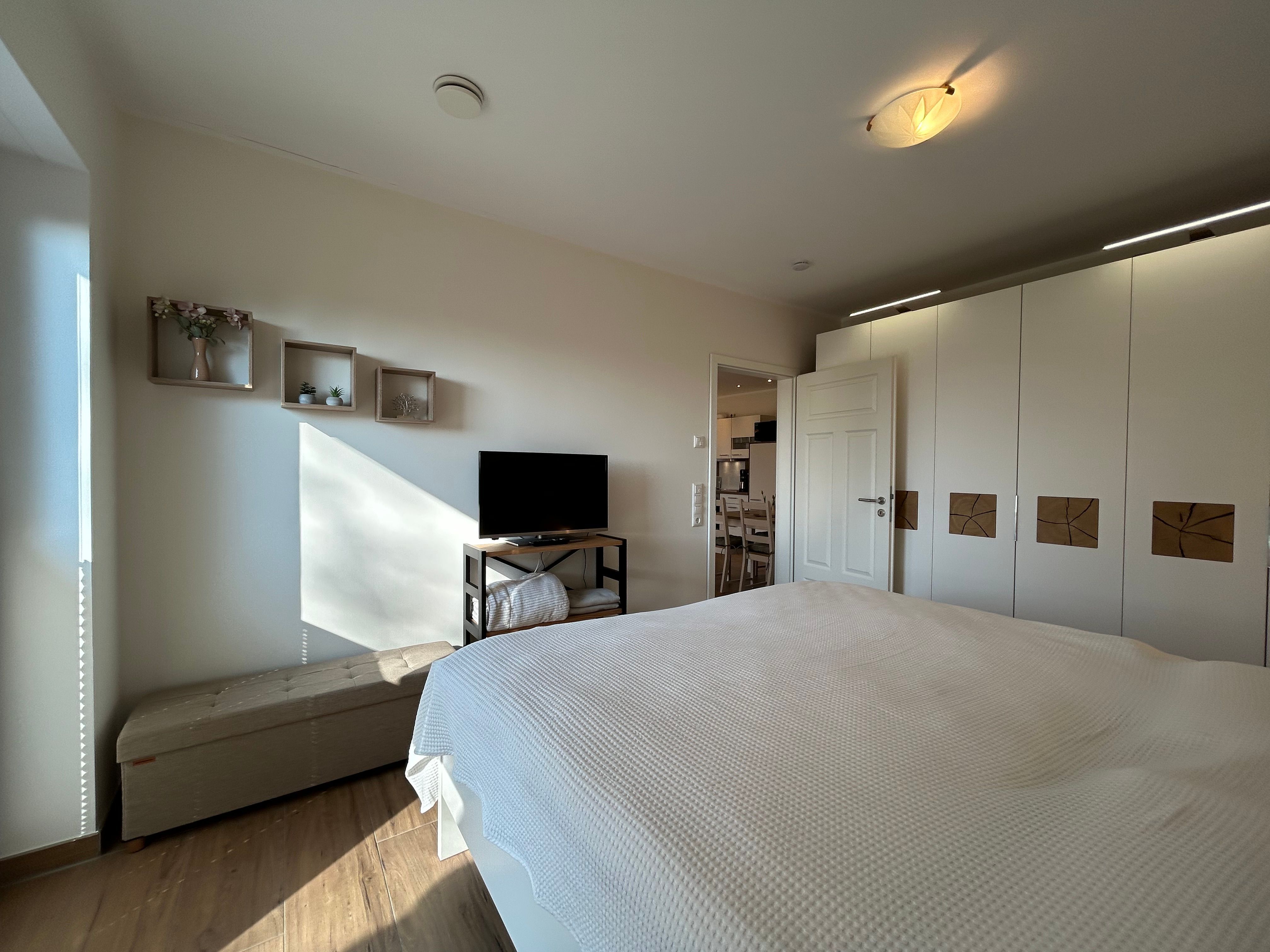 Das Schlafzimmer ist mit einem komfortablen Doppelbett 180 cm x 200 cm und einem zweiten TV
